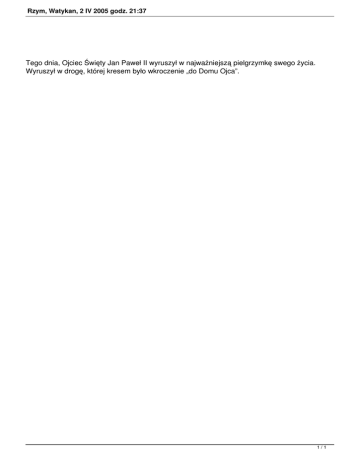 Rzym, Watykan, 2 IV 2005 godz. 21:37 Tego dnia, Ojciec Święty Jan Paweł II wyruszył w najważniejszą pielgrzymkę swego życia. Wyruszył w drogę, której kresem było wkroczenie „do Domu Ojca”. 1/1