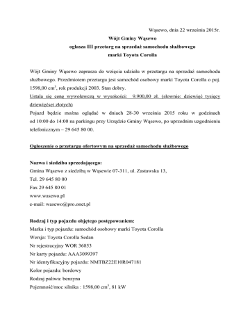 Wąsewo, dnia 22 września 2015r. Wójt Gminy Wąsewo ogłasza III przetarg na sprzedaż samochodu służbowego marki Toyota Corolla Wójt Gminy Wąsewo zaprasza do wzięcia udziału w przetargu na sprzedaż samochodu służbowego. Przedmiotem przetargu jest samochód osobowy marki Toyota Corolla o poj. 1598,00 cm3, rok produkcji 2003. Stan dobry. Ustala się cenę wywoławczą w wysokości: 9.900,00 zł. (słownie: dziewięć tysięcy dziewięćset złotych) Pojazd będzie można oglądać w dniach 28-30 września 2015 roku w godzinach od 10:00 do 14:00 na parkingu przy Urzędzie Gminy Wąsewo, po uprzednim uzgodnieniu telefonicznym – 29 645 80 00. Ogłoszenie o przetargu ofertowym na sprzedaż samochodu służbowego Nazwa i siedziba sprzedającego: Gmina Wąsewo z siedzibą w Wąsewie 07-311, ul. Zastawska 13, Tel. 29 645 80 00 Fax 29 645 80 01 www.wasewo.pl e-mail: [email protected] Rodzaj i typ pojazdu objętego postępowaniem: Marka i typ pojazdu: samochód osobowy marki Toyota Corolla Wersja: Toyota Corolla Sedan Nr rejestracyjny WOR 36853 Nr karty pojazdu: AAA3099397 Nr identyfikacyjny pojazdu: NMTBZ22E10R047181 Kolor pojazdu: bordowy Rodzaj paliwa: benzyna Pojemność/moc silnika : 1598,00 cm3, 81 kW Rok produkcji: 2003 Rodzaj nadwozia: 5 drzwiowy 5 osobowy Data pierwszej rejestracji: 22.12.2003 Przebieg w km: 307800 na dzień 21.09.2015r. Badanie techniczne ważne do: 12.12.2015 r. Pojazd przeznaczony do sprzedaży jest w dobrym stanie technicznym, posiadający niezbędny przegląd techniczny. Na wyposażeniu znajdują się 2 pary kluczyków, automatycznie otwierane przednie szyby, dwie poduszki powietrzne. Wymagania jakim powinna odpowiadać oferta w prowadzonym postępowaniu: Oferta pod rygorem nieważności, powinna być sporządzona w formie pisemnej i musi zawierać następujące dane oferenta: 1. imię i nazwisko lub nazwę firmy, 2. adres siedziby oferenta, 3. numer telefonu, 4. numer PESEL i NIP oraz w przypadku firm numer REGON, 5. datę sporządzenia oferty, 6. oferowaną cenę brutto, 7. oświadczenie oferenta, że zapoznał się ze stanem technicznym pojazdu i warunkami przetargu. Cena wywoławcza samochodu Cenę wywoławczą ustalono w wysokości 9 900,00 zł. (słownie: dziewięć tysięcy dziewięćset złotych 00/100). Przystępujący do postępowania winni okazać się dowodem wpłacenia wadium w wysokości 10% ceny wywoławczej pojazdu, co stanowi 990,00 zł. (słownie: dziewięćset dziewięćdziesiąt złotych 00/100) Wadium należy wpłacić najpóźniej do dnia 06.10.2015 r., do godz. 900 na konto Urzędu Gminy Wąsewo, BS Wąsewo nr 37 8930 0004 0000 0837 2000 0320 Wadium wpłacone przez oferenta, który wygrał przetarg zostanie zaliczone na poczet ceny nabycia samochodu. Wadium złożone przez oferentów, których oferty nie zostaną wybrane lub zostaną odrzucone, zostanie zwrócone niezwłocznie po dokonaniu wyboru oferty, a oferentowi, którego oferta została przyjęta – zostanie zaliczone na poczet ceny. Wadium nie podlega zwrotowi w przypadku, gdy uczestnik przetargu, który wygrał przetarg, uchyla się od zawarcia umowy. Termin, miejsce i tryb złożenia oferty: Ofertę należy złożyć w zamkniętej kopercie, adresowanej według wzoru: Urząd Gminy Wąsewo ul. Zastawska 13 07-311 Wąsewo „Oferta na zakup samochodu Toyota Corolla” Ofertę należy przesłać pod wskazany adres lub złożyć w Urzędzie Gminy w Wąsewie ul. Zastawska 13, 07-311 Wąsewo (Sekretariat) Ostateczny termin składania ofert ustala się na dzień 6 października 2015 roku do godziny 11:30 Oferty złożone po wyznaczonej dacie nie będą rozpatrywane. W przypadku złożenia równorzędnych ofert o najwyższej wartości, komisja przetargowa zorganizuje dodatkowy przetarg ustny dla oferentów, którzy złożyli te oferty. Komisja zawiadomi oferentów, o których mowa o terminie dodatkowego przetargu. Miejsce i termin przeprowadzenia postępowania: Otwarcie ofert nastąpi przez komisję przetargową w dniu 6 października 2015 roku o godz. 13:00, w sali konferencyjnej w Urzędzie Gminy Wąsewo ul. Zastawska 13, 07-311 Wąsewo Termin związania ofertą sprzedaży określa się na 14 dni. Miejsce i termin, którym można obejrzeć przedmiot postępowania: Urząd Gminy Wąsewo ul. Zastawska 13, 07-311 Wąsewo Pojazd będzie udostępniony zainteresowanym w dniach 28-30 września 2015 roku od 10:00 do 14:00 Osoba do kontaktu: Anna Jasińska tel. 29 645 80 00 wew. 26 Organizatorowi postępowania przysługuje prawo zamknięcia postępowania bez wybrania którejkolwiek z ofert, bez podania przyczyn. Inne informacje: 1. Komisja postępowania wybierze oferenta, który zaoferuje najwyższą cenę na pojazd będący przedmiotem sprzedaży. 2. Data podpisania umowy kupna-sprzedaży zostanie wyznaczona niezwłocznie po pozytywnym zakończeniu postępowania. 3. Nabywca jest zobowiązany zapłacić cenę nabycia samochodu przelewem na rachunek bankowy w BS Wąsewo nr 65 8930 0004 0000 0837 2000 0010 niezwłocznie po wybraniu jego oferty jako najkorzystniejszej, w terminie nie dłuższym niż 7 dni, a najpóźniej w dniu podpisania umowy. 4. W przypadku nie wpłacenia oferowanej kwoty w terminie o którym mowa w pkt 3 Sprzedający zastrzega możliwość odstąpienia od zawarcia umowy i wyboru kolejnej oferty z najwyższą ceną lub rozpisania nowej oferty na sprzedaż. 5. Wydanie przedmiotu sprzedaży nabywcy nastąpi niezwłocznie po zapłaceniu ceny nabycia i podpisaniu umowy kupna-sprzedaży. 6. Wszystkie koszty związane z nabyciem przedmiotu sprzedaży ponosi w całości Nabywca. Wykaz załączników: 1. Oferta na zakup samochodu Toyota Corolla 2. Wzór umowy