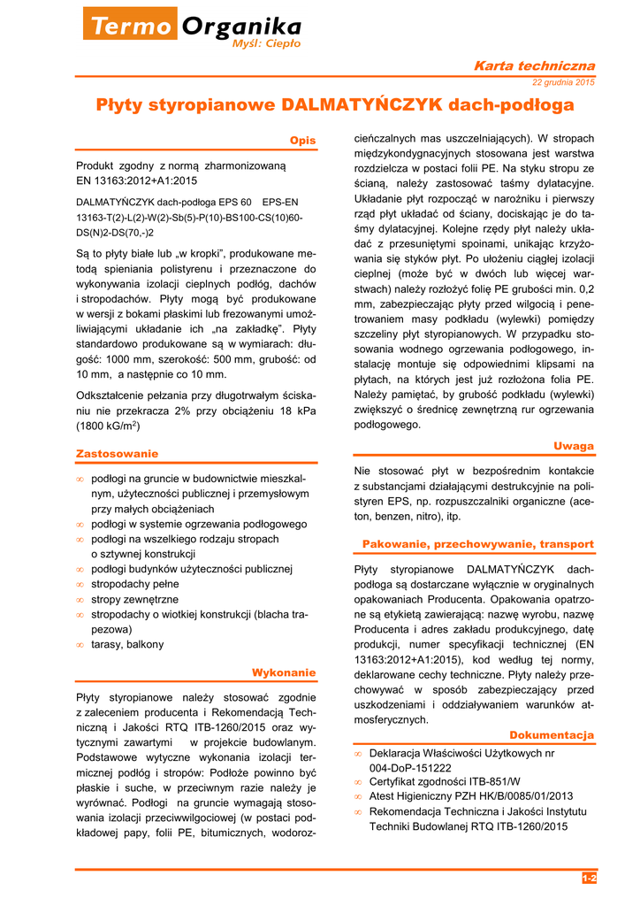 Karta techniczna 22 grudnia 2015 Płyty styropianowe DALMATYŃCZYK dach-podłoga Opis Produkt zgodny z normą zharmonizowaną EN 13163:2012+A1:2015 DALMATYŃCZYK dach-podłoga EPS 60 EPS-EN 13163-T(2)-L(2)-W(2)-Sb(5)-P(10)-BS100-CS(10)60DS(N)2-DS(70,-)2 Są to płyty białe lub „w kropki”, produkowane metodą spieniania polistyrenu i przeznaczone do wykonywania izolacji cieplnych podłóg, dachów i stropodachów. Płyty mogą być produkowane w wersji z bokami płaskimi lub frezowanymi umożliwiającymi układanie ich „na zakładkę”. Płyty standardowo produkowane są w wymiarach: długość: 1000 mm, szerokość: 500 mm, grubość: od 10 mm, a następnie co 10 mm. Odkształcenie pełzania przy długotrwałym ściskaniu nie przekracza 2% przy obciążeniu 18 kPa (1800 kG/m2) cieńczalnych mas uszczelniających). W stropach międzykondygnacyjnych stosowana jest warstwa rozdzielcza w postaci folii PE. Na styku stropu ze ścianą, należy zastosować taśmy dylatacyjne. Układanie płyt rozpocząć w narożniku i pierwszy rząd płyt układać od ściany, dociskając je do taśmy dylatacyjnej. Kolejne rzędy płyt należy układać z przesuniętymi spoinami, unikając krzyżowania się styków płyt. Po ułożeniu ciągłej izolacji cieplnej (może być w dwóch lub więcej warstwach) należy rozłożyć folię PE grubości min. 0,2 mm, zabezpieczając płyty przed wilgocią i penetrowaniem masy podkładu (wylewki) pomiędzy szczeliny płyt styropianowych. W przypadku stosowania wodnego ogrzewania podłogowego, instalację montuje się odpowiednimi klipsami na płytach, na których jest już rozłożona folia PE. Należy pamiętać, by grubość podkładu (wylewki) zwiększyć o średnicę zewnętrzną rur ogrzewania podłogowego. Uwaga Zastosowanie • podłogi na gruncie w budownictwie mieszkalnym, użyteczności publicznej i przemysłowym przy małych obciążeniach • podłogi w systemie ogrzewania podłogowego • podłogi na wszelkiego rodzaju stropach o sztywnej konstrukcji • podłogi budynków użyteczności publicznej • stropodachy pełne • stropy zewnętrzne • stropodachy o wiotkiej konstrukcji (blacha trapezowa) • tarasy, balkony Wykonanie Płyty styropianowe należy stosować zgodnie z zaleceniem producenta i Rekomendacją Techniczną i Jakości RTQ ITB-1260/2015 oraz wytycznymi zawartymi w projekcie budowlanym. Podstawowe wytyczne wykonania izolacji termicznej podłóg i stropów: Podłoże powinno być płaskie i suche, w przeciwnym razie należy je wyrównać. Podłogi na gruncie wymagają stosowania izolacji przeciwwilgociowej (w postaci podkładowej papy, folii PE, bitumicznych, wodoroz- Nie stosować płyt w bezpośrednim kontakcie z substancjami działającymi destrukcyjnie na polistyren EPS, np. rozpuszczalniki organiczne (aceton, benzen, nitro), itp. Pakowanie, przechowywanie, transport Płyty styropianowe DALMATYŃCZYK dachpodłoga są dostarczane wyłącznie w oryginalnych opakowaniach Producenta. Opakowania opatrzone są etykietą zawierającą: nazwę wyrobu, nazwę Producenta i adres zakładu produkcyjnego, datę produkcji, numer specyfikacji technicznej (EN 13163:2012+A1:2015), kod według tej normy, deklarowane cechy techniczne. Płyty należy przechowywać w sposób zabezpieczający przed uszkodzeniami i oddziaływaniem warunków atmosferycznych. Dokumentacja • Deklaracja Właściwości Użytkowych nr 004-DoP-151222 • Certyfikat zgodności ITB-851/W • Atest Higieniczny PZH HK/B/0085/01/2013 • Rekomendacja Techniczna i Jakości Instytutu Techniki Budowlanej RTQ ITB-1260/2015 1-2 Karta techniczna Styropian poddany dobrowolnej procedurze certyfikacji i rekomendacji w ITB nie wynikającej z systemu oceny i weryfikacji stałości właściwości użytkowych. Właściwości płyt styropianowych DALMATYŃCZYK dach-podłoga Właściwości klasa lub poziom Klasy tolerancji wymiarów: • grubość • długość • szerokość • prostokątność • płaskość T(2) L(2) W(2) Sb(5) P(10) Poziom wytrzymałości na zginanie BS100 Naprężenie ściskające przy 10% odkształceniu względnym CS(10)60 ≥ 60 kPa Klasa stabilności wymiarowej w stałych, normalnych warunkach laboratoryjnych DS(N)2 Poziom stabilności wymiarowej w określonych warunkach temperatury i wilgotności (temp. 48 h, 70oC) DS(70,-)2 Deklarowany współczynnik przewodzenia ciepła λdekl. w temp. 10°C ± 2 mm ± 2 mm ± 2 mm ± 5 mm/m 10 mm ≥ 100 kPa ± 0,2% 2% 0,040 W/(m·K) Klasa reakcji na ogień E Wartości oporu cieplnego RD dla wybranych grubości płyt DALMATYŃCZYK dach-podłoga Grubość, mm 10 20 30 40 50 60 70 80 90 100 110 120 130 140 150 RD, m2K/W 0,25 0,50 0,75 1,00 1,25 1,50 1,75 2,00 2,25 2,50 2,75 3,00 3,25 3,50 3,75 Grubość, mm 160 170 180 190 200 210 220 230 240 250 260 270 280 290 300 RD, m2K/W 4,00 4,25 4,50 4,75 5,00 5,25 5,50 5,75 6,00 6,25 6,50 6,75 7,00 7,25 7,50 Ilość płyt w paczce, objętość paczek i powierzchnia w opakowaniu dla poszczególnych grubości płyt. Standardowy wymiar płyt DALMATYŃCZYK dach-podłoga: 1000 mm x 500 mm Grubość, mm 10 20 30 40 50 60 70 80 90 100 Ilość płyt w paczce (szt.) 60 30 20 15 12 10 8 7 6 6 110 120 5 5 130 140 4 4 150 160 4 3 170 180 200 3 3 3 Płyty gładkie Objętość paczki (m3) 0,300 0,300 0,300 0,300 0,300 0,300 0,280 0,280 0,270 0,300 0,275 0,30 0,260 0,280 0,300 0,240 0,255 0,270 0,300 Powierzchnia płyt w 30,00 15,00 10,00 7,50 6,00 5,00 4,00 3,50 3,00 3,00 2,50 2,50 2,00 2,00 2,00 1,50 1,50 1,50 1,50 paczce (m2) Płyty frezowane (m3) 0,284 0,284 0,284 0,265 0,265 0,256 0,284 0,260 0,284 0,246 0,265 0,284 0,227 0,241 0,256 0,284 Powierzchnia płyt w paczce (m2) 7,10 5,68 4,73 3,79 3,31 2,84 2,84 2,37 2,37 1,89 1,89 1,89 1,42 1,42 1,42 1,42 Objętość paczki Biura handlowe S Mielec: tel.: 17 773 91 57, fax: 17 773 91 51 Głogów: tel.: 76 835 71 20, fax: 76 835 71 40 Siedlce: tel.: 25 631 02 07, fax: 25 631 02 09 Rypin: tel.: 54 233 95 39, fax: 54 233 93 88 Termo Organika Sp. z o.o. ul. 