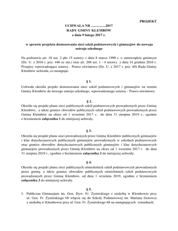 PROJEKT UCHWAŁA NR ................2017 RADY GMINY KLEMBÓW z dnia 9 lutego 2017 r. w sprawie projektu dostosowania sieci szkół podstawowych i gimnazjów do nowego ustroju szkolnego Na podstawie art. 18 ust. 2 pkt 15 ustawy z dnia 8 marca 1990 r. o samorządzie gminnym (Dz. U. z 2016 r. poz. 446 ze zm.) oraz art. 206 ust. 1 - 4 ustawy z dnia 14 grudnia 2016 r. Przepisy wprowadzające ustawę - Prawo oświatowe (Dz. U. z 2017 r. poz. 60) Rada Gminy Klembów uchwala, co następuje: § 1. Uchwała określa projekt dostosowania sieci szkół podstawowych i gimnazjów na terenie żminy Klembów do nowego ustroju szkolnego, wprowadzonego ustawą – Prawo oświatowe. § 2. Określa się projekt planu sieci publicznych szkół podstawowych prowadzonych przez żminę Klembów, a tak e granice obwodów publicznych szkół podstawowych prowadzonych przez żminę Klembów na okres od 1 września 2017 r. do dnia 31 sierpnia 2019 r., zgodnie z brzmieniem załącznika 1 do niniejszej uchwały. § 3. Określa się projekt planu sieci prowadzonych przez żminę Klembów publicznych gimnazjów i klas dotychczasowych publicznych gimnazjów prowadzonych w szkołach podstawowych oraz granice obwodów dotychczasowych publicznych gimnazjów i klas dotychczasowych gimnazjów prowadzonych przez żminę Klembów na okres od 1 września 2017 r. do dnia 31 sierpnia 2019 r., zgodnie z brzmieniem załącznika 2 do niniejszej uchwały. § 4. Określa się projekt planu sieci publicznych ośmioletnich szkół podstawowych prowadzonych przez gminę, a tak e granice obwodów publicznych ośmioletnich szkół podstawowych prowadzonych przez żminę Klembów, od dnia 1 września 2019, zgodnie z brzmieniem załącznika 3 do niniejszej uchwały. § 5. 1. Publiczne Gimnazjum im. Gen. Dyw. Żr. ymirskiego z siedzibą w Klembowie przy ul. żen. Żr. ymirskiego 68 włącza się do Szkoły Podstawowej im. Mariana Gotowca z siedzibą w Klembowie przy ul. żen. Żr. ymirskiego 68 na następujących warunkach: 1) ośmioletnia Szkoła Podstawowa im. Mariana Gotowca w Klembowie rozpocznie działalność z dniem 1 września 2017 roku; 2) kształcenie w klasie I ośmioletniej Szkoły Podstawowej im. Marian Gotowca w Klembowie rozpocznie się w roku szkolnym 2017/2018; 3) Publiczne Gimnazjum im żen. Dyw. Żr. ymirskiego w Klembowie zakończy działalność z dniem 31 sierpnia 2017 r. 2. Publiczne Gimnazjum w Ostrówku z siedzibą w Ostrówku przy ul. Warszawskiej 2 włącza się do Szkoły Podstawowej im. POW w Ostrówku z siedzibą w Ostrówku przy ulicy Warszawskiej 2 na następujących warunkach: 1) ośmioletnia Szkoła Podstawowa im. POW w Ostrówku rozpocznie działalność z dniem 1 września 2017 r. ; 2) kształcenie w klasie I ośmioletniej Szkoły Podstawowej im. POW w Ostrówku rozpocznie się w roku szkolnym 2017/2018; 3) Publiczne Gimnazjum w Ostrówku zakończy działalność z dniem 31 sierpnia 2017 r. § 6. Wykonanie uchwały powierza się Wójtowi żminy Klembów. § 7. Niniejsza uchwała podlega podaniu do publicznej wiadomości poprzez umieszczenie jej na tablicy ogłoszeń w siedzibie Urzędu żminy w Klembowie przy ul. żen. Żr. ymirskiego 38, a tak e w Biuletynie Informacji Publicznej żminy Klembów. Uchwała wchodzi w ycie z dniem podjęcia. § 8. UZASADNIENIE Projekt uchwały dotyczy projektu dostosowania sieci szkół podstawowych i gimnazjów, dla których organem prowadzącym jest żmina Klembów - do nowego ustroju szkolnego. Zgodnie z przepisami ustawy z dnia 14 grudnia 2016 roku Przepisy wprowadzające ustawę – Prawo oświatowe, Rada żminy podejmuje uchwałę w sprawie projektu dostosowania sieci szkół podstawowych i gimnazjów do nowego ustroju szkolnego. Projekt uchwały zakłada włączenie od dnia 1 września 2017 roku Publicznego żimnazjum im. żen. Dyw. Żr. ymirskiego w Klembowie do Szkoły Podstawowej w Klembowie, a Publicznego żimnazjum w Ostrówku do Szkoły Podstawowej im. POW w Ostrówku. Oznacza to, e wymienione gimnazja zakończą swoją działalność 31 sierpnia 2017 roku. Natomiast uczniowie klas II i III dotychczasowych gimnazjów w latach szkolnych 2017/2018 oraz 2018/2019 dokończą rozpoczętą edukację w ww. szkołach podstawowych. W projekcie uchwały przyjęto zachowanie dotychczasowej sieci szkół podstawowych i klas dotychczasowych gimnazjów. W zakresie określenia obwodów szkolnych dokonano sprostowania obwodu szkolnego SP Kusze i SP Wola Rasztowska. W projekcie uchwały miejscowość Roszczep została wpisana do obwodu SP Krusze (obecnie miejscowość ta figuruje zarówno w obwodzie szkolnym SP Wola Rasztowska jak i SP Krusze). Pozostałe obwody szkolne pozostawiono bez zmian. Załącznik nr 1 do Uchwały Nr ……..2017 Rady żminy Klembów z dnia 9 lutego 2017 r. Projekt planu sieci publicznych szkół podstawowych prowadzonych przez żminę Klembów, a tak e granice obwodów publicznych szkół podstawowych prowadzonych przez żminę Klembów, a tak e inne organy, na okres od dnia 1 września 2017r. do dnia 31 sierpnia 2019r. LP Nazwa szkoły Adres siedziby szkoły 1. Szkoła Podstawowa im. Janusza Korczaka w Dobczynie 2. Szkoła Podstawowa im. Mariana Gotowca w Klembowie Dobczyn ul. Mazowiecka 67 05-205 Klembów Klembów ul. Gen. Fr. ymirskiego 68 05-205 Klembów 3. Szkoła Podstawowa im. Jana Pawła II w Kruszu Szkoła Podstawowa im. POW w Ostrówku Krusze 34 05-240 Tłuszcz Ostrówek ul. Warszawska 2 05-205 Klembów 5. Szkoła Podstawowa w Starym Kraszewie 6. Szkoła Podstawowa im. Jana III Sobieskiego w Woli Rasztowskiej Stary Kraszew ul. Szkolna 5 05-205 Klembów Wola Rasztowska ul. Szkolna 9 05-205 Klembów 4. żranice obwodu szkoły na: rok szkolny 2017/2018 rok szkolny 2018/2019 miejscowości: Dobczyn, miejscowości: Dobczyn, Pasek, Nowy Kraszew Pasek, Nowy Kraszew miejscowości: Klembów, Michałów, Sitki, Pieńki, Ostrówek ( ta część miejscowości, która znajduje się na obszarze od linii kolejowej w stronę Klembowa) miejscowości: Krusze, Ros