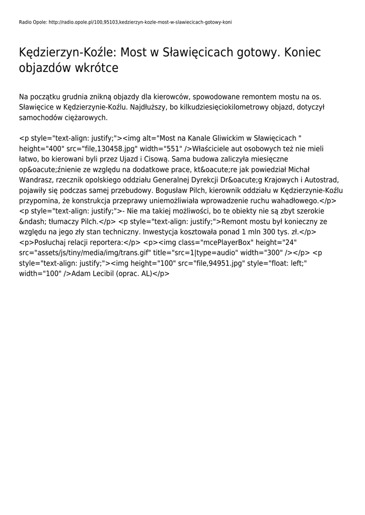 Radio Opole: http://radio.opole.pl/100,95103,kedzierzyn-kozle-most-w-slawiecicach-gotowy-koni Kędzierzyn-Koźle: Most w Sławięcicach gotowy. Koniec objazdów wkrótce Na początku grudnia znikną objazdy dla kierowców, spowodowane remontem mostu na os. Sławięcice w Kędzierzynie-Koźlu. Najdłuższy, bo kilkudziesięciokilometrowy objazd, dotyczył samochodów ciężarowych. <p style="text-align: justify;"><img alt="Most na Kanale Gliwickim w Sławięcicach " height="400" src="file,130458.jpg" width="551" />Właściciele aut osobowych też nie mieli łatwo, bo kierowani byli przez Ujazd i Cisową. Sama budowa zaliczyła miesięczne opóźnienie ze względu na dodatkowe prace, które jak powiedział Michał Wandrasz, rzecznik opolskiego oddziału Generalnej Dyrekcji Dróg Krajowych i Autostrad, pojawiły się podczas samej przebudowy. Bogusław Pilch, kierownik oddziału w Kędzierzynie-Koźlu przypomina, że konstrukcja przeprawy uniemożliwiała wprowadzenie ruchu wahadłowego.</p> <p style="text-align: justify;">- Nie ma takiej możliwości, bo te obiekty nie są zbyt szerokie – tłumaczy Pilch.</p> <p style="text-align: justify;">Remont mostu był konieczny ze względu na jego zły stan techniczny. Inwestycja kosztowała ponad 1 mln 300 tys. zł.</p> <p>Posłuchaj relacji reportera:</p> <p><img class="mcePlayerBox" height="24" src="assets/js/tiny/media/img/trans.gif" title="src=1|type=audio" width="300" /></p> <p style="text-align: justify;"><img height="100" src="file,94951.jpg" style="float: left;" width="100" />Adam Lecibil (oprac. AL)</p>