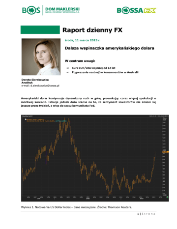 Raport dzienny FX środa, 11 marca 2015 r. Dalsza wspinaczka amerykańskiego dolara W centrum uwagi: • • Kurs EUR/USD najniżej od 12 lat Pogorszenie nastrojów konsumentów w Australii Dorota Sierakowska Analityk e-mail: [email protected] Amerykański dolar kontynuuje dynamiczny ruch w górę, prowokując coraz więcej spekulacji o możliwej korekcie. Istnieje jednak duża szansa na to, że sentyment inwestorów nie zmieni się jeszcze przez tydzień, a więc do czasu komunikatu Fed. Wykres 1. Notowania US Dollar Index – dane miesięczne. Źródło: Thomson Reuters. 1|Strona Kurs EUR/USD najniżej od 12 lat Notowania amerykańskiego dolara nie przerywają marszu w górę. US Dollar Index wczoraj zakończył sesję na poziomie 98,60 pkt., czyli na najwyższym poziomie od 2003 r. Dynamiczna zwyżka aż prosi się o korektę, jednak może to nastąpić nie prędzej niż za tydzień. Obecnie inwestorzy na rynku dolara żyją wyczekiwaniem na komunikat Fed, który ma pojawić się w przyszłą środę. Oczekiwania dotyczące retoryki Rezerwy Federalnej są duże – większość uczestników rynku spodziewa się co najmniej wykreślenia z komunikatu frazy o „cierpliwości”. Obecnie wielu inwestorów na rynku dolara gra właśnie pod taki scenariusz, dlatego dolar znajduje się pod presją kupujących. Taka sytuacja może się utrzymać jeszcze przez tydzień, a więc do czasu komunikatu. Co to oznaczałoby dla kursu EUR/USD, znajdującego się już na najniższym poziomie od wiosny 2003 r., a więc od 12 lat? Dalszy ruch spadkowy. Najbliższy poziom wsparcia można wyodrębnić w okolicach 1,054-1,055, zaś kolejne, już w rejonie 1,02 i 1,00. Duże oczekiwania dotyczące komunikatu Fed mogą być czynnikiem, który właśnie wtedy uruchomi korektę – na zasadzie „kupowania plotek i sprzedawania faktów”. Wykres 2. Notowania EUR/USD – dane tygodniowe. 2|Strona Pogorszenie nastrojów konsumentów w Australii Amerykański dolar jest silny nie tylko względem euro. Również notowania AUD/USD znajdują się na kilkuletnich minimach – kurs tej pary walutowej, obecnie delikatnie przekraczający 0,76, jest najniższy od 2009 r. Spadkowi wartości australijskiego dolara sprzyjały jednak także dane makroekonomiczne. Dzisiaj w nocy podano, że indeks zaufania konsumentów w Australii zanotował spadek o 1,2%. Tak czy inaczej, warto pamiętać, że w lutym wskaźnik ten osiągnął 13-miesięczne maksimum po obniżce stóp procentowych w Australii. Jutro w Australii pojawią się dane z rynku pracy, które również mogą wpływać na wartość tamtejszej waluty. Jednak tak czy inaczej, w kolejnych dniach notowania AUD/USD prawdopodobnie będą w większej mierze zależeć od tego, co będzie się działo z amerykańskim dolarem. Wykres 3. Notowania AUD/USD – dane dzienne. ---Prezentowany raport został przygotowany w Wydziale Doradztwa i Analiz Rynkowych Domu Maklerskiego Banku Ochrony Środowiska S.A. z siedzibą w Warszawie tylko i wyłącznie w celach informacyjnych i nie stanowi analizy inwestycyjnej, ani analizy finansowej ani rekomendacji w rozumieniu przepisów Rozporządzenia Ministra Finansów z dnia 19 października 2005r. (Dz.U. 2005, poz. 206 nr 1715) oraz Ustawy z dnia 29 lipca 2005r. (Dz.U. 2005, Nr 183, poz. 1538 z późn. zm.). Przedstawiony raport jest wyłącznie wyrazem wiedzy i poglądów autora według stanu na dzień sporządzenia i w żadnym wypadku nie może być podstawą działań inwestycyjnych Klienta. Przy sporządzaniu raportu DM BOŚ SA działał z należytą starannością oraz rzetelnością. DM BOŚ SA i jego pracownicy nie ponoszą jednak odpowiedzialności za działania lub zaniechania Klienta podjęte na podstawie niniejszego raportu ani za szkody poniesione w wyniku tych decyzji inwestycyjnych. Niniejszy raport adresowany jest do nieograniczonego kręgu odbiorców. Został sporządzony na potrzeby klientów DM BOŚ S.A. oraz innych osób zainteresowanych. Nadzór nad DM BOŚ SA sprawuje Komisja Nadzoru Finansowego. Regulaminy doradztwa inwestycyjnego i sporządzania analiz inwestycyjnych, analiz finansowych oraz innych rekomendacji o charakterze ogólnym dotyczących transakcji w zakresie instrumentów finansowych oraz instrumentów bazowych instrumentów pochodnych znajdują się na stronie internetowej bossa.pl w dziale Dokumenty. 3|Strona