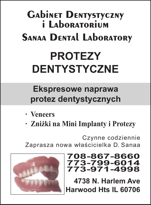 Gabinet Dentystyczny i Laboratorium Sanaa Dental Laboratory Protezy Dentystyczne Ekspresowe naprawa protez dentystycznych · Veneers · Zniżki na Mini Implanty i Protezy Czynne codziennie Zaprasza nowa właścicielka D. Sanaa 708-867-8660 773-799-6014 773-971-4998 4738 N. Harlem Ave Harwood Hts IL 60706