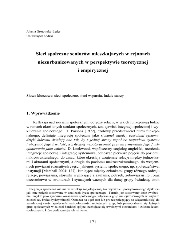 Jolanta Grotowska-Leder Uniwersytet Łódzki Sieci społeczne seniorów mieszkających w rejonach niezurbanizowanych w perspektywie teoretycznej i empirycznej Słowa kluczowe: sieci społeczne, sieci wsparcia, ludzie starzy 1. Wprowadzenie Refleksja nad sieciami społecznymi dotyczy relacji, w jakich funkcjonują ludzie w ramach określonych struktur społecznych, tzn. zjawisk integracji społecznej i wykluczenia społecznego1. T. Parsons [1972], czołowy przedstawiciel nurtu funkcjonalnego, definiuje integrację społeczną jako stosunek między częściami systemu, dzięki któremu działają one tak, by z jednej strony zapobiec rozpadowi systemu i utrzymać jego trwałość, a z drugiej współpracować przy utrzymywaniu jego funkcjonowania jako całości. D. Lockwood, współczesny socjolog angielski, rozróżnia integrację społeczną i integrację systemową, odnosząc pierwsze pojęcie do poziomu mikrostrukturalnego, do zasad, które określają wzajemne relacje między jednostkami i aktorami społecznymi, a drugie do poziomu makrostrukturalnego, do wzajemnych powiązań rozmaitych części jakiegoś systemu społecznego, np. społeczeństwa, instytucji [Marshall 2004: 127]. Istniejące między członkami grupy różnego rodzaju relacje, powiązania, stosunki wynikające z zaufania, potrzeb, zobowiązań itp., oraz uczestnictwo w strukturach i sytuacjach ważnych dla danej grupy świadczą, obok 1 Integracja społeczna nie ma w refleksji socjologicznej tak wyraźnie uporządkowanego dyskursu jak inne pojęcia stosowane w analizach życia społecznego. Termin jest stosowany dość swobodnie, zwykle jako synonim konsensusu społecznego, włączania grup mniejszościowych w większe całości czy braku dyskryminacji. Oznacza na ogół stan lub proces polegający na włączaniu (się) do zasadniczej części społeczeństwa/społeczności mniejszych grup, lub przeobrażeniu się luźnych grup społecznych w całości bardziej spójne, cechujące się trwalszymi stosunkami i zależnościami społecznymi, które podtrzymują ich istnienie. 171 tożsamości grupowej i satysfakcji z członkowstwa, o zintegrowaniu tej społecznej struktury. Zintegrowanie to na tyle ważna sfera życia społecznego, że jest elementem Oceny jakości życia2, która w odniesieniu do ludzi starych wyraźnie zyskuje na znaczeniu w badaniach naukowych. Analizy uczestnictwa społecznego ludzi w podeszłym wieku mają charakter interdyscyplinarny, są podejmowane na gruncie socjologii, gerontologii, pedagogiki, psychologii. Studia psychologiczne wskazują na związek między wysoką jakością życia ludzi starych a ich zadowoleniem i satysfakcjonującymi relacjami społecznymi w jakich uczestniczą [Jones i in., 2003: 3-18]. Badania socjologiczne ujawniają od dawna, że dla ludzi w podeszłym wieku charakterystyczna jest strukturalna izolacja od więzi zawodowych, rodzinnych i lokalnych [Parsons, 1972: 38], że cechuje ich wycofywanie się z dotychczasowych ról społecznych i form uczestnictwa społecznego [Niezabitowski, 2007: 92-120], i w konsekwencji wykluczenie z głównych nurtów życia społecznego [Szatur-Jaworska, 2005]. Zjawiska integracji społecznej obejmują stany istnienia – a w dynamicznej postaci włączania lub wyłączania – jednostek w ramach określonej zbiorowości. Bycie członkiem określonej grupy społecznej dowodzi, że pozostaje się z pozostałymi jej członkami w określonych relacjach definiowanych w kategoriach więzi społecznej. Zjawiska te analizuje się z zastosowaniem teoretycznej perspektywy inkluzji/wykluczenia społecznego, koncentrując uwagę na procesach istnienia/zaniku więzi społecznej w ramach różnych struktur społecznych, z których trzy (rodzina, przyjaciele i środowisko zawodowe) uznawane są za podstawowe obszary funkcjonowania człowieka. Z tego punktu widzenia warto przywołać refleksję na temat wykluczenia społecznego S. Paugama i R. Castela, którzy – czyniąc punktem wyjścia założenie o integracji jednostki z systemem społecznym i uznając w analizie inkluzji społecznej za ważne dwie sfery funkcjonowania człowieka: zatrudnienie i zakorzenienie społeczne w rozumieniu kontaktów rodzinnych i przyjacielskich – zajmują się procesami wykluczenia. Stopniową utratę więzi ze społecznymi strukturami pierwszy z autorów nazywa procesem "dyskwalifikacji społecznej", zaś drugi "dezafiliacji", przy czym każdy z procesów obejmuje trzy powiązane następujące po sobie stadia. Mechanizm "dywersyfikacji społecznej" [Paugam, 1993, 1991] ma zastosowanie w refleksji nad funkcjonowanie osób w podeszłym wieku, ponieważ oznacza przechodzenie od stabilnej, pełnoetatowej pracy do zatrudnienia częściowego lub wycofania z rynku pracy, z zachowaniem przez jednostkę w pierwszym etapie kontaktów we wszystkich innych strukturach, w drugim etapie ma miejsce uzależnienie od pomocy społecznej, co utrwala ekskluzję w sferze zatrudnienia, ale rodzinne, sąsiedzkie, przyjacielskie role społeczne są nadal pełnione, a w trzecim 2 Np. stosowany w analizach poziomu życia i satysfakcji życiowej w badaniach komparatystycznych Wskaźnik Jakości Życia (Quality of Life Index) obejmuje m.in. wskaźniki: życia rodzinnego definiowany przez wskaźnik rozwodów i życia wspólnotowego definiowany przez odsetek uczęszczających do kościoła. 172 etapie ma miejsce kompletne załamanie się więzi społecznych, jednostka "wypada" ze struktur zawodowych, przyjacielskich, rodzinnych. W procesie dezafiliacji [Pastel, 1991] trzystopniowy proces wykluczania to kontinuum sytuacji wynikających z przecięcia się dwóch wektorów życia – ekonomicznego i społecznego, tzn. sytuacji zawodowej człowieka przebiegającej od integracji, tzn. stabilnego zatrudnienia, poprzez niepewne, dorywcze lub sezonowe prace do całkowitej utraty zatrudnienia z powodu bezrobocia lub przejścia na rentę lub emeryturę, i sytuacji społecznej przebiegającej od uczestnictwa w