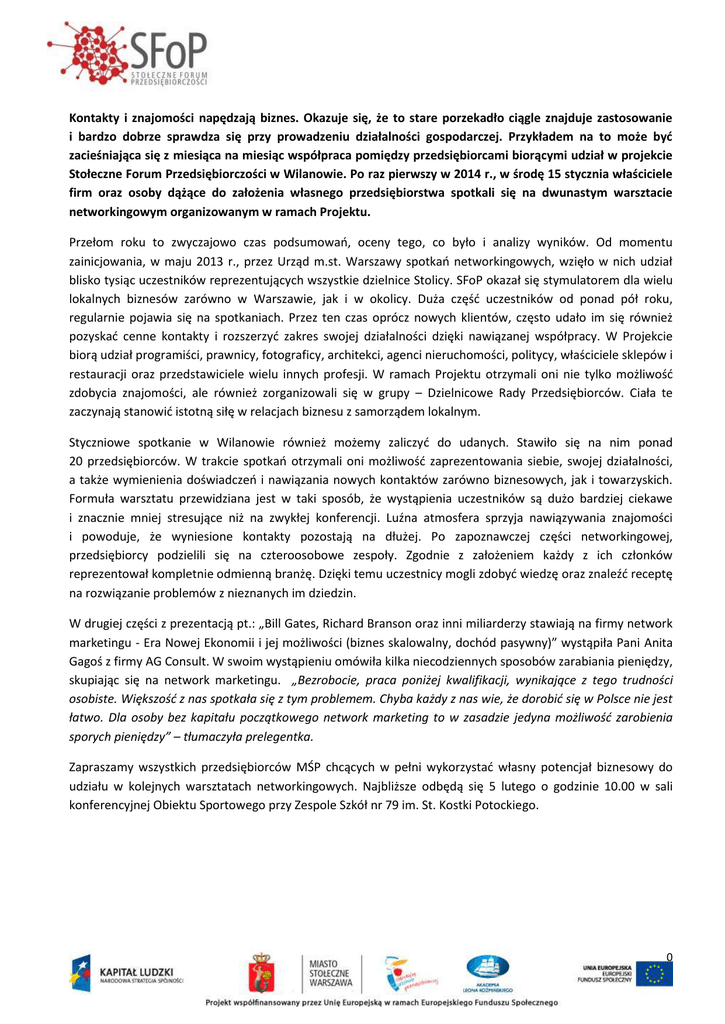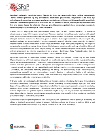 Kontakty i znajomości napędzają biznes. Okazuje się, że to stare porzekadło ciągle znajduje zastosowanie i bardzo dobrze sprawdza się przy prowadzeniu działalności gospodarczej. Przykładem na to może być zacieśniająca się z miesiąca na miesiąc współpraca pomiędzy przedsiębiorcami biorącymi udział w projekcie Stołeczne Forum Przedsiębiorczości w Wilanowie. Po raz pierwszy w 2014 r., w środę 15 stycznia właściciele firm oraz osoby dążące do założenia własnego przedsiębiorstwa spotkali się na dwunastym warsztacie networkingowym organizowanym w ramach Projektu. Przełom roku to zwyczajowo czas podsumowań, oceny tego, co było i analizy wyników. Od momentu zainicjowania, w maju 2013 r., przez Urząd m.st. Warszawy spotkań networkingowych, wzięło w nich udział blisko tysiąc uczestników reprezentujących wszystkie dzielnice Stolicy. SFoP okazał się stymulatorem dla wielu lokalnych biznesów zarówno w Warszawie, jak i w okolicy. Duża część uczestników od ponad pół roku, regularnie pojawia się na spotkaniach. Przez ten czas oprócz nowych klientów, często udało im się również pozyskać cenne kontakty i rozszerzyć zakres swojej działalności dzięki nawiązanej współpracy. W Projekcie biorą udział programiści, prawnicy, fotograficy, architekci, agenci nieruchomości, politycy, właściciele sklepów i restauracji oraz przedstawiciele wielu innych profesji. W ramach Projektu otrzymali oni nie tylko możliwość zdobycia znajomości, ale również zorganizowali się w grupy – Dzielnicowe Rady Przedsiębiorców. Ciała te zaczynają stanowić istotną siłę w relacjach biznesu z samorządem lokalnym. Styczniowe spotkanie w Wilanowie również możemy zaliczyć do udanych. Stawiło się na nim ponad 20 przedsiębiorców. W trakcie spotkań otrzymali oni możliwość zaprezentowania siebie, swojej działalności, a także wymienienia doświadczeń i nawiązania nowych kontaktów zarówno biznesowych, jak i towarzyskich. Formuła warsztatu przewidziana jest w taki sposób, że wystąpienia uczestników są dużo bardziej ciekawe i znacznie mniej stresujące niż na zwykłej konferencji. Luźna atmosfera sprzyja nawiązywania znajomości i powoduje, że wyniesione kontakty pozostają na dłużej. Po zapoznawczej części networkingowej, przedsiębiorcy podzielili się na czteroosobowe zespoły. Zgodnie z założeniem każdy z ich członków reprezentował kompletnie odmienną branżę. Dzięki temu uczestnicy mogli zdobyć wiedzę oraz znaleźć receptę na rozwiązanie problemów z nieznanych im dziedzin. W drugiej części z prezentacją pt.: „Bill Gates, Richard Branson oraz inni miliarderzy stawiają na firmy network marketingu - Era Nowej Ekonomii i jej możliwości (biznes skalowalny, dochód pasywny)” wystąpiła Pani Anita Gagoś z firmy AG Consult. W swoim wystąpieniu omówiła kilka niecodziennych sposobów zarabiania pieniędzy, skupiając się na network marketingu. „Bezrobocie, praca poniżej kwalifikacji, wynikające z tego trudności osobiste. Większość z nas spotkała się z tym problemem. Chyba każdy z nas wie, że dorobić się w Polsce nie jest łatwo. Dla osoby bez kapitału początkowego network marketing to w zasadzie jedyna możliwość zarobienia sporych pieniędzy” – tłumaczyła prelegentka. Zapraszamy wszystkich przedsiębiorców MŚP chcących w pełni wykorzystać własny potencjał biznesowy do udziału w kolejnych warsztatach networkingowych. Najbliższe odbędą się 5 lutego o godzinie 10.00 w sali konferencyjnej Obiektu Sportowego przy Zespole Szkół nr 79 im. St. Kostki Potockiego. 0