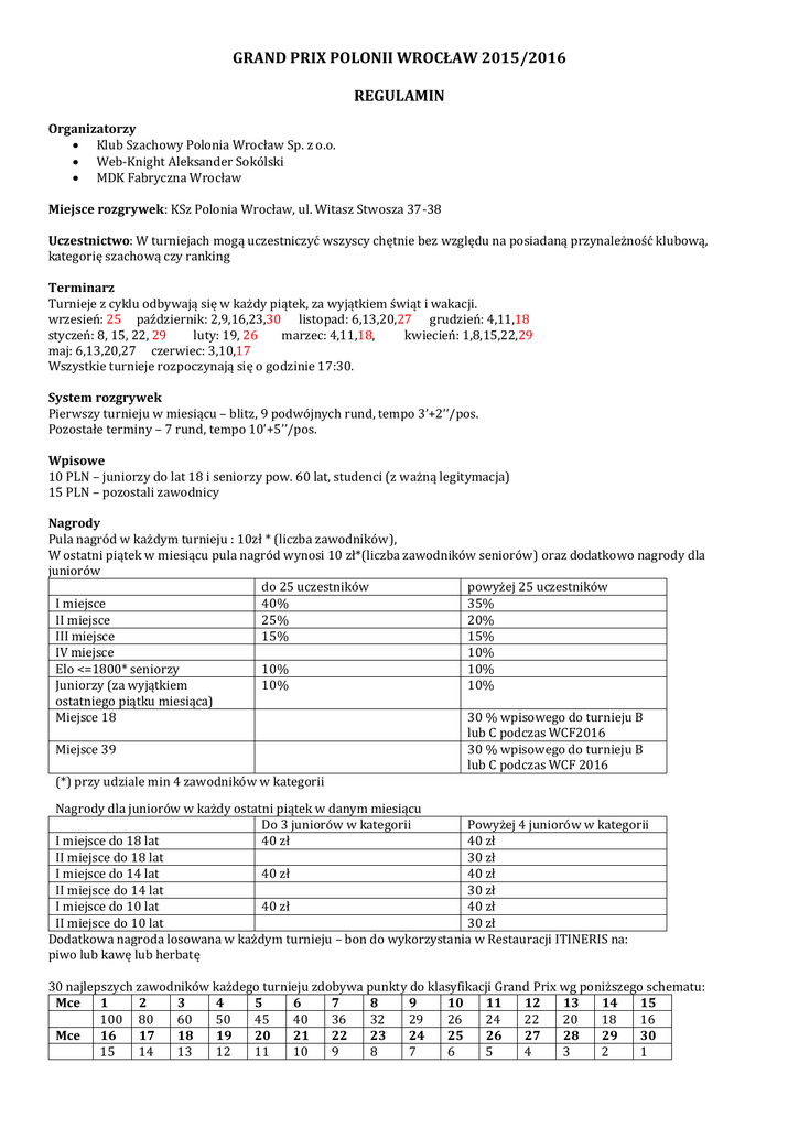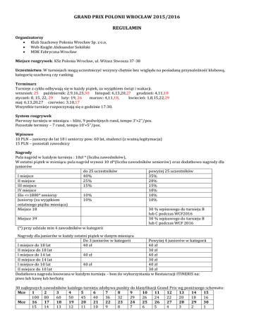 GRAND PRIX POLONII WROCŁAW 2015/2016 REGULAMIN Organizatorzy Klub Szachowy Polonia Wrocław Sp. z o.o. Web-Knight Aleksander Sokólski MDK Fabryczna Wrocław Miejsce rozgrywek: KSz Polonia Wrocław, ul. Witasz Stwosza 37-38 Uczestnictwo: W turniejach mogą uczestniczyć wszyscy chętnie bez względu na posiadaną przynależność klubową, kategorię szachową czy ranking Terminarz Turnieje z cyklu odbywają się w każdy piątek, za wyjątkiem świąt i wakacji. wrzesień: 25 październik: 2,9,16,23,30 listopad: 6,13,20,27 grudzień: 4,11,18 styczeń: 8, 15, 22, 29 luty: 19, 26 marzec: 4,11,18, kwiecień: 1,8,15,22,29 maj: 6,13,20,27 czerwiec: 3,10,17 Wszystkie turnieje rozpoczynają się o godzinie 17:30. System rozgrywek Pierwszy turnieju w miesiącu – blitz, 9 podwójnych rund, tempo 3’+2’’/pos. Pozostałe terminy – 7 rund, tempo 10’+5’’/pos. Wpisowe 10 PLN – juniorzy do lat 18 i seniorzy pow. 60 lat, studenci (z ważną legitymacja) 15 PLN – pozostali zawodnicy Nagrody Pula nagród w każdym turnieju : 10zł * (liczba zawodników), W ostatni piątek w miesiącu pula nagród wynosi 10 zł*(liczba zawodników seniorów) oraz dodatkowo nagrody dla juniorów do 25 uczestników powyżej 25 uczestników I miejsce 40% 35% II miejsce 25% 20% III miejsce 15% 15% IV miejsce 10% Elo <=1800* seniorzy 10% 10% Juniorzy (za wyjątkiem 10% 10% ostatniego piątku miesiąca) Miejsce 18 30 % wpisowego do turnieju B lub C podczas WCF2016 Miejsce 39 30 % wpisowego do turnieju B lub C podczas WCF 2016 (*) przy udziale min 4 zawodników w kategorii Nagrody dla juniorów w każdy ostatni piątek w danym miesiącu Do 3 juniorów w kategorii Powyżej 4 juniorów w kategorii I miejsce do 18 lat 40 zł 40 zł II miejsce do 18 lat 30 zł I miejsce do 14 lat 40 zł 40 zł II miejsce do 14 lat 30 zł I miejsce do 10 lat 40 zł 40 zł II miejsce do 10 lat 30 zł Dodatkowa nagroda losowana w każdym turnieju – bon do wykorzystania w Restauracji ITINERIS na: piwo lub kawę lub herbatę 30 najlepszych zawodników każdego turnieju zdobywa punkty do klasyfikacji Grand Prix wg poniższego schematu: Mce 1 2 3 4 5 6 7 8 9 10 11 12 13 14 15 100 80 60 50 45 40 36 32 29 26 24 22 20 18 16 Mce 16 17 18 19 20 21 22 23 24 25 26 27 28 29 30 15 14 13 12 11 10 9 8 7 6 5 4 3 2 1 Finał Grand Prix Na zakończenie cyklu Grand Prix odbędą są turnieje finałowe w grupach: Finał A - OPEN Finał B - zawodnicy z rankingiem ELO <= 1900 (decyduje średni ranking ze wszystkich turniejów w jakich zawodnik występował) Finał C - juniorzy do lat 18 W każdym z finałów prawo startu posiada 8 najlepszych zawodników w danej kategorii wg punktacji Grand Prix. Zawodnicy z dalszych miejsc są kolejnymi rezerwowymi. Turnieje finałowe rozgrywane są systemem kołowym. Numery startowe są nadawane zgodnie z zajętymi miejscami w całym cyklu. O miejscu w turnieju finałowym decyduje suma punktów zdobytych w finale, a punktacją pomocniczą jest ilość turniejów z cyklu w których zawodnik brał udział. Nagrody w turniejach finałowym zostaną podane w późniejszym terminie. Postanowienia końcowe Wszystkie turnieje z cyklu są zgłoszone do oceny rankingowej FIDE Obowiązują aktualne przepisy gry FIDE. Ostateczna interpretacja regulaminu należy do organizatora.