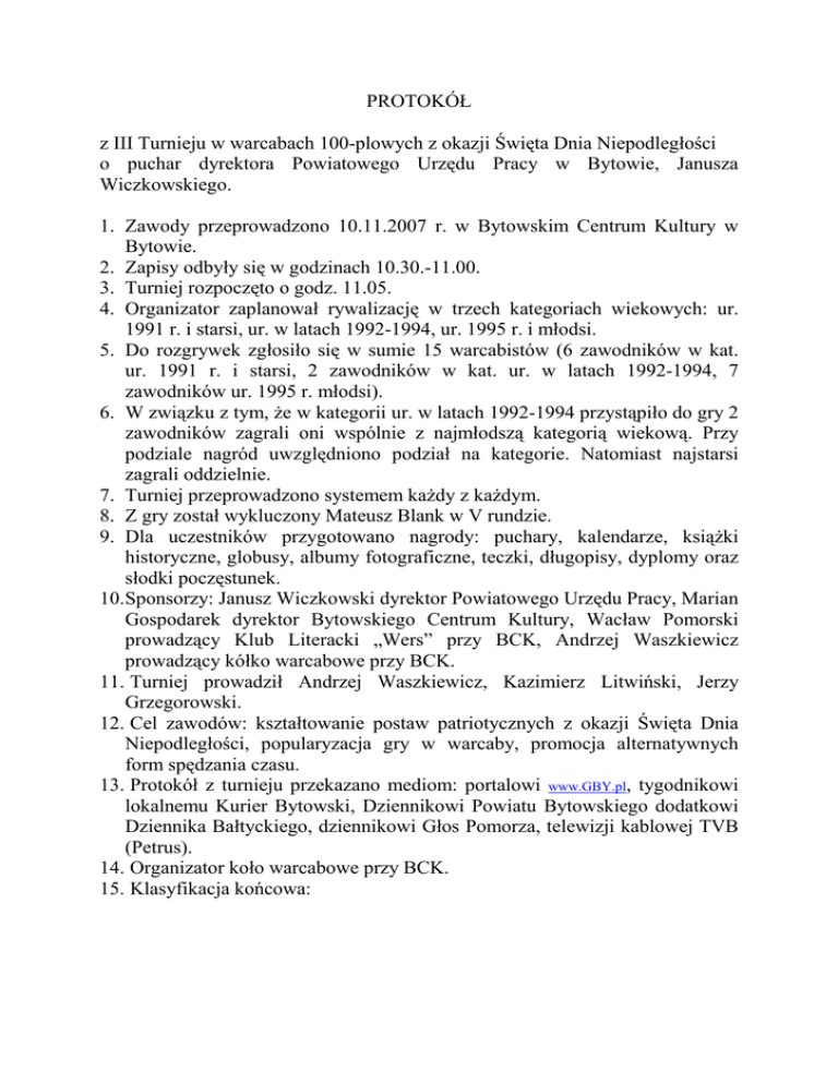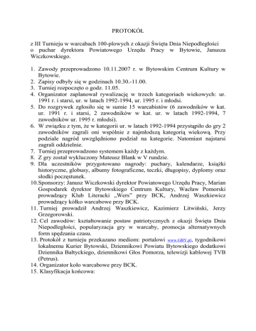 PROTOKÓŁ z III Turnieju w warcabach 100-plowych z okazji Święta Dnia Niepodległości o puchar dyrektora Powiatowego Urzędu Pracy w Bytowie, Janusza Wiczkowskiego. 1. Zawody przeprowadzono 10.11.2007 r. w Bytowskim Centrum Kultury w Bytowie. 2. Zapisy odbyły się w godzinach 10.30.-11.00. 3. Turniej rozpoczęto o godz. 11.05. 4. Organizator zaplanował rywalizację w trzech kategoriach wiekowych: ur. 1991 r. i starsi, ur. w latach 1992-1994, ur. 1995 r. i młodsi. 5. Do rozgrywek zgłosiło się w sumie 15 warcabistów (6 zawodników w kat. ur. 1991 r. i starsi, 2 zawodników w kat. ur. w latach 1992-1994, 7 zawodników ur. 1995 r. młodsi). 6. W związku z tym, Ŝe w kategorii ur. w latach 1992-1994 przystąpiło do gry 2 zawodników zagrali oni wspólnie z najmłodszą kategorią wiekową. Przy podziale nagród uwzględniono podział na kategorie. Natomiast najstarsi zagrali oddzielnie. 7. Turniej przeprowadzono systemem kaŜdy z kaŜdym. 8. Z gry został wykluczony Mateusz Blank w V rundzie. 9. Dla uczestników przygotowano nagrody: puchary, kalendarze, ksiąŜki historyczne, globusy, albumy fotograficzne, teczki, długopisy, dyplomy oraz słodki poczęstunek. 10.Sponsorzy: Janusz Wiczkowski dyrektor Powiatowego Urzędu Pracy, Marian Gospodarek dyrektor Bytowskiego Centrum Kultury, Wacław Pomorski prowadzący Klub Literacki „Wers” przy BCK, Andrzej Waszkiewicz prowadzący kółko warcabowe przy BCK. 11. Turniej prowadził Andrzej Waszkiewicz, Kazimierz Litwiński, Jerzy Grzegorowski. 12. Cel zawodów: kształtowanie postaw patriotycznych z okazji Święta Dnia Niepodległości, popularyzacja gry w warcaby, promocja alternatywnych form spędzania czasu. 13. Protokół z turnieju przekazano mediom: portalowi www.GBY.pl, tygodnikowi lokalnemu Kurier Bytowski, Dziennikowi Powiatu Bytowskiego dodatkowi Dziennika Bałtyckiego, dziennikowi Głos Pomorza, telewizji kablowej TVB (Petrus). 14. Organizator koło warcabowe przy BCK. 15. Klasyfikacja końcowa: Kategoria ur. 1991 r. starsi 1. Jarosław Mechliński 2. Kazimierz Litwiński 3. Henryk Mechliński 4. Jerzy Grzegorowski 5. Jędrzej Waszkiewicz 6. Arkadiusz Wanta Słupsk Ugoszcz Słupsk Bytów Bytów Bytów 8 pkt. 8 pkt. 6 pkt. 6 pkt. 2 pkt. 0 pkt. Połączona kategoria ur. w latach 1992-1994 i ur. 1995 r. i młodsi 1. Damian Litwiński 2. Wojciech Wanta 3. Tomasz Wirkus 4. Kamil Jaśniak (ur. 1992-1994 r.) 5. Krzysztof Piekarski 6. Mateusz Blank (ur. 192-1994 r.) 7. Laura Waszkiewicz 8. Adam Mielewczyk 9. Paulina Jaśniak SP Ugoszcz SP 5 Bytów SP 5 Bytów G 1 Bytów SP 5 Bytów G 2 Bytów SP 5 Bytów SP 5 Bytów SP 5 Bytów 15 pkt. 14 pkt. 13 pkt. 11 pkt. 6 pkt. 6 pkt. 5 pkt. 2 pkt. 1 pkt. Andrzej Waszkiewicz