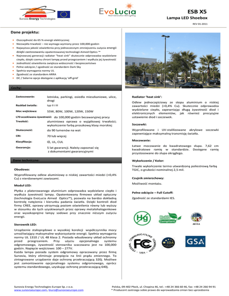 ESB X5 Lampa LED Shoebox REV 01-2011 Dane projektu: • Oszczędność do 65 % energii elektrycznej • Niezwykła trwałość – nie wymaga wymiany przez 100,000 godzin • Najwyższa jakość oświetlenia przy jednoczesnym zmniejszeniu zużycia energii dzięki zastosowaniu opatentowanej technologii Aimed Optics ™ • Najnowszej generacji radiator “heat sink” skutecznie odprowadza wydzielane ciepło, dzięki czemu chroni lampę przed przegrzaniem i wydłuża jej żywotność • Jednolitość oświetlenia zwiększa widoczność i bezpieczeństwo • Pełne odcięcie / zgodność ze standardem Dark Sky • Spełnia wymagania normy UL • Zgodność ze standardem ARRA • DC / Solarne opcje dostępne z aplikacją ‘off-grid’ Cechy: Zastosowanie: lotniska, parkingi, osiedla mieszkaniowe, ulice, drogi Rozkład światła: typ II i III Moc wejściowa: 55W, 80W, 100W, 120W, 150W L70 oczekiwana żywotność: do 100,000 godzin bezawaryjnej pracy Radiator ‘heat sink’: Odlew jednoczęściowy ze stopu aluminium o niskiej zawartości miedzi (<0,4% Cu). Skutecznie odprowadza wydzielane ciepło, zapewniając długą żywotność diod i elektronicznych elementów, jak również precyzyjne ustawienie diod i soczewek. Trwałość: aluminiowa oprawa o wyjątkowej trwałości; wykończenie farbą proszkową klasy morskiej Soczewki: Skuteczność: do 90 lumenów na wat CRI: 70 lub więcej Wyprofilowane i UV-stalilizowane akrylowe soczewki zapewniające maksymalną transmisję światła. Klasyfikacja: Œ, UL, CUL Mocowanie: Gwarancja: 5 lat gwarancji. Należy zapoznać się z dokumentami gwarancyjnymi Łatwe mocowanie do kwadratowego słupa. 7,62 cm kwadratowe ramię w standardzie. Dostępne ramię przystosowane do słupa okrągłego. Dane techniczne: Wykończenie / Kolor: Obudowa: Trwałe wykończenie termo utwardzoną poliestrową farbą TGIC, o grubości nominalnej 2,5 mil. Wyprofilowany odlew aluminiowy o niskiej zawartości miedzi (<0,4% Cu) z nierdzewnymi zawiasami. Czujnik zmierzchowy: Możliwość montażu. Moduł LED: Płytka z platerowanego aluminium odprowadza wydzielane ciepło i wydłuża żywotność lampy. Opatentowany firmowo układ optyczny (technologia EvoLucia Aimed Optics™), pozwala na bardzo dokładną kontrolę natężenia i kierunku padania światła. Dzięki kontroli diod firmy CREE, oprawy utrzymują poziom oświetlenia równy lub wyższy w stosunku do tych uzyskiwanych przez oprawy metalohalogenkowe oraz wysokoprężne lampy sodowe przy znacznie niższym zużyciu energii. Pełne odcięcie – Full Cutoff: Zgodność ze standardami IES. AR R A Sterownik LED: Urządzenie stałoprądowe o wysokiej korekcji współczynnika mocy umożliwiający maksymalne wykorzystanie energii. Spełnia wymagania normy UL 1310 / UL 48 klasa 2. Posiada wbudowany układ ochronny przed przegrzaniem. Przy użyciu opcjonalnego systemu odgromowego, żywotność sterownika szacowana jest na 100,000 godzin. Napięcie wejściowe: 100 – 277V. Każda lampa posiada system odgromowy opracowany przez firmę Sunovia, który eliminuje przepięcia na linii prądu zmiennego. To zintegrowane urządzenie daje ochronę przekraczającą 320j. Możliwe jest zamontowanie opcjonalnego systemu odgromowego, oprócz systemu standardowego, uzyskując ochronę przekraczającą 640j. Sunovia Energy Technologies Europe Sp. z o.o. www.sunoviaeurope.com, [email protected] Polska, 09-402 Płock, ul. Chopina 46, tel.: +48 24 366 60 46, fax: +48 24 266 94 91 * Producent zastrzega sobie prawo do wprowadzania zmian bez uprzedzenia ESB X5 Lampa LED Shoebox REV 01-2011 Dane techniczne: 17,15 cm 38,10 cm 50,80 cm 2 Waga: 12,70 kg Wysokość: 17,15 cm Szerokość: 38,10 cm Długość: 50,80 cm Lampy wyładowcze o dużej intensywności (HID) Lampy LED Oszczędność energii Przepływ prądu* 100W HPS 55W 45% 300 mA 100W MH 55W 45% 300mA 150W HPS 80W 47% 410 mA 150W MH 80W 47% 410 mA 175W MH 100W 43% 525 mA 200W HPS 100W 50% 525 mA 250W HPS 120W 52% 600 mA 400W HPS 150W 62% 750 mA 400W MH 150W 62% 750 mA * Przedstawia typowy przepływ prądu dla danej konfiguracji Sunovia Energy Technologies Europe Sp. z o.o. www.sunoviaeurope.com, [email protected] Polska, 09-402 Płock, ul. Chopina 46, tel.: +48 24 366 60 46, fax: +48 24 266 94 91 * Producent zastrzega sobie prawo do wprowadzania zmian bez uprzedzenia ESB X5 Lampa LED Shoebox REV 01-2011 Rozstaw śrub mocujących: Rodzaje ramion: 7,62 cm ramię do kwadratowego słupa W standardzie 15,24 cm ramię do kwadratowego słupa 30,48 cm ramię do kwadratowego słupa Sunovia Energy Technologies Europe Sp. z o.o. www.sunoviaeurope.com, [email protected] 7,62 cm ramię do okrągłego słupa 15,24 cm ramię do okrągłego słupa 30,48 cm ramię do okrągłego słupa Polska, 09-402 Płock, ul. Chopina 46, tel.: +48 24 366 60 46, fax: +48 24 266 94 91 * Producent zastrzega sobie prawo do wprowadzania zmian bez uprzedzenia