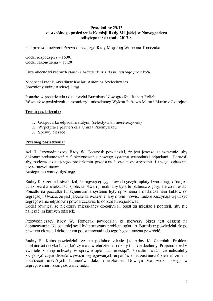 Protokół nr 29/13 ze wspólnego posiedzenia Komisji Rady Miejskiej w Nowogrodźcu odbytego 09 sierpnia 2013 r. pod przewodnictwem Przewodniczącego Rady Miejskiej Wilhelma Tomczuka. Godz. rozpoczęcia – 15:00 Godz. zakończenia – 17:20 Lista obecności radnych stanowi załącznik nr 1 do niniejszego protokołu. Nieobecni radni: Arkadiusz Kosior, Antonina Szelechowicz. Spóźniony radny Andrzej Drąg. Ponadto w posiedzeniu udział wziął Burmistrz Nowogrodźca Robert Relich. Również w posiedzeniu uczestniczyli mieszkańcy Wykrot Państwo Marta i Mariusz Czurejno. Temat posiedzenia: 1. Gospodarka odpadami stałymi (selektywna i nieselektywna). 2. Współpraca partnerska z Gminą Przemyślany. 3. Sprawy bieżące. Przebieg posiedzenia: Ad. 1. Przewodniczący Rady W. Tomczuk powiedział, że jest jeszcze za wcześnie, aby dokonać podsumowań z funkcjonowania nowego systemu gospodarki odpadami. Poprosił aby podczas dzisiejszego posiedzenia przedstawić swoje spostrzeżenia i uwagi zgłaszane przez mieszkańców. Następnie otworzył dyskusję. Radny K. Czerniak stwierdził, że najwięcej sygnałów dotyczyło opłaty kwartalnej, która jest uciążliwa dla większości społeczeństwa i prosili, aby była to płatność z góry, ale co miesiąc. Ponadto na początku funkcjonowania systemu były opóźnienia z dostarczaniem kubłów do segregacji. Uważa, że jest jeszcze za wcześnie, aby o tym mówić. Ludzie zaczynają się uczyć segregowania odpadów i powoli zaczyna to dobrze funkcjonować. Dodał również, że niektórzy mieszkańcy dokonywali opłat za miesiąc i poprosił, aby nie naliczać im karnych odsetek. Przewodniczący Rady W. Tomczuk powiedział, że pierwszy okres jest czasem na dopracowanie. Na ostatniej sesji był poruszany problem opłat i p. Burmistrz powiedział, że po pewnym okresie i dokonanym podsumowaniu do tego będzie można powrócić. Radny R. Kalus powiedział, że ma podobne zdanie jak radny K. Czerniak. Problem odpłatności dotyka ludzi, którzy mają wielodzietne rodziny i niskie dochody. Proponuje w IV kwartale zmianę uchwały w sprawie opłat „za miesiąc”. Ponadto uważa, że należałoby zwiększyć częstotliwość wywozu segregowanych odpadów oraz zastanowić się nad zmianą lokalizacji niektórych ludmerów. Jako mieszkaniec Nowogrodźca widzi postęp w segregowaniu i zaangażowanie ludzi. 1 Wiceprzewodnicząca Rady H. Pilna zaapelowała o zmianę uchwały od następnego kwartału w sprawie miesięcznej odpłatności za śmieci. Nie chce słyszeć od mieszkańców takich słów (a mają rację), że gmina chce naprzód brać pieniądze i że Burmistrz i Rada mają w tym jakiś cel. Zbliża się okres zimowy gdzie ludzie muszą kupić opał i wiele rzeczy na zimę, a społeczeństwo nie jest bogate. Bezrobocie w Gminie jest wysokie pomimo Strefy Ekonomicznej i w całym powiecie jest największe bezrobocie oprócz Miasta Bolesławiec. Nie róbmy tego naszym wyborcom i naszym mieszkańcom. Jeszcze raz prosi o przygotowanie uchwały i zastosowania miesięcznej opłaty. Radna B. Wójtowicz również przychyliła się do wypowiedzi radnych w sprawie odpłatności. Ponadto zaobserwowała brak porządku przy ludmerach. Również ma pytania od mieszkańców gdzie wrzucić butelki po wodzie 5 litrowej. Następnie poprosiła Przewodniczącego Rady, aby zezwolił na zabranie głosu obecnemu p. Mariuszowi Czurejno, który ma dużą wiedzę na temat tego co się dzieje. Radny T. Filistyński przypomniał, że jeżeli coś nie mieści się do ludmera, to w myśl obowiązujących przepisów pozostawianie go obok jest typowym zaśmiecaniem. Radny K. Czernik przypomniał, że należy zgniatać opakowania i duże butelki też wejdą do ludmerów. Radna B. Wójtowicz powiedziała, że wszyscy się uczą bo jest to coś nowego. Uważa, że świadomość i wiedza mieszkańców jest zbyt mała. Jest mnóstwo zwyczajnych pytań, które w trakcie podejmowania uchwał były oczywiste, a teraz okazuje się, że jest inaczej. Radny D. Zdunek powiedział, że z jego obserwacji to w pierwszej kolejności powinno być uchwalenie opłaty miesięcznej. Również ważna jest częstotliwość opróżniania ludmerów, za rzadko, albo za mało zestawów. Następnie zadał pytanie, pracownicy w momencie kiedy rozwozili kubły podawali mieszkańcom informacje, że będzie możliwość odbioru posegregowanych odpadów również z posesji – czy jest coś wiadomo na ten temat? Burmistrz Nowogrodźca R. Relich odpowiedział, że zgodnie z uchwałą Rady Miejskiej i umową, obowiązkiem świadczącego usługi w przypadku indywidualnych mieszkańców jest to możliwe poza podstawową opłatą. W umowie zawarto to co było poruszane w wypowiedziach, czyli odbiór indywidualny dwukrotny z posesji czyli dostarczone dystrybuowane worki na poszczególne frakcje i zbiórka ponadgabarytowa kontenerowa, czyli to co nie mieści się w ludmerze, do czasu zbiórki, która będzie miała charakter okresowy należy zgromadzić, a jeżeli ktoś nie ma możliwości i nie chce oczekiwać to punkt selektywnej zbiórki odpadów komunalnych w Nowogrodźcu jest otwarty od 1 lipca i można te odpady dostarczyć i pozostawić. Radny D. Zdunek zadał pytanie, czy ZGiUK planuje zbiórkę odpadów posegregowanych z posesji? Burmistrz Nowogrodźca R. Relich odpowiedział, że Gminę wiąże umowa, która została zawarta na podstawie zamówienia publicznego, które zostało ogłoszone i w nim są określone kryteria. Podstawowym systemem jest system ludmerowy, odbierane są z posesji odpady posortownicze, z częstotliwością określoną w umowie, zgodnie z harmonogramem, który wstępnie na miesiąc lipiec został na sesji Rady Miejskiej przedstawiony. Wiemy o problemach, które są podczas dzisiejszego posiedzenia przedstawiane czyli częstotliwość, 2 czas opróżniania, dostępność czyli liczba rozstawionych ludmerów i pojemniki na biodegradowalne. Prosi, aby nie wyciągać daleko idących 