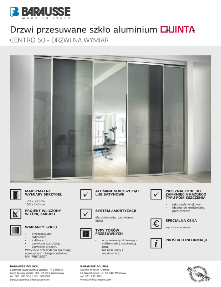 Drzwi przesuwane szkło aluminium CENTRO 60 - DRZWI NA WYMIAR MAKSYMALNE WYMIARY SKRZYDEŁ ALUMINIUM BŁYSZCZĄCE LUB SATYNOWE 120 x 300 cm 150 x 240 cm PROJEKT WLICZONY W CENĘ ZAKUPU WARIANTY SZKIEŁ • przezroczyste; • satynowe; • z dekorami; • barwione szarością; • barwione brązem. Wszystkie przeszklenia spełniają wymogi norm bezpieczeństwa UNI 7697:2007 BARAUSSE POLSKA Centrum Wyposażenia Wnętrz “TTV HOME” Aleje Jerozolimskie 185, 02-222 Warszawa tel. 601 183 531 / 601 668 061 [email protected] SYSTEM AMORTYZACJI dla otwierania i zamykania drzwi TYPY TORÓW PRZESUWNYCH • • or przesuwny zlicowany z sufitem lub z maskonicą toru; tor naścienny z maskownicą. BARAUSSE POLSKA Galeria Wnętrz “Domar” Ul. Braniborska 14, 53-680 Wrocław tel. 531 292 905 [email protected] PRZEZNACZONE DO ZAMKNIĘCIA KAŻDEGO TYPU POMIESZCZENIA • • jako szafy wnękowe; idealne do rozdzielenia pomieszczeń. SPECJALNA CENA wyrażone w m.kw. PROŚBA O INFORMACJE