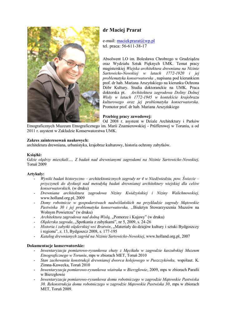 dr Maciej Prarat e-mail: [email protected] tel. praca: 56-611-38-17 Absolwent LO im. Bolesława Chrobrego w Grudziądzu oraz Wydziału Sztuk Pięknych UMK. Temat pracy magisterskiej Wiejska architektura drewniana na Nizinie Sartowicko-Nowskiej w latach 1772-1920 i jej problematyka konserwatorska , napisana pod kierunkiem prof. dr hab. Mariana Arszyńskiego na kierunku Ochrona Dóbr Kultury. Studia doktoranckie na UMK. Praca doktorska pt. Architektura zagrodowa Doliny Dolnej Wisły w latach 1772-1945 w kontekście krajobrazu kulturowego oraz jej problematyka konserwatorska. Promotor prof. dr hab. Mariana Arszyńskiego Przebieg pracy zawodowej: Od 2008 r. asystent w Dziale Architektury i Parków Etnograficznych Muzeum Etnograficznego im. Marii Znamierowskiej - Prüfferowej w Toruniu, a od 2011 r. asystent w Zakładzie Konserwatorstwa UMK. Zakres zainteresowań naukowych: architektura drewniana, urbanistyka, krajobraz kulturowy, historia ochrony zabytków. Książki: Gdzie olędrzy mieszkali…, Z badań nad drewnianymi zagrodami na Nizinie Sartowicko-Nowskiej, Toruń 2009 Artykuły: - Wyniki badań historyczno – architektonicznych zagrody nr 4 w Niedźwiedziu, pow. Świecie – przyczynek do dyskusji nad metodyką badań drewnianej architektury wiejskiej dla celów konserwatorskich, (w druku) - Drewniana architektura zagrodowa Niziny Kwidzyńskiej i Niziny Walichnowskiej, www.holland.org.pl, 2009 - Domy robotnicze w gospodarstwach nadwiślańskich na przykładzie zagrody Mątowskie Pastwiska 30 i jej problematyka konserwatorska, „Biuletyn Stowarzyszenia Muzeów na Wolnym Powietrzu” (w druku) - Architektura zagrodowa nad dolną Wisłą, „Pomorze i Kujawy” (w druku) - Olęderska zagroda, „Spotkania z zabytkami”, nr 5, 2009, s. 24-26 - Historia i zabytki olęderskiej wsi Bratwin, „Materiały do dziejów kultury i sztuki Bydgoszczy i regionu”, z. 13, Bydgoszcz 2008, s. 177-195 - Katalog drewnianych zagród na Nizinie Sartowicko-Nowskiej, www.holland.org.pl, 2007 Dokumentacje konserwatorskie: - Inwentaryzacja pomiarowo-rysunkowa chaty z Męcikału w zagrodzie kaszubskiej Muzeum Etnograficznego w Toruniu, mps w zbiorach MET, Toruń 2010 - Stan zachowania konstrukcji drewnianej dworca kolejowego w Puszczykówku, współaut. K. Zimna-Kawecka, Toruń 2010 - Inwentaryzacja pomiarowo-rysunkowa wiatraka w Bierzgłowie, 2009, mps w zbiorach Parafii w Bierzgłowie - Inwentaryzacja pomiarowo-rysunkowa domu robotniczego w zagrodzie Mątowskie Pastwiska 30. Rekonstrukcja domu robotniczego w zagrodzie Mątowskie Pastwiska 30, mps w zbiorach MET, Toruń 2009. - - - - Inwentaryzacja pomiarowo-rysunkowa stodoły z Mikołajskich w zagrodzie tucholskiej Muzeum Etnograficznego w Toruniu, mps w zbiorach MET, Toruń 2009. Toruń – Kamienica Pod Gwiazdą. Projekt poprawy termoizolacji stolarki okiennej, pr. zbiorowa, współaut. dr inż. arch. B. Zimnowoda-Krajewska, K. Zimna-Kawecka, Toruń 2008, Dokumentacja wykonana na zlecenie Muzeum Okręgowego w Toruniu. Opinia i wytyczne konserwatorskie drewnianej zagrody w Radomsku, woj. łódzkie, współaut. K. Zimna-Kawecka, 2008. Kościół parafialny p.w. Chrystusa Króla, Jeleńcz, gm. Kęsowo, woj. kujawsko-pomorskie, współaut. K. Zimna-Kawecka, KEZAiB, 2008, mps zb. WUOZ DB. Kościół filialny p.w. św. Bernarda i budynek plebanii, Kęsowo, gm. loco, woj. kujawskopomorskie, współaut. K. Zimna-Kawecka, KEZAiB, 2008, mps zb. WUOZ DB. Dokumentacja historyczno-konserwatorska wraz z inwentaryzacją pomiarowo-rysunkową trzech ołtarzy w kościele par. p.w. św. Andrzeja Apostoła w Ujeździe opolskim, praca zbiorowa, współaut. P. Trybuszewski, K. Kosacz, K. Zimna-Kawecka, pod kierunkiem dr. J. Krawczyka, XII 2006 - I 2007, mps w zb. parafii. Budynek ptaszarni w zespole dworskim w Budyniu gm. Bukowiec, współaut. K. ZimnaKawecka, woj. kujawsko-pomorskie, KEZAiB, 2006, mps zb. WUOZ DB. Ewidencja fotograficzna Bydgoskiego Przedmieścia w Toruniu na zlecenie Miejskiego Konserwatora Zabytków w Toruniu, współaut. M. Gruchalski, w zbiorach Miejskiego Konserwatora Zabytków, Toruń 2005 Inwentaryzacja pomiarowo-rysunkowa oraz dokumentacja fotograficzna drzwi intarsjowanych, współaut. P. Trybuszewski, K. Zimna-Kawecka, w ramach Dokumentacji Historyczno-Konserwatorskiej Zespołu Drzwi Intarsjowanych z I p. Ratusza Staromiejskiego w Toruniu (praca zbiorowa), VIII - XI 2007, Dokumentacja wyk. na zlecenie Muzeum Okręgowego w Toruniu, mps w zb. Muzeum Okręgowego w Toruniu. Ponad 350 Kart Ewidencyjnych Zabytków dworów, pałaców, kościołów, kamienic i budownictwa wiejskiego z XIX i I poł. XX w. na terenie gmin byłego woj. bydgoskiego, współaut. K. Zimna-Kawecka, 2006-2008, mps w zb. WUOZ DB. Udział w konferencjach, wystąpienia: - Kształtowanie się krajobrazu kulturowego Niziny Sartowicko-Nowskiej, III Międzynarodowa Studencka Konferencja Naukowa „Muzeum i Konserwacja u progu XXI w.”, 30.03.-01.04. 2006 r., Toruń (współorganizacja) - Architektura zagrodowa Doliny Dolnej Wisły - wybrane zagadnienia, III Ogólnopolskie Forum Doktorantów Historii Sztuki, 25-28.10.2007, Toruń (współorganizacja) - Domy robotnicze w gospodarstwach nadwiślańskich na przykładzie zagrody Mątowskie Pastwiska 30 i jej problematyka konserwatorska, „Ogólnopolska Konferencja Skansenowska pt. Wieś uboga czy mlekiem i miodem płynąca? Prawda w przedstawieniach skansenowskich”, 08-10.10.2009, Kolbuszowa - Wyniki badań historyczno – architektonicznych zagrody nr 4 w Niedźwiedziu, pow. Świecie – przyczynek do dyskusji nad metodyką badań drewnianej architektury wiejskiej dla celów konserwatorskich, współautor U. Schaaf, Sesja naukowa poświęcona pamięci Prof. Jerzego Remera w 30. rocznicę śmierci "Wobec zabytku - tradycje i perspektywy postaw.", 4-5 grudnia 2009 r., Toruń Stypendia, granty i wyjazdy zagraniczne: stypendysta Ministra Kultury i Dziedzictwa Narodowego w dziedzinie Ochrona Dóbr Kultury (2007 r.) Nagrody i wyróżnienia: Na