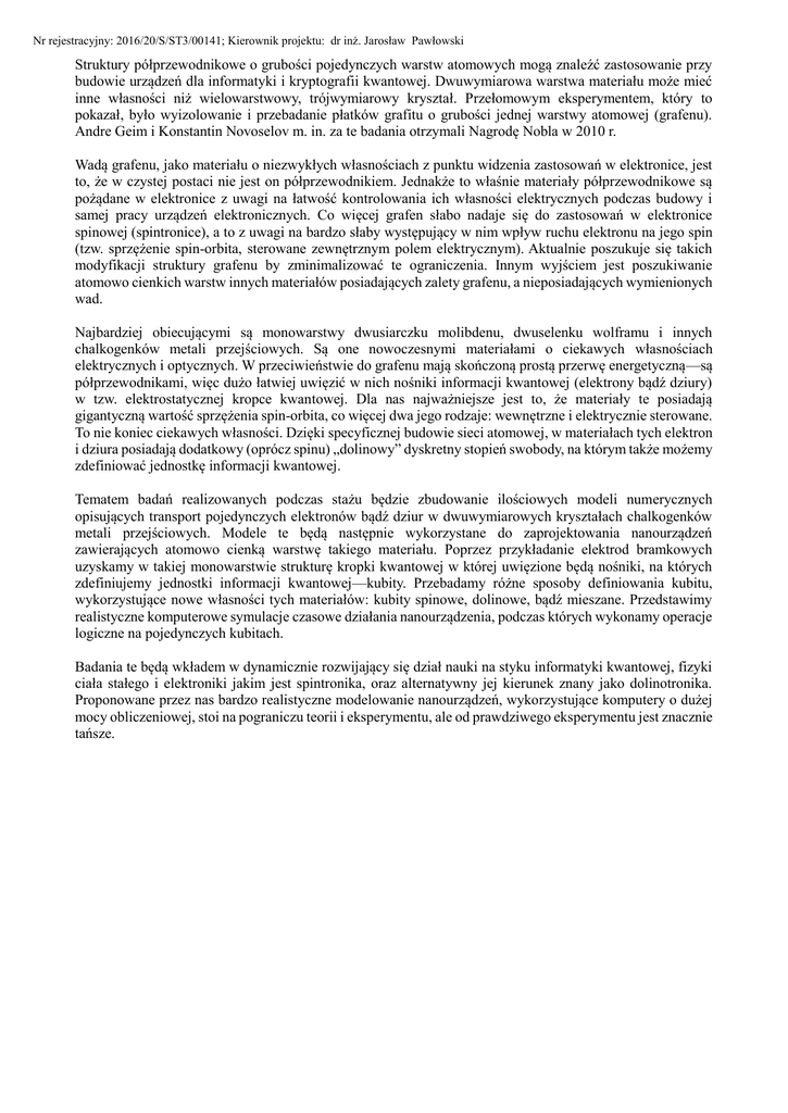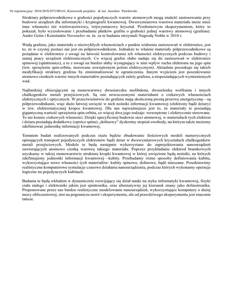 Nr rejestracyjny: 2016/20/S/ST3/00141; Kierownik projektu: dr inż. Jarosław Pawłowski Struktury półprzewodnikowe o grubości pojedynczych warstw atomowych mogą znaleźć zastosowanie przy budowie urządzeń dla informatyki i kryptografii kwantowej. Dwuwymiarowa warstwa materiału może mieć inne własności niż wielowarstwowy, trójwymiarowy kryształ. Przełomowym eksperymentem, który to pokazał, było wyizolowanie i przebadanie płatków grafitu o grubości jednej warstwy atomowej (grafenu). Andre Geim i Konstantin Novoselov m. in. za te badania otrzymali Nagrodę Nobla w 2010 r. Wadą grafenu, jako materiału o niezwykłych własnościach z punktu widzenia zastosowań w elektronice, jest to, że w czystej postaci nie jest on półprzewodnikiem. Jednakże to właśnie materiały półprzewodnikowe są pożądane w elektronice z uwagi na łatwość kontrolowania ich własności elektrycznych podczas budowy i samej pracy urządzeń elektronicznych. Co więcej grafen słabo nadaje się do zastosowań w elektronice spinowej (spintronice), a to z uwagi na bardzo słaby występujący w nim wpływ ruchu elektronu na jego spin (tzw. sprzężenie spin-orbita, sterowane zewnętrznym polem elektrycznym). Aktualnie poszukuje się takich modyfikacji struktury grafenu by zminimalizować te ograniczenia. Innym wyjściem jest poszukiwanie atomowo cienkich warstw innych materiałów posiadających zalety grafenu, a nieposiadających wymienionych wad. Najbardziej obiecującymi są monowarstwy dwusiarczku molibdenu, dwuselenku wolframu i innych chalkogenków metali przejściowych. Są one nowoczesnymi materiałami o ciekawych własnościach elektrycznych i optycznych. W przeciwieństwie do grafenu mają skończoną prostą przerwę energetyczną—są półprzewodnikami, więc dużo łatwiej uwięzić w nich nośniki informacji kwantowej (elektrony bądź dziury) w tzw. elektrostatycznej kropce kwantowej. Dla nas najważniejsze jest to, że materiały te posiadają gigantyczną wartość sprzężenia spin-orbita, co więcej dwa jego rodzaje: wewnętrzne i elektrycznie sterowane. To nie koniec ciekawych własności. Dzięki specyficznej budowie sieci atomowej, w materiałach tych elektron i dziura posiadają dodatkowy (oprócz spinu) „dolinowy” dyskretny stopień swobody, na którym także możemy zdefiniować jednostkę informacji kwantowej. Tematem badań realizowanych podczas stażu będzie zbudowanie ilościowych modeli numerycznych opisujących transport pojedynczych elektronów bądź dziur w dwuwymiarowych kryształach chalkogenków metali przejściowych. Modele te będą następnie wykorzystane do zaprojektowania nanourządzeń zawierających atomowo cienką warstwę takiego materiału. Poprzez przykładanie elektrod bramkowych uzyskamy w takiej monowarstwie strukturę kropki kwantowej w której uwięzione będą nośniki, na których zdefiniujemy jednostki informacji kwantowej—kubity. Przebadamy różne sposoby definiowania kubitu, wykorzystujące nowe własności tych materiałów: kubity spinowe, dolinowe, bądź mieszane. Przedstawimy realistyczne komputerowe symulacje czasowe działania nanourządzenia, podczas których wykonamy operacje logiczne na pojedynczych kubitach. Badania te będą wkładem w dynamicznie rozwijający się dział nauki na styku informatyki kwantowej, fizyki ciała stałego i elektroniki jakim jest spintronika, oraz alternatywny jej kierunek znany jako dolinotronika. Proponowane przez nas bardzo realistyczne modelowanie nanourządzeń, wykorzystujące komputery o dużej mocy obliczeniowej, stoi na pograniczu teorii i eksperymentu, ale od prawdziwego eksperymentu jest znacznie tańsze.