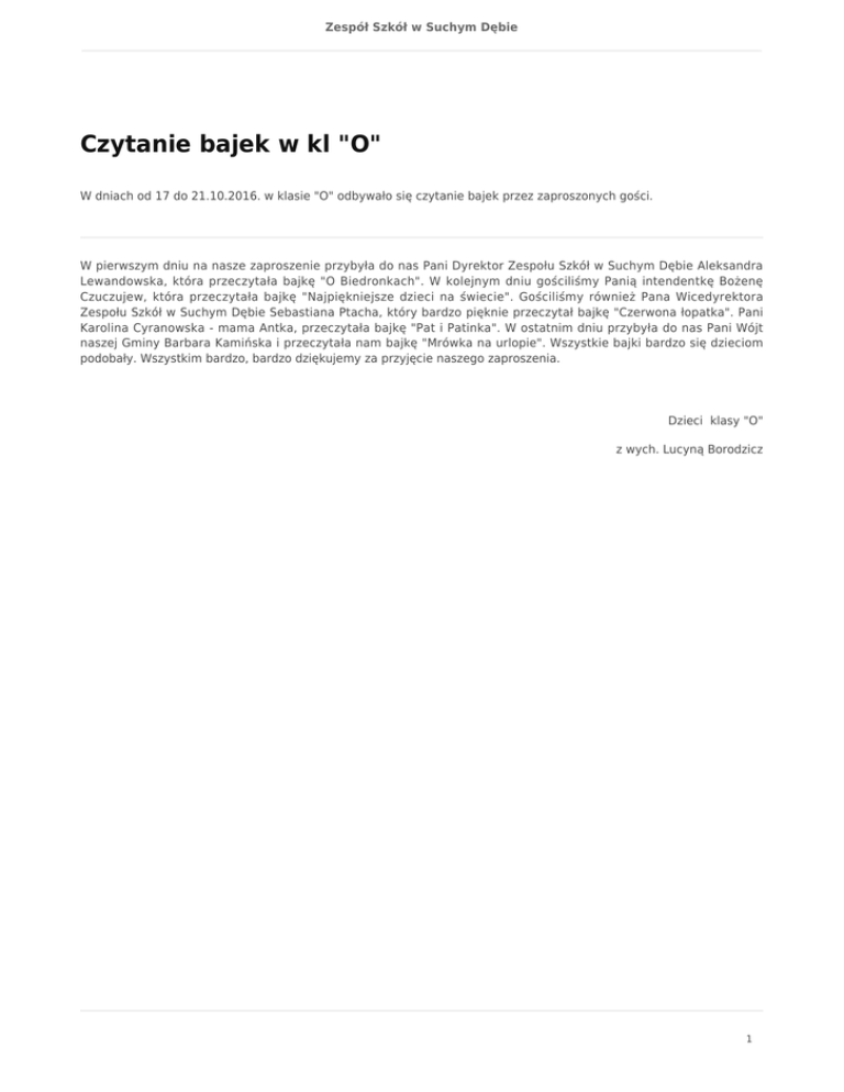 Zespół Szkół w Suchym Dębie Czytanie bajek w kl "O" W dniach od 17 do 21.10.2016. w klasie "O" odbywało się czytanie bajek przez zaproszonych gości. W pierwszym dniu na nasze zaproszenie przybyła do nas Pani Dyrektor Zespołu Szkół w Suchym Dębie Aleksandra Lewandowska, która przeczytała bajkę "O Biedronkach". W kolejnym dniu gościliśmy Panią intendentkę Bożenę Czuczujew, która przeczytała bajkę "Najpiękniejsze dzieci na świecie". Gościliśmy również Pana Wicedyrektora Zespołu Szkół w Suchym Dębie Sebastiana Ptacha, który bardzo pięknie przeczytał bajkę "Czerwona łopatka". Pani Karolina Cyranowska - mama Antka, przeczytała bajkę "Pat i Patinka". W ostatnim dniu przybyła do nas Pani Wójt naszej Gminy Barbara Kamińska i przeczytała nam bajkę "Mrówka na urlopie". Wszystkie bajki bardzo się dzieciom podobały. Wszystkim bardzo, bardzo dziękujemy za przyjęcie naszego zaproszenia. Dzieci klasy "O" z wych. Lucyną Borodzicz 1