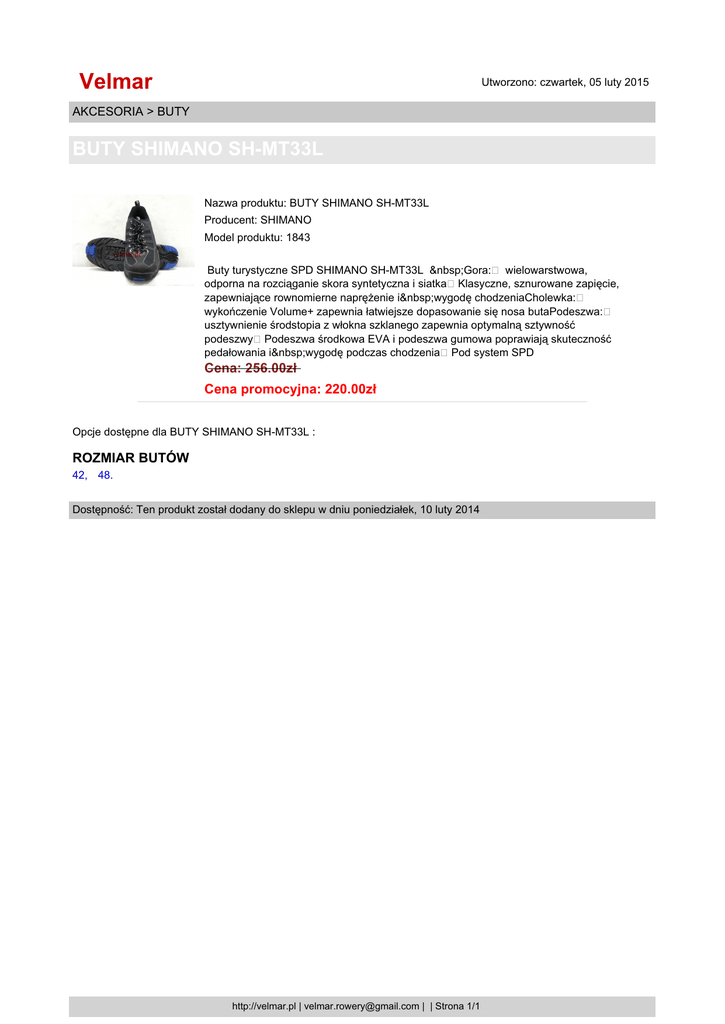 Velmar Utworzono: czwartek, 05 luty 2015 AKCESORIA > BUTY BUTY SHIMANO SH-MT33L Nazwa produktu: BUTY SHIMANO SH-MT33L Producent: SHIMANO Model produktu: 1843 Buty turystyczne SPD SHIMANO SH-MT33L Gora: wielowarstwowa, odporna na rozciąganie skora syntetyczna i siatka Klasyczne, sznurowane zapięcie, zapewniające rownomierne naprężenie i wygodę chodzeniaCholewka: wykończenie Volume+ zapewnia łatwiejsze dopasowanie się nosa butaPodeszwa: usztywnienie środstopia z włokna szklanego zapewnia optymalną sztywność podeszwy Podeszwa środkowa EVA i podeszwa gumowa poprawiają skuteczność pedałowania i wygodę podczas chodzenia Pod system SPD Cena: 256.00zł Cena promocyjna: 220.00zł Opcje dostępne dla BUTY SHIMANO SH-MT33L : ROZMIAR BUTÓW 42, 48. Dostępność: Ten produkt został dodany do sklepu w dniu poniedziałek, 10 luty 2014 http://velmar.pl | [email protected] | | Strona 1/1