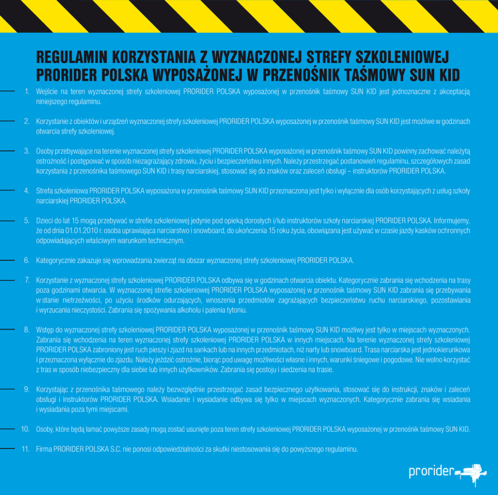 REGULAMIN KORZYSTANIA Z WYZNACZONEJ STREFY SZKOLENIOWEJ PRORIDER POLSKA WYPOSAŻONEJ W PRZENOŚNIK TAŚMOWY SUN KID 1. Wejście na teren wyznaczonej strefy szkoleniowej PRORIDER POLSKA wyposażonej w przenośnik taśmowy SUN KID jest jednoznaczne z akceptacją niniejszego regulaminu. 2. Korzystanie z obiektów i urządzeń wyznaczonej strefy szkoleniowej PRORIDER POLSKA wyposażonej w przenośnik taśmowy SUN KID jest możliwe w godzinach otwarcia strefy szkoleniowej. 3. Osoby przebywające na terenie wyznaczonej strefy szkoleniowej PRORIDER POLSKA wyposażonej w przenośnik taśmowy SUN KID powinny zachować należytą ostrożność i postępować w sposób niezagrażający zdrowiu, życiu i bezpieczeństwu innych. Należy przestrzegać postanowień regulaminu, szczegółowych zasad korzystania z przenośnika taśmowego SUN KID i trasy narciarskiej, stosować się do znaków oraz zaleceń obsługi – instruktorów PRORIDER POLSKA. 4. Strefa szkoleniowa PRORIDER POLSKA wyposażona w przenośnik taśmowy SUN KID przeznaczona jest tylko i wyłącznie dla osób korzystających z usług szkoły narciarskiej PRORIDER POLSKA. 5. Dzieci do lat 15 mogą przebywać w strefie szkoleniowej jedynie pod opieką dorosłych i/lub instruktorów szkoły narciarskiej PRORIDER POLSKA. Informujemy, że od dnia 01.01.2010 r. osoba uprawiająca narciarstwo i snowboard, do ukończenia 15 roku życia, obowiązana jest używać w czasie jazdy kasków ochronnych odpowiadających właściwym warunkom technicznym. 6. Kategorycznie zakazuje się wprowadzania zwierząt na obszar wyznaczonej strefy szkoleniowej PRORIDER POLSKA. 7. Korzystanie z wyznaczonej strefy szkoleniowej PRORIDER POLSKA odbywa się w godzinach otwarcia obiektu. Kategorycznie zabrania się wchodzenia na trasy poza godzinami otwarcia. W wyznaczonej strefie szkoleniowej PRORIDER POLSKA wyposażonej w przenośnik taśmowy SUN KID zabrania się przebywania w stanie nietrzeźwości, po użyciu środków odurzających, wnoszenia przedmiotów zagrażających bezpieczeństwu ruchu narciarskiego, pozostawiania i wyrzucania nieczystości. Zabrania się spożywania alkoholu i palenia tytoniu. 8. Wstęp do wyznaczonej strefy szkoleniowej PRORIDER POLSKA wyposażonej w przenośnik taśmowy SUN KID możliwy jest tylko w miejscach wyznaczonych. Zabrania się wchodzenia na teren wyznaczonej strefy szkoleniowej PRORIDER POLSKA w innych miejscach. Na terenie wyznaczonej strefy szkoleniowej PRORIDER POLSKA zabroniony jest ruch pieszy i zjazd na sankach lub na innych przedmiotach, niż narty lub snowboard. Trasa narciarska jest jednokierunkowa i przeznaczona wyłącznie do zjazdu. Należy jeździć ostrożnie, biorąc pod uwagę możliwości własne i innych, warunki śniegowe i pogodowe. Nie wolno korzystać z tras w sposób niebezpieczny dla siebie lub innych użytkowników. Zabrania się postoju i siedzenia na trasie. 9. Korzystając z przenośnika taśmowego należy bezwzględnie przestrzegać zasad bezpiecznego użytkowania, stosować się do instrukcji, znaków i zaleceń obsługi i instruktorów PRORIDER POLSKA. Wsiadanie i wysiadanie odbywa się tylko w miejscach wyznaczonych. Kategorycznie zabrania się wsiadania i wysiadania poza tymi miejscami. 10. Osoby, które będą łamać powyższe zasady mogą zostać usunięte poza teren strefy szkoleniowej PRORIDER POLSKA wyposażonej w przenośnik taśmowy SUN KID. 11. Firma PRORIDER POLSKA S.C. nie ponosi odpowiedzialności za skutki niestosowania się do powyższego regulaminu.