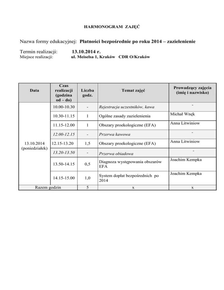 HARMONOGRAM ZAJĘĆ Nazwa formy edukacyjnej: Płatności bezpośrednie po roku 2014 – zazielenienie Termin realizacji: 13.10.2014 r. Miejsce realizacji: ul. Meiselsa 1, Kraków CDR O/Kraków Data Czas realizacji (godzina od – do) Liczba godz. 10.00-10.30 - Rejestracja uczestników, kawa 10.30-11.15 1 Ogólne zasady zazielenienia 11.15-12.00 1 Obszary proekologiczne (EFA) 12.00-12.15 - Przerwa kawowa 12.15-13.20 13.10.2014 (poniedziałek) 13.20-13.50 1,5 - Temat zajęć Obszary proekologiczne (EFA) Przerwa obiadowa 13.50-14.15 0,5 14.15-15.00 1,0 System dopłat bezpośrednich po 2014 5 Michał Wnęk Anna Litwiniow - Diagnoza występowania obszarów EFA Razem godzin Prowadzący zajęcia (imię i nazwisko) x Anna Litwiniow Joachim Kempka Joachim Kempka x