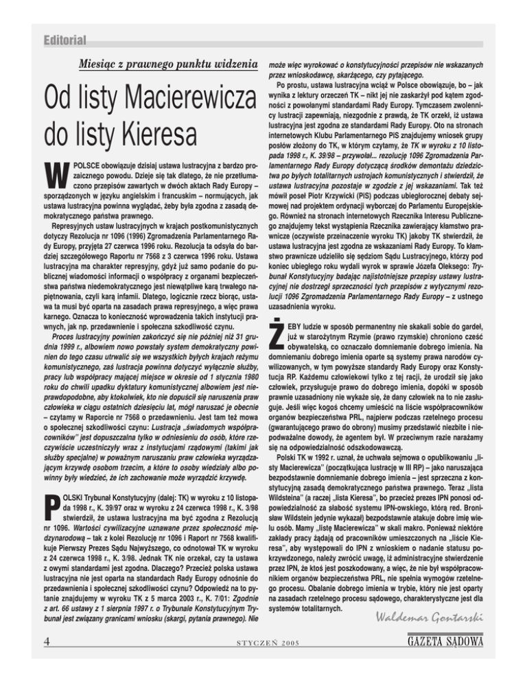 Editorial Miesiąc z prawnego punktu widzenia Od listy Macierewicza do listy Kieresa W POLSCE obowiązuje dzisiaj ustawa lustracyjna z bardzo pro− zaicznego powodu. Dzieje się tak dlatego, że nie przetłuma− czono przepisów zawartych w dwóch aktach Rady Europy – sporządzonych w języku angielskim i francuskim – normujących, jak ustawa lustracyjna powinna wyglądać, żeby była zgodna z zasadą de− mokratycznego państwa prawnego. Represyjnych ustaw lustracyjnych w krajach postkomunistycznych dotyczy Rezolucja nr 1096 (1996) Zgromadzenia Parlamentarnego Ra− dy Europy, przyjęta 27 czerwca 1996 roku. Rezolucja ta odsyła do bar− dziej szczegółowego Raportu nr 7568 z 3 czerwca 1996 roku. Ustawa lustracyjna ma charakter represyjny, gdyż już samo podanie do pu− blicznej wiadomości informacji o współpracy z organami bezpieczeń− stwa państwa niedemokratycznego jest niewątpliwe karą trwałego na− piętnowania, czyli karą infamii. Dlatego, logicznie rzecz biorąc, usta− wa ta musi być oparta na zasadach prawa represyjnego, a więc prawa karnego. Oznacza to konieczność wprowadzenia takich instytucji pra− wnych, jak np. przedawnienie i społeczna szkodliwość czynu. Proces lustracyjny powinien zakończyć się nie później niż 31 gru− dnia 1999 r., albowiem nowo powstały system demokratyczny powi− nien do tego czasu utrwalić się we wszystkich byłych krajach reżymu komunistycznego, zaś lustracja powinna dotyczyć wyłącznie służby, pracy lub współpracy mającej miejsce w okresie od 1 stycznia 1980 roku do chwili upadku dyktatury komunistycznej albowiem jest nie− prawdopodobne, aby ktokolwiek, kto nie dopuścił się naruszenia praw człowieka w ciągu ostatnich dziesięciu lat, mógł naruszać je obecnie – czytamy w Raporcie nr 7568 o przedawnieniu. Jest tam też mowa o społecznej szkodliwości czynu: Lustracja „świadomych współpra− cowników” jest dopuszczalna tylko w odniesieniu do osób, które rze− czywiście uczestniczyły wraz z instytucjami rządowymi (takimi jak służby specjalne) w poważnym naruszaniu praw człowieka wyrządza− jącym krzywdę osobom trzecim, a które to osoby wiedziały albo po− winny były wiedzieć, że ich zachowanie może wyrządzić krzywdę. P OLSKI Trybunał Konstytucyjny (dalej: TK) w wyroku z 10 listopa− da 1998 r., K. 39/97 oraz w wyroku z 24 czerwca 1998 r., K. 3/98 stwierdził, że ustawa lustracyjna ma być zgodna z Rezolucją nr 1096. Wartości cywilizacyjne uznawane przez społeczność mię− dzynarodową – tak z kolei Rezolucję nr 1096 i Raport nr 7568 kwalifi− kuje Pierwszy Prezes Sądu Najwyższego, co odnotował TK w wyroku z 24 czerwca 1998 r., K. 3/98. Jednak TK nie orzekał, czy ta ustawa z owymi standardami jest zgodna. Dlaczego? Przecież polska ustawa lustracyjna nie jest oparta na standardach Rady Europy odnośnie do przedawnienia i społecznej szkodliwości czynu? Odpowiedź na to py− tanie znajdujemy w wyroku TK z 5 marca 2003 r., K. 7/01: Zgodnie z art. 66 ustawy z 1 sierpnia 1997 r. o Trybunale Konstytucyjnym Try− bunał jest związany granicami wniosku (skargi, pytania prawnego). Nie 4 może więc wyrokować o konstytucyjności przepisów nie wskazanych przez wnioskodawcę, skarżącego, czy pytającego. Po prostu, ustawa lustracyjna wciąż w Polsce obowiązuje, bo – jak wynika z lektury orzeczeń TK – nikt jej nie zaskarżył pod kątem zgod− ności z powołanymi standardami Rady Europy. Tymczasem zwolenni− cy lustracji zapewniają, niezgodnie z prawdą, że TK orzekł, iż ustawa lustracyjna jest zgodna ze standardami Rady Europy. Oto na stronach internetowych Klubu Parlamentarnego PiS znajdujemy wniosek grupy posłów złożony do TK, w którym czytamy, że TK w wyroku z 10 listo− pada 1998 r., K. 39/98 – przywołał... rezolucję 1096 Zgromadzenia Par− lamentarnego Rady Europy dotyczącą środków demontażu dziedzic− twa po byłych totalitarnych ustrojach komunistycznych i stwierdził, że ustawa lustracyjna pozostaje w zgodzie z jej wskazaniami. Tak też mówił poseł Piotr Krzywicki (PiS) podczas ubiegłorocznej debaty sej− mowej nad projektem ordynacji wyborczej do Parlamentu Europejskie− go. Również na stronach internetowych Rzecznika Interesu Publiczne− go znajdujemy tekst wystąpienia Rzecznika zawierający kłamstwo pra− wnicze (oczywiste przeinaczenie wyroku TK) jakoby TK stwierdził, że ustawa lustracyjna jest zgodna ze wskazaniami Rady Europy. To kłam− stwo prawnicze udzieliło się sędziom Sądu Lustracyjnego, którzy pod koniec ubiegłego roku wydali wyrok w sprawie Józefa Oleksego: Try− bunał Konstytucyjny badając najistotniejsze przepisy ustawy lustra− cyjnej nie dostrzegł sprzeczności tych przepisów z wytycznymi rezo− lucji 1096 Zgromadzenia Parlamentarnego Rady Europy – z ustnego uzasadnienia wyroku. Ż EBY ludzie w sposób permanentny nie skakali sobie do gardeł, już w starożytnym Rzymie (prawo rzymskie) chroniono cześć obywatelską, co oznaczało domniemanie dobrego imienia. Na domniemaniu dobrego imienia oparte są systemy prawa narodów cy− wilizowanych, w tym powyższe standardy Rady Europy oraz Konsty− tucja RP. Każdemu człowiekowi tylko z tej racji, że urodził się jako człowiek, przysługuje prawo do dobrego imienia, dopóki w sposób prawnie uzasadniony nie wykaże się, że dany człowiek na to nie zasłu− guje. Jeśli więc kogoś chcemy umieścić na liście współpracowników organów bezpieczeństwa PRL, najpierw podczas rzetelnego procesu (gwarantującego prawo do obrony) musimy przedstawić niezbite i nie− podważalne dowody, że agentem był. W przeciwnym razie narażamy się na odpowiedzialność odszkodowawczą. Polski TK w 1992 r. uznał, że uchwała sejmowa o opublikowaniu „li− sty Macierewicza” (początkująca lustrację w III RP) – jako naruszająca bezpodstawnie domniemanie dobrego imienia – jest sprzeczna z kon− stytucyj