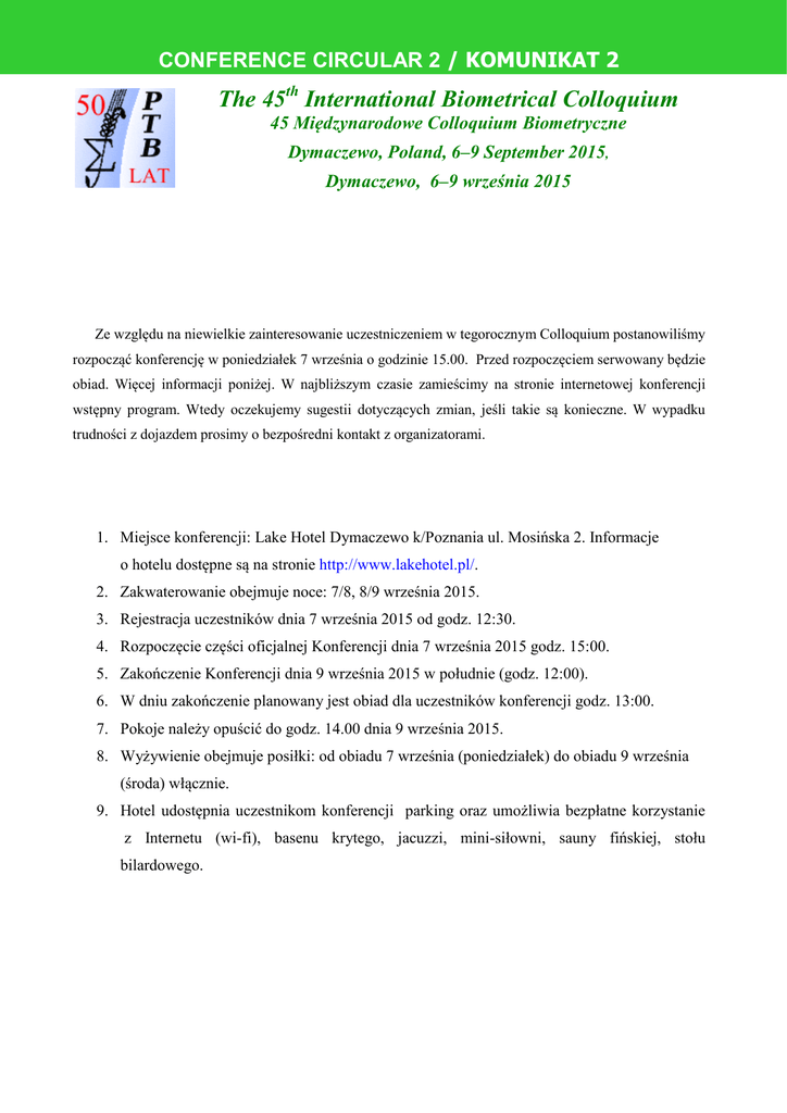 CONFERENCE CIRCULAR 2 / KOMUNIKAT 2 AT 1 The 45th International Biometrical Colloquium 45 Międzynarodowe Colloquium Biometryczne Dymaczewo, Poland, 6–9 September 2015, Dymaczewo, 6–9 września 2015 Ze względu na niewielkie zainteresowanie uczestniczeniem w tegorocznym Colloquium postanowiliśmy rozpocząć konferencję w poniedziałek 7 września o godzinie 15.00. Przed rozpoczęciem serwowany będzie obiad. Więcej informacji poniżej. W najbliższym czasie zamieścimy na stronie internetowej konferencji wstępny program. Wtedy oczekujemy sugestii dotyczących zmian, jeśli takie są konieczne. W wypadku trudności z dojazdem prosimy o bezpośredni kontakt z organizatorami. 1. Miejsce konferencji: Lake Hotel Dymaczewo k/Poznania ul. Mosińska 2. Informacje o hotelu dostępne są na stronie http://www.lakehotel.pl/. 2. Zakwaterowanie obejmuje noce: 7/8, 8/9 września 2015. 3. Rejestracja uczestników dnia 7 września 2015 od godz. 12:30. 4. Rozpoczęcie części oficjalnej Konferencji dnia 7 września 2015 godz. 15:00. 5. Zakończenie Konferencji dnia 9 września 2015 w południe (godz. 12:00). 6. W dniu zakończenie planowany jest obiad dla uczestników konferencji godz. 13:00. 7. Pokoje należy opuścić do godz. 14.00 dnia 9 września 2015. 8. Wyżywienie obejmuje posiłki: od obiadu 7 września (poniedziałek) do obiadu 9 września (środa) włącznie. 9. Hotel udostępnia uczestnikom konferencji parking oraz umożliwia bezpłatne korzystanie z Internetu (wi-fi), basenu krytego, jacuzzi, mini-siłowni, sauny fińskiej, stołu bilardowego.