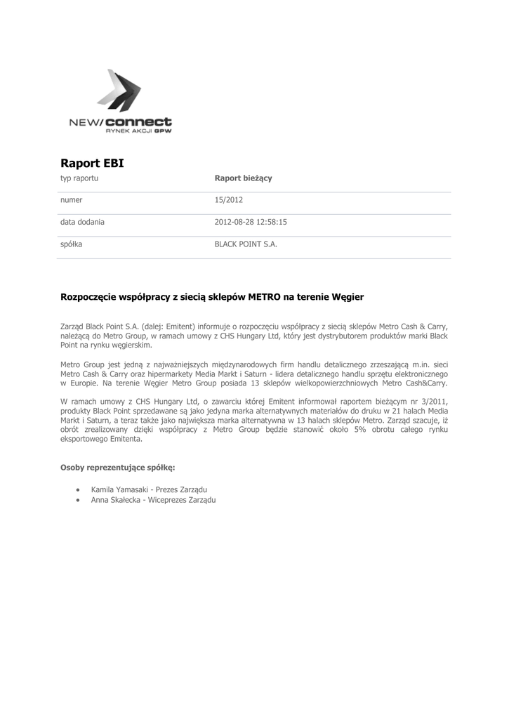 Raport EBI typ raportu Raport bieżący numer 15/2012 data dodania 2012-08-28 12:58:15 spółka BLACK POINT S.A. Rozpoczęcie współpracy z siecią sklepów METRO na terenie Węgier Zarząd Black Point S.A. (dalej: Emitent) informuje o rozpoczęciu współpracy z siecią sklepów Metro Cash & Carry, należącą do Metro Group, w ramach umowy z CHS Hungary Ltd, który jest dystrybutorem produktów marki Black Point na rynku węgierskim. Metro Group jest jedną z najważniejszych międzynarodowych firm handlu detalicznego zrzeszającą m.in. sieci Metro Cash & Carry oraz hipermarkety Media Markt i Saturn - lidera detalicznego handlu sprzętu elektronicznego w Europie. Na terenie Węgier Metro Group posiada 13 sklepów wielkopowierzchniowych Metro Cash&Carry. W ramach umowy z CHS Hungary Ltd, o zawarciu której Emitent informował raportem bieżącym nr 3/2011, produkty Black Point sprzedawane są jako jedyna marka alternatywnych materiałów do druku w 21 halach Media Markt i Saturn, a teraz także jako największa marka alternatywna w 13 halach sklepów Metro. Zarząd szacuje, iż obrót zrealizowany dzięki współpracy z Metro Group będzie stanowić około 5% obrotu całego rynku eksportowego Emitenta. Osoby reprezentujące spółkę:   Kamila Yamasaki - Prezes Zarządu Anna Skałecka - Wiceprezes Zarządu