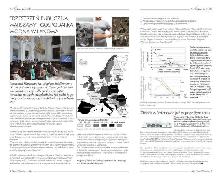 Nasze miasto Nasze miasto Przestrzeń Publiczna WarszaWy i gosPodarka Wodna WilanoWa 1. Potencjał warszawskiej przestrzeni publicznej. 2. Warszawa jako wielofunkcyjna, zintegrowana przestrzeń publiczna. 3. uproszczenie procesu inwestycyjnego w budownictwie. Historyczne dane dot. gęstości zaludnienia miast (źródło: demographia.com) Klęski żywiołowe / Problemy zdrowotne / Niekontrolowany rozwój miast PrzestrzeńWarszawyjestciągłymźródłememocjiibezustanniesięzmienia.Czymjestdlavarsavianistów,aczymdlaosóbzzewnątrz, tur ystów,nowychmieszkańców,jakwidzijąpotencjalnyinwestor,ajakarchitekt,ajakurbanista? Żłobek w Wilanowie już w przyszłym roku W czwartek, 18 kwietnia 2013 roku, Rada Miasta wprowadziła – na wniosek stołecznego ratusza – zmiany w planach inwestycyjnych m. st. Warszawy, dzięki którym w Wilanowie zostanie zbudowany żłobek dla setki dzieci. Statystyki otyłości w Europie (źródło: biomedcentral.com) architekt, urbanista i autor koncepcji zagospodarowania Miasteczka Wilanów w jednym, czyli guy castelain Perry, w swoim wystąpieniu „Przygotowanie Warszawy na przyszłość – środowisko, zdrowie i demokracja” zwrócił uwagę na podstawowe zasady planowania przestrzennego w odniesieniu do stolicy, tj.: 4 teraz Wilanów Maj Geobezpieczeństwoigospodarkawodna–natereniedzielnicyWilanów Kolejnaokołoczterogodzinnakonferencja,poruszającaszczególnieistotne dlaWilanowakwestie,odbędziesięjużweczwartek, 9maja2013roku,wsiedzibiePaństwowegoInstytutuGeologicznegow WarszawieprzyulicyRakowieckiej4(wejścieod stronyulicyWiśniowej)w gmachuim.J.Morozewicza–wsalachnr15i16. Początekogodzinie10:00. Wstępnakonferencjęjest wolny.Zachęcamydo udziału. Redakcja pragnie podziękować Pracowni Architektonicznej „IN-VI” za udostępnienie materiałów z konferencji. We wtorek, 9 kwietnia 2013 roku, w sali białej Muzeum Pałac w Wilanowie odbyła się konferencja pt. „Przestrzeń publiczna Warszawy”. spotkanie w Wilanowie było kolejnym przyczynkiem do dyskusji o Warszawie, jakiej poszukujemy, pragniemy i jaka buduje się na naszych oczach. Miejscem debaty był wilanowski pałac, od wieków zachwycający swoim genius loci – czyli duch opiekuńczy danego miejsca – gdzie kultura i natura wzbogacały siebie nawzajem, tworząc specyficzny kod kulturowy, zachwycający każdego warszawiaka i gościa odwiedzającego to miejsce. konferencja dotyczyła przede wszystkim zmian, które z jednej strony są nieuniknione i potwierdzają unikatowość tego miasta, z drugiej zaś wywołują niekończące się dyskusje, uniemożliwiające często racjonalny i harmonijny rozwój przestrzeni. W debacie wzięli udział architekci, varsavianiści, a także inwestorzy i deweloperzy, bez których udziału ta przestrzeń zmieniałaby się w dużo mniejszym stopniu. Przybyłych gości powitali: burmistrz dzielnicy Wilanów, ludwik rakowski, wraz ze swoim zastępcą arturem buczyńskim. Gęstość zaludnienia a emisja CO2 (źródło: seattlemet.com) W dyskusjach udział wzięli: Paweł Jaskanis, Małgorzata gmiter, Małgorzata omilanowska, Maksymilian cherka, bartłomiej Hofman, antoni oleksicki, konrad kucza–kuczyński, kinga nowakowska, rafał szczepański, andrzej bulanda, krzysztof nawratek, Piotr kroenke, Marek Piwowarski, Mikołaj Piotrowski, zygmunt niewiadomski, krzysztof Jaroszyński, olgierd dziekoński, Mieczysław grodzki, Jaromir grabowski, zbigniew Wojciech okoński oraz Paweł barański. zwiększenie wskaźników gęstości zabudowy na ściśle określonych terenach, wprowadzenie granic rozwoju urbanistycznego, ustanowienie bardziej szczegółowych wytycznych, dotyczących projektowania urbanistycznego, oraz zachęcał do realizacji wielofunkcyjnych obiektów w ludzkiej skali. taka polityka zdaniem planisty spowoduje znaczną redukcję emisji dwutlenku węgla, poprawi stan zdrowia mieszkańców miasta, zredukuje koszty infrastruktury i innych usług w przeliczeniu na jednego mieszkańca. ProgramspotkaniaskładałsięzwykładuGuyC.Perry’ego oraztrzechpanelidyskusyjnych: W stolicy Polski działa obecnie 46 publicznych żłobków i 10 mini–żłobków, do których uczęszcza blisko 4.800 najmłodszych dzieci. Miasto finansuje również prawie 170 miejsc w 8 niepublicznych placówkach. tworzenie miejsc dla najmłodszych warszawiaków jest jednym z priorytetów polityki prorodzinnej stolicy i jest zapisane w programie „rodzina” na lata 2010–2020 w „społecznej strategii Warszawy”. stołeczny ratusz w pierwszym kwartale 2013 roku pokrył 85% kosztów pobytu dzieci w żłobku, przeznaczając na ten cel aż 70 mln złotych z budżetu. Pierwszy żłobek w Miasteczku Wilanów powstanie przy ulicy Świętej urszuli ledóchowskiej, nieopodal budowanego przedszkola i planowanej w niedalekiej przyszłości szkoły podstawowej. W budynku zaplanowano cztery sale – każda o powierzchni około 70 m2 – z łazienkami, magazynami leżaków i pościeli. Powstanie również gabinet pielęgniarki, szatnia, wózkowania oraz pomieszczenia techniczne. Planowany koszt budowy to około 3,5 mln złotych. zakończenie inwestycji przewidziano w roku 2014. Wkrótce wilanowskie dzieci będą nareszcie mogły kształcić się blisko swoich domów. czekamy na ten moment z niecierpliwością. Maj teraz Wilanów 5
