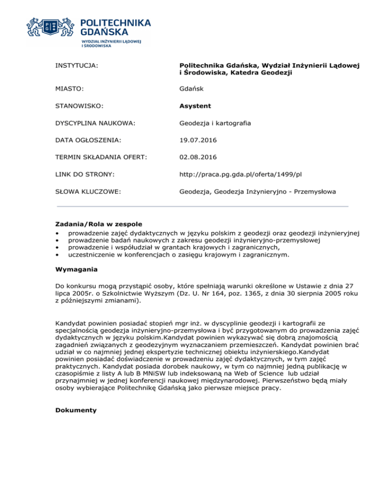 INSTYTUCJA: Politechnika Gdańska, Wydział Inżynierii Lądowej i Środowiska, Katedra Geodezji MIASTO: Gdańsk STANOWISKO: Asystent DYSCYPLINA NAUKOWA: Geodezja i kartografia DATA OGŁOSZENIA: 19.07.2016 TERMIN SKŁADANIA OFERT: 02.08.2016 LINK DO STRONY: http://praca.pg.gda.pl/oferta/1499/pl SŁOWA KLUCZOWE: Geodezja, Geodezja Inżynieryjno - Przemysłowa Zadania/Rola w zespole • • • • prowadzenie zajęć dydaktycznych w języku polskim z geodezji oraz geodezji inżynieryjnej prowadzenie badań naukowych z zakresu geodezji inżynieryjno-przemysłowej prowadzenie i współudział w grantach krajowych i zagranicznych, uczestniczenie w konferencjach o zasięgu krajowym i zagranicznym. Wymagania Do konkursu mogą przystąpić osoby, które spełniają warunki określone w Ustawie z dnia 27 lipca 2005r. o Szkolnictwie Wyższym (Dz. U. Nr 164, poz. 1365, z dnia 30 sierpnia 2005 roku z późniejszymi zmianami). Kandydat powinien posiadać stopień mgr inż. w dyscyplinie geodezji i kartografii ze specjalnością geodezja inżynieryjno-przemysłowa i być przygotowanym do prowadzenia zajęć dydaktycznych w języku polskim.Kandydat powinien wykazywać się dobrą znajomością zagadnień związanych z geodezyjnym wyznaczaniem przemieszczeń. Kandydat powinien brać udział w co najmniej jednej ekspertyzie technicznej obiektu inżynierskiego.Kandydat powinien posiadać doświadczenie w prowadzeniu zajęć dydaktycznych, w tym zajęć praktycznych. Kandydat posiada dorobek naukowy, w tym co najmniej jedną publikację w czasopiśmie z listy A lub B MNiSW lub indeksowaną na Web of Science lub udział przynajmniej w jednej konferencji naukowej międzynarodowej. Pierwszeństwo będą miały osoby wybierające Politechnikę Gdańską jako pierwsze miejsce pracy. Dokumenty 1. 2. 3. 4. 5. 6. 7. 8. 9. Podanie skierowane do J.M. Rektora CV Odpis dyplomu uzyskania stopnia mgra inż. w dyscyplinie geodezja i kartografia Kwestionariusz osobowy Informacja o dorobku naukowym i dydaktycznym Opinia lub oświadczenie samodzielnego pracownika naukowego Oświadczenie samodzielnego pracownika naukowego o udziale Kandydata w ekspertyzie technicznej obiektu inżynierskiego Oświadczenie samodzielnego pracownika naukowego o prowadzeniu przez Kandydata zajęć dydaktycznych: teoretycznych i praktycznych. 8. Oświadczenie o wyrażeniu zgody na przetwarzanie danych osobowych zgodnie z Ustawą z dnia 29.08.1997r. o ochronie danych osobowych TERMIN ROZSTRZYGNIĘCIA KONKURSU: 05.09.2016 PLANOWANY TERMIN ZATRUDNIENIA: 01.10.2016 Dokumenty należy złożyć do 02.08.2016 roku w Biurze Wydziału Inżynierii Lądowej i Środowiska Politechniki Gdańskiej, Gmach Główny pok. 156 GG. Gabriela Narutowicza 11/12, 80-233 Gdańsk Prosimy o umieszczenie klauzuli "Wyrażam zgodę na przetwarzanie danych osobowych zawartych w mojej ofercie dla potrzeb niezbędnych przy procesie rekrutacji (zgodnie z Ustawą z dnia 29.08.1997 o Ochronie Danych Osobowych Dz.Ust. nr 133 poz. 883)". Konkurs może zostać zamknięty bez wyłonienia kandydata. Skontaktujemy się z wybranymi osobami. Nadesłanych pocztą ofert nie odsyłamy. Zlecający zastrzegają sobie prawo do odpowiedzi jedynie na wybrane oferty.