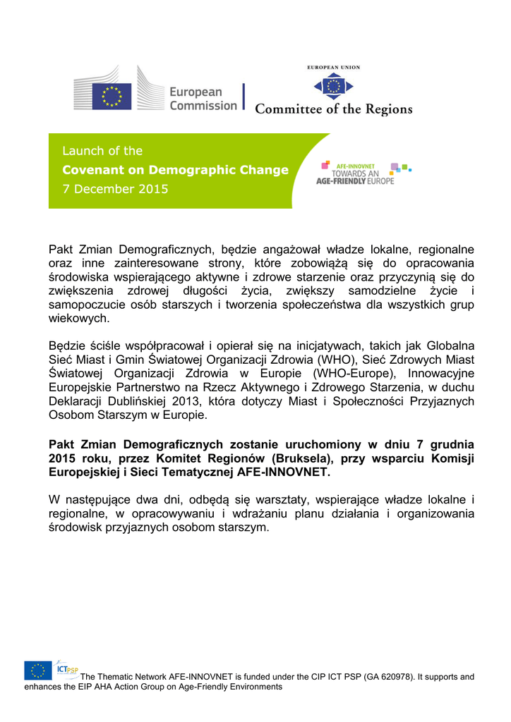 Pakt Zmian Demograficznych, będzie angażował władze lokalne, regionalne oraz inne zainteresowane strony, które zobowiążą się do opracowania środowiska wspierającego aktywne i zdrowe starzenie oraz przyczynią się do zwiększenia zdrowej długości życia, zwiększy samodzielne życie i samopoczucie osób starszych i tworzenia społeczeństwa dla wszystkich grup wiekowych. Będzie ściśle współpracował i opierał się na inicjatywach, takich jak Globalna Sieć Miast i Gmin Światowej Organizacji Zdrowia (WHO), Sieć Zdrowych Miast Światowej Organizacji Zdrowia w Europie (WHO-Europe), Innowacyjne Europejskie Partnerstwo na Rzecz Aktywnego i Zdrowego Starzenia, w duchu Deklaracji Dublińskiej 2013, która dotyczy Miast i Społeczności Przyjaznych Osobom Starszym w Europie. Pakt Zmian Demograficznych zostanie uruchomiony w dniu 7 grudnia 2015 roku, przez Komitet Regionów (Bruksela), przy wsparciu Komisji Europejskiej i Sieci Tematycznej AFE-INNOVNET. W następujące dwa dni, odbędą się warsztaty, wspierające władze lokalne i regionalne, w opracowywaniu i wdrażaniu planu działania i organizowania środowisk przyjaznych osobom starszym. The Thematic Network AFE-INNOVNET is funded under the CIP ICT PSP (GA 620978). It supports and enhances the EIP AHA Action Group on Age-Friendly Environments 8-9 Grudnia 2015r., Bruksela “Innowacje dla środowisk przyjaznych osobom starszym w Europie: dołącz do AFE-INNOVNET i warsztatów dla decydentów AFEE” Głównym celem tych warsztatów, jest wspieranie praktycznego wdrażania Paktu. Dlatego właśnie, dwudniowe wydarzenia, otwarte są dla ekspertów i decydentów, zarówno ze środowisk, które już zobowiązały się do działań na rzecz społeczności przyjaznych osobom starszym i rozważają te sposoby na przyszłość. Po przedstawieniu wyników i narzędzi AFE- INNOVNET i AFEE (Środowisk Przyjaznych Osobom Starszym w Europie, Biuro Regionalne WHO w Europie) podczas sesji plenarnej, uczestnicy utworzą mniejsze grupy dyskusyjne, jak władze lokalne i regionalne, mogą wykorzystać doświadczenie innych, w opracowaniu i wdrożeniu planów działania dotyczących środowisk przyjaznych osobom starszym. Warsztaty te będą obejmować szeroki zakres tematów, od podejścia partycypacyjnego do wstępnej oceny i planowania potrzeb, aby przy projektowaniu planów działania przy współpracy międzysektorowej, definiować produkty i wyniki oraz monitorować ocenę wyników. Oba wydarzenia mogą pomieścić tylko określoną liczbę uczestników. Jeżeli są państwo zainteresowani, prosimy o wypełnienie formularza. Osoba kontaktowa: Julia Wadoux, AFE-INNOVNET Koordynator Projektu, [email protected] Strona internetowa AFE-INNOVNET :www.afeinnovnet.eu Strona internetowa AFEE : http://www.euro.who.int/en/health-topics/Life-stages/healthyageing/activities/age-friendly-environments-in-europe-afee The AFEE Technical Proposal is supported by DG Employment, social affairs and inclusion (04 04 01 02 – PROGRESS – Social Protection and Social Inclusion) The AFE-INNOVNET Thematic Network is funded under the CIP ICT PSP (GA 620978). It supports and enhances the EIP AHA Action Group on Age-Friendly Environments