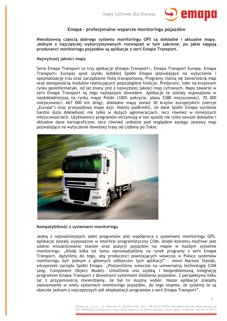 mapy cyfrowe dla biznesu Emapa – profesjonalne wsparcie monitoringu pojazdów Nieodzowną częścią dobrego systemu monitoringu GPS są dokładne i aktualne mapy. Jednym z najczęściej wykorzystywanych rozwiązań w tym zakresie, po jakie sięgają producenci monitoringu pojazdów są aplikacje z serii Emapa Transport. NajwyŜszej jakości mapy Seria Emapa Transport to trzy aplikacje (Emapa Transport+, Emapa Transport Europa, Emapa Transport+ Europa) spod szyldu łódzkiej Spółki Spółki Emapa pozwalające na wytyczanie i optymalizację tras oraz zarządzanie flotą transportową. Programy róŜnią się zawartością map oraz dostępnością modułów realizujących poszczególne funkcje. Producent, lider na krajowym rynku geoinformatyki, od lat znany jest jest z najwyŜszej jakości map cyfrowych. Mapy zawarte w serii Emapa Transport są tego najlepszym dowodem. Aplikacje te zostały wyposaŜone w najdokładniejszą na rynku mapę Polski (100% pokrycia, plany 5380 miejscowości, 70 000 miejscowości, 667 000 km dróg), dokładne mapy ponad 30 krajów europejskich (wersje „Europa”) oraz przejazdową mapę Azji. NaleŜy podkreślić, Ŝe dane Spółki Emapa wyróŜnia bardzo duŜa dokładność nie tylko w duŜych aglomeracjach, lecz równieŜ w mniejszych miejscowościach. UŜytkownicy programów programów otrzymują w ten sposób nie tylko zawsze dokładne i aktualne dane kartograficzne, lecz równieŜ unikalne pod względem zasięgu zestawy map pozwalające na wytyczenie dowolnej trasy od Lizbony po Tokio. Kompatybilność z systemami monitoringu Jedną z najwaŜniejszych zalet programów jest współpraca z systemami monitoringu GPS. Aplikacje zostały wyposaŜone w interfejs programistyczny COM, dzięki któremu moŜliwe jest zdalne wizualizowanie stanów oraz pozycji pojazdów na mapie w kaŜdym systemie monitoringu. „Kiedy kilka lat temu wprowadzaliśmy na rynek programy z serii Emapa Transport, dąŜyliśmy do tego, aby producenci powstających wówczas w Polsce systemów monitoringu byli jednym z głównych odbiorców tych aplikacji” – mówi Mariusz Stasiak, wiceprezes zarządu Spółki Emapa. „Postawiliśmy wówczas na uniwersalną technologię COM (ang. Component Object Model). UmoŜliwia ona szybką i bezproblemową integrację programów Emapa Transport z dowolnymi systemami śledzenia pojazdów. Z perspektywy kilku lat z przyjemnością stwierdzamy, Ŝe był to słuszny wybór. Nasze aplikacje znalazły zastosowanie w wielu systemach monitoringu pojazdów, do tego stopnia, Ŝe systemy te są obecnie jednym z najczęstszych pól eksploatacji programów z serii Emapa Transport”. 1 Emapa sp. z o.o., ul. Łąkowa Ł 11, 90-562 Łódź,, tel.: +48 42 633 9279, [email protected], www.emapa.pl KRS: 0000003046, Sąd S d Rejonowy w Łodzi, kapitał zakładowy 100.000 PLN opłacony w całości, Regon: 472865527, NIP:725-18-08-677 NIP:725 mapy cyfrowe dla biznesu Kompleksowe zarządzanie zarządza transportem Współpraca z systemami monitoringu jest tylko jedną z licznych funkcji tych zaawansowanych programów. Spośród innych naleŜy wymienić m.in. wytyczanie trasy (najkrótszej, najszybszej, najtańszej) i jej optymalizację, czyli uszeregowanie wielu wielu punktów trasy w najlepszym z moŜliwych porządku, tak, aby niepotrzebnie nie nadkładać kilometrów. Co więcej, aplikacje podczas wytyczania trasy biorą pod uwagę restrykcje drogowe przypisane do poszczególnych rodzajów pojazdów (wysokość wiaduktów, nośność nośność dróg), aktualne utrudnienia w ruchu pobierane on-line line z serwera producenta (np. roboty drogowe), jak równieŜ umoŜliwiają zbudowanie własnej bazy utrudnień. Programy pozwalają ponadto na import własnej bazy obiektów (i np. wykorzystanie ich podczas wytyczania wytyczania trasy) oraz stworzenie bazy pojazdów i kierowców wraz z określeniem ich parametrów (m.in. gabaryty pojazdu, prędkość na róŜnych typach dróg, pojemność baku czy czas rozpoczęcia pracy kierowcy, czas jazdy, czas postoju, koszt za godzinę pracy). Docenianą Docenianą zwłaszcza przez firmy transportowe zaletą serii Emapa Transport jest baza kodów pocztowych dla całej Europy oraz moŜliwość wytyczania trasy od jednego do drugiego obszaru kodowego. Przedsiębiorstwa posługujące się właśnie kodami jako głównymi wyznacznikami punktu docelowego znajdują w tych aplikacjach bezcenne wsparcie w codziennej pracy. Oszczędności Wszystko to prowadzi do zasadniczego celu kaŜdej firmy: efektywniejszego działania i generowania oszczędności. Od dokładności i szczegółowości danych mapowych zaleŜy w duŜej mierze skuteczność kaŜdego oprogramowania na nich opartego. Niedokładne i nieaktualne mapy to powód źle obranej trasy, a przez to opóźnień i strat finansowych. Dane Spółki Emapa są gwarancją najwyŜszej jakości, dają pewność, Ŝe kaŜdy ich uŜytkownik otrzymuje to, czego wymaga. Funkcje takie, jak optymalizacja trasy czy restrykcje drogowe (wysokość wiaduktów, nośność dróg) oraz utrudnienia w ruchu pozwalają uniknąć nadkładania drogi i skrócić trasę, co w wymierny sposób przekłada się na znaczne oszczędności. Badania przeprowadzone w przedsiębiorstwach korzystających z programów Emapa Transport wykazały, Ŝe w przypadku duŜych flot pojazdów, aplikacja zwraca się juŜ po miesiącu uŜytkowania! Programy z serii Emapa Transport dają uŜytkownikom bezprecedensowo kompleksową wiedzę na temat potencjalnych i rzeczywistych kosztów taboru transportowego, przez co pozwalają efektywniej wykorzystać posiadane zasoby. Kompatybilność z systemami monitoringu pojazdów sprawia, Ŝe aplikacje aplikacje te są ich idealnym uzupełnieniem: nie tylko stanowią dla nich niezbędny „podkład mapowy”, lecz jednocześnie wzbogacają je o szeroki wachlarz unikalnych funkcji. Dowiedz się więcej na: www.emapa.pl. www.emapa.pl 2 Emapa sp. z o.o., ul. Łąkowa Ł 11, 90-562 Łódź,, tel.: +48 4