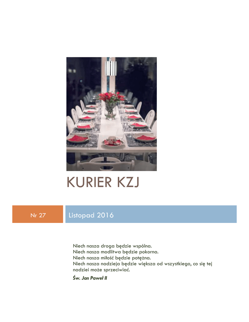 KURIER KZJ Nr 27 Listopad 2016 Niech nasza droga będzie wspólna. Niech nasza modlitwa będzie pokorna. Niech nasza miłość będzie potężna. Niech nasza nadzieja będzie większa od wszystkiego, co się tej nadziei może sprzeciwiać. Św. Jan Paweł II Nr 27 Kurier Koleżeńskiego Zjednoczenia Jazłowieckiego 1 ODESZŁA OD NAS BASIA ROGULSKA Nasza kochana Basia zmarła 9 listopada o godzinie 5 rano. 12 listopada o g. 14 odbyła się Msza św. pożegnalna z wystawieniem Urny z prochami śp Basi w Kościele pw. św. Zygmunta na Bielanach. Pogrzeb miał miejsce 17 listopada w Pilicy, zgodnie z wolą Basi. Podobno nie ma ludzi niezastąpionych, ale Basi będzie nam niezmiernie brakować. Co miesiąc Basia niestrudzenie, mimo coraz gorszego stanu zdrowia, wysyłała do starszych koleżanek, drukowany Kurierek KZJ. Odpoczywaj w pokoju Basiu. ś.p. Julianna Barbara Rogulska. Tak miała wpisane w dokumentach. Dla nas była zawsze Basią. Niezmiernie trudno jest pisać o Niej w czasie przeszłym. Basia była dla nas jedną z tych osób, które stanowią o istocie i jakości Stowarzyszenia, żyła jego sprawami i sprawami koleżanek, szczególnie tych w trudnych sytuacjach – starszych, chorych, samotnych. Była chodzącą encyklopedią wiedzy na te tematy. To Ona wiedziała komu i gdzie należy wysłać „Głos Koleżeński” i „Kurierek”, kto ma … opłacone składki, a kto – prenumeratę. To Ona wiedziała, komu się dzieje coś złego, kto niedomaga i kto potrzebuje wsparcia. Dla siebie o nic nie prosiła – wręcz z trudem i zażenowaniem przyjmowała oferowaną Jej pomoc. To Ona, dopóki mogła, pomimo swoich 86 lat, starała się pomagać wszystkim, którzy tej pomocy potrzebowali, czy to w sferze fizycznej, czy duchowej. Można było się u Niej wyżalić, podzielić się własnymi problemami – zapewniała dyskrecję i życzliwość. Ceniła sobie niezmiernie niezależność i zawsze twierdziła, że daje sobie radę i nic nie potrzebuje. Dlatego tak trudny był dla Niej ostatni okres życia, gdy – uzależniona od otoczenia, znalazła się w szpitalu – bez możliwości wstania, a nawet podniesienia się na łóżku . Dlatego tak ciężko było Jej pogodzić się z perspektywą zamieszkania w domu opieki, po ewentualnym wypisaniu ze szpitala. Bóg wysłuchał Jej próśb i zabrał Ją wcześniej do siebie, gdzie ma przygotowanych dla nas „mieszkań wiele”. Była na to gotowa i myślę, że się tego spodziewała. Gdy byłam u Niej w szpitalu we wtorek w południe nie sądziłam, że widzę Ją po raz ostatni. Powiedziałam, jak zwykle, wychodząc: „ Do widzenia, Basiu, przyjdę jutro.” Odpowiedziała mi – jak nigdy dotąd: „ … Kocham cię, Marta”. To było pożegnanie. Zdałam sobie z tego sprawę następnego dnia rano, gdy zadzwonił telefon i służbowy głos poinformował mnie, że „pani Julianna Rogulska zmarła dziś o godz. 5.55”. Po Mszy św. 12 listopada w Jej parafialnym kościele św. Zygmunta na Bielanach rodzina zabrała Jej prochy do Pilicy, gdzie 17-go została pochowana zgodnie z Jej wolą w grobie rodzinnym. Ale tu została pamięć o Niej. Będziemy Ją widzieć taką, jaką była za życia – serdeczną, uczynną, oddaną innym, solidną – Człowieka przez duże „C”. Jak powiedział kiedyś Prymas Tysiąclecia – Stefan Kardynał Wyszyński: „ ...Nie wystarczy urodzić się człowiekiem, trzeba jeszcze być człowiekiem”. Ona była. ZAPRASZAMY W WARSZAWIE 11 GRUDNIA „Rodzisz się Dziecino, umierasz Dziecino, Serca nam przepełniasz nadzieją i łzą.” Drogie Koleżanki, W tym szczególnym czasie adwentowej refleksji, kiedy to w skupieniu przygotowujemy się do Świąt Bożego Narodzenia, w ciszy oczekiwania na wigilijna gwiazdę, prosimy Boga aby przepełniał nasze serca pokojem. Życzymy naszym drogim Koleżankom, gdziekolwiek są, rodzinnego, radosnego i błogosławionego przeżywania tego szczególnego czasu. Nr 27 Kurier Koleżeńskiego Zjednoczenia Jazłowieckiego 2 Serdecznie zapraszamy do Sióstr na Kabaty w niedzielę 11 grudnia o g. 12 na Mszę św. w intencji Sióstr i ich wszystkich wychowanek i wychowanków, a po Mszy świętej na spotkanie opłatkowe w szkolnym refektarzu. Podzielimy się opłatkiem z Siostrami, z dawno niewidzianymi koleżankami, będzie jak zwykle gwarno i wesoło przy herbatce i ciasteczkach. Zapraszamy, Koło warszawskie KZJ ŻYCZENIA OD ZARZĄDU KZJ Kochani: Członkinie, Członkowie i Sympatycy KZJ! Znów, jak co roku, stajemy na progu Adwentu i nowego roku liturgicznego w oczekiwaniu na przyjście Dzieciątka. Sytuacja co roku ta sama, a jednak za każdym razem nieco inna, w miarę jak zmienia się świat wokół nas i jak zmieniamy się my sami. Jedni dorastają i dojrzewają, inni – którzy dorastanie mają już za sobą – po prostu się starzeją. Każda z tych zmian wpływa na nasze odbieranie i postrzeganie świata, a także zachodzących w nim zdarzeń. Mamy za sobą rok bogaty w wydarzenia o wielkiej wadze w wymiarze duchowym. Był to rok Miłosierdzia, rok 1050. rocznicy Chrztu Polski, rok odbywających się w naszym kraju Światowych Dni Młodzieży i wreszcie rok realizacji podjętego przed wielu laty przez nasz naród zobowiązania budowy Świątyni Opatrzności Bożej. W ostatnich dniach roku liturgicznego miało też miejsce: uroczyste obwołanie Chrystusa – Królem Polski. Myślę, że Adwent – czas oczekiwania ale też czas pewnych podsumowań – jest dobrym momentem do zatrzymania się w codziennym biegu, do zastanowienia się, czym dla nas były te wszystkie wydarzenia i w jakim stopniu miały wpływ na nasze życie osobiste. W świetle tych zastanowień życzę nam wszystkim, żebyśmy umieli przekuć te zbiorowe doświadczenia na nasze własne, żeby narodziny tego Dziecięcia, które wciąż na nowo przychodzi, by królować miłością – dały nam wszystkim radość i pokój duszy, by nauczyły nas dzielić się nimi tak, żeby nikt nie czuł się