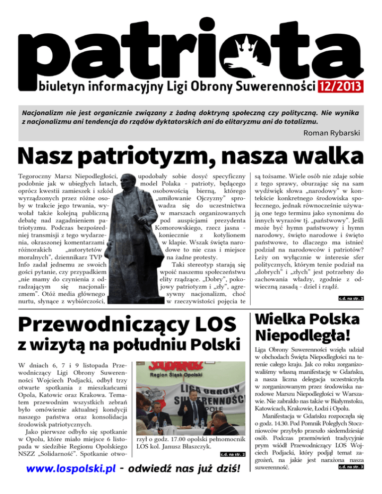 ' 12/2013 biuletyn informacyjny Ligi Obrony Suwerennosci asdasd Nacjonalizm nie jest organicznie związany z żadną doktryną społeczną czy polityczną. Nie wynika z nacjonalizmu ani tendencja do rządów dyktatorskich ani do elitaryzmu ani do totalizmu. Roman Rybarski Nasz patriotyzm, nasza walka Tegoroczny Marsz Niepodległości, podobnie jak w ubiegłych latach, oprócz kwestii zamieszek i szkód wyrządzonych przez różne osoby w trakcie jego trwania, wywołał także kolejną publiczną debatę nad zagadnieniem patriotyzmu. Podczas bezpośredniej transmisji z tego wydarzenia, okraszonej komentarzami różnorakich „autorytetów moralnych”, dziennikarz TVP Info zadał jednemu ze swoich gości pytanie, czy przypadkiem „nie mamy do czynienia z odradzającym się nacjonalizmem”. Otóż media głównego nurtu, słynące z wybiórczości, upodobały sobie dosyć specyficzny model Polaka - patrioty, będącego osobowością bierną, którego „umiłowanie Ojczyzny” sprowadza się do uczestnictwa w marszach organizowanych pod auspicjami prezydenta Komorowskiego, rzecz jasna koniecznie z kotylionem w klapie. Wszak święta narodowe to nie czas i miejsce na żadne protesty. Taki stereotyp starają się wpoić naszemu społeczeństwu elity rządzące. „Dobry”, pokojowy patriotyzm i „zły”, agresywny nacjonalizm, choć w rzeczywistości pojęcia te Przewodniczący LOS z wizytą na południu Polski W dniach 6, 7 i 9 listopada Przewodniczący Ligi Obrony Suwerenności Wojciech Podjacki, odbył trzy otwarte spotkania z mieszkańcami Opola, Katowic oraz Krakowa. Tematem przewodnim wszystkich zebrań było omówienie aktualnej kondycji naszego państwa oraz konsolidacja środowisk patriotycznych. Jako pierwsze odbyło się spotkanie w Opolu, które miało miejsce 6 listopada w siedzibie Regionu Opolskiego NSZZ „Solidarność”. Spotkanie otwo- rzył o godz. 17.00 opolski pełnomocnik LOS kol. Janusz Błaszczyk. c.d. na str. 2 www.lospolski.pl - odwiedź nas już dziś! są tożsame. Wiele osób nie zdaje sobie z tego sprawy, oburzając się na sam wydźwięk słowa „narodowy” w kontekście konkretnego środowiska społecznego, jednak równocześnie używają one tego terminu jako synonimu do innych wyrazów tj. „państwowy”. Jeśli może być hymn państwowy i hymn narodowy, święto narodowe i święto państwowe, to dlaczego ma istnieć podział na narodowców i patriotów? Leży on wyłącznie w interesie sfer politycznych, którym tenże podział na „dobrych” i „złych” jest potrzebny do zachowania władzy, zgodnie z odwieczną zasadą - dziel i rządź. c.d. na str. 2 Wielka Polska Niepodległa! Liga Obrony Suwerenności wzięła udział w obchodach Święta Niepodległości na terenie całego kraju. Jak co roku zorganizowaliśmy własną manifestację w Gdańsku, a nasza liczna delegacja uczestniczyła w zorganizowanym przez środowiska narodowe Marszu Niepodległości w Warszawie. Nie zabrakło nas także w Białymstoku, Katowicach, Krakowie, Łodzi i Opolu. Manifestacja w Gdańsku rozpoczęła się o godz. 14.30. Pod Pomnik Poległych Stoczniowców przybyło przeszło siedemdziesiąt osób. Podczas przemówień tradycyjnie prym wiódł Przewodniczący LOS Wojciech Podjacki,str.który podjął temat za2 grożeń, na jakie jest narażona nasza c.d. na str. 3 suwerenność. Nasz patriotyzm, nasza walka - c.d. Tymczasem wydarzenia, które kultywujemy podczas wszelakich obchodów, nie dają żadnych podstaw ku temu, żeby uczynić z nich stricte historyczne obchody i zmarginalizować aktualną kondycję naszego państwa i sytuację materialną narodu. Najważniejsze polskie święta narodowe zostały ustanowione ku pamięci walk naszych rodaków o suwerenność Państwa Polskiego. Jeden z ojców naszej Niepodległości, Roman Dmowski, był organizatorem wielkiej manifestacji Ligi Polskiej w 100. rocznicę Konstytucji 3 Maja w okupowanej przez Imperium Rosyjskie Warszawie. Wtedy Naród Polski doskonale rozumiał znaczenie tego wydarzenia i nic innego, jak właśnie świadomość poświęcenia dla Ojczyzny i łączność duchowa z poprzednimi pokoleniami, doprowadziły do odzyskania przez Polskę Niepodległości. Dzisiaj, gdy naszą suwerenność ogranicza Przewodniczący LOS z wizytą na południu Polski - c.d. Od lewej: Przewodniczący LOS Wojciech Podjacki i pełnomocnik LOS na Okręg Śląski i Opolski Janusz Błaszczyk, podczas spotkania w Katowicach Następnie głos zabrał Wojciech Podjacki, który w swoim wystąpieniu przybliżył zgromadzonym działalność naszego Ruchu, a także zaapelował o dalsze wzmożone działania, w celu odzyskania przez Polskę pełnej suwerenności. Przemówienie wzbudziło gorący aplauz uczestników i było parokrotnie przerywane żywiołowymi oklaskami. Ostatnim elementem spotkania był panel dyskusyjny, w którym Przewodniczący LOS odpowiadał na wiele pytań dotyczących obecnego położenia Polski i możliwości poprawy naszej fatalnej sytuacji społeczno-politycznej. Spotkanie zakończyło się po godz. 20.00 i zgromadziło kilkadziesiąt osób. Więcej materiałów na stronie 2 internetowej Okręgu Opolskiego LOS. Dzień później Przewodniczący Ligi Obrony Suwerenności odwiedził Katowice, gdzie spotkał się z miekszańcami w Domu Kultury „Marchołt”. Spotkanie poprzedzone było pikietą przeciw obecności w przestrzeni publicznej pomnika wdzięczności Armii Czerwonej w Katowicach, zorganizowaną o godz. 16.00 przez miejscowych działaczy KPN-OP z Adamem Słomką na czele. W proteście uczestniczył także Przewodniczący LOS, który miał przyjemność wygłosić okolicznościowe przemówienie. Spotkanie z Wojciechem Podjackim rozpoczęło się godzinę później i trwało ok. 3 godzin. Moderatorem spotkania ponownie był się na rzecz Unii Europejskiej, a władzę w państwie sprawują osoby, które prowadzą je do upadku i którym na państwie nie zależy, wmawia się nam, że wszelka forma troski o 