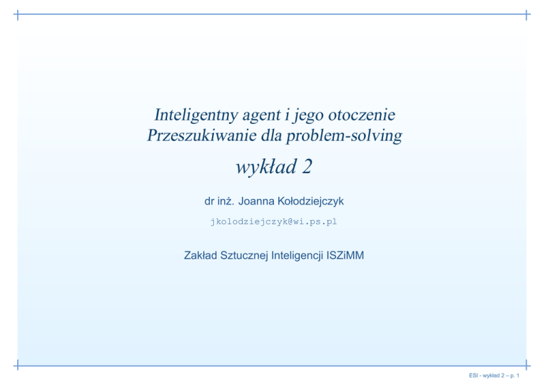Inteligentny agent i jego otoczenie Przeszukiwanie dla problem-solving wykład 2 dr inż. Joanna Kołodziejczyk [email protected] Zakład Sztucznej Inteligencji ISZiMM ESI - wykład 2 – p. 1 Plan wykładu 1. Cz˛eść pierwsza (a) Agent i jego otoczenie (b) Racjonalność (c) Ocena działania, otoczenie, czujniki (d) Typy środowisk w jakim może pracować agent (e) Typy agentów 2. Cz˛eść druga (a) Agent do problem-solving (b) Przykłady zadań problem-solving (c) Sformułowanie problemu (d) Drzewo jako struktura danych dla zadań problem-solving (e) Podstawowe algorytmy przeszukiwania ESI - wykład 2 – p. 2 Agent i jego otoczenie sensors percepts ? environment actions agent actuators Inteligentny agent to np.: człowiek, robot, softbot, termostat, itp. Funkcja agenta odwzorowuje percepcje˛ (odczyty z czujników, klawiatury) lub historie˛ takich odczytów na akcje: f : P∗ → A Program agenta uruchamiany jest w urzadzeniu ˛ (architektura) by wygenerować f . Czyli jest to nic innego jak implementacja funkcji agenta. ESI - wykład 2 – p. 3 Odkurzacz i jego świat A B Percepcja: lokalizacja i stan podłogi, np., [A, Brud] Akcja: Lewo, P rawo, Odkurz , N ic ESI - wykład 2 – p. 4 Agent - odkurzacz 1 2 3 4 Sekwencje percepcji Działanie [A, Czysto] P rawo [A, Brud] Odkurz [B, Czysto] Lewo [B, Brud] Odkurz [A, Czysto], [A, Czysto] P rawo [A, Czysto], [A, Brud] Odkurz [A, Czysto], [B, Czysto] . . . Lewo . . . function Reflex-Vacuum-Agent(location,status) return action if status = Brud then return Odkurz else if location = A then return Prawo else if location = B then return Lewo ESI - wykład 2 – p. 5 Oczekiwane zachowanie agenta Funkcja, która˛ agent ma wypełnić ma dawać takie efekty, iż zachowanie agenta bedzie ˛ można określić jako „dobre”. W przybliżeniu dobre akcje, to takie, które przynosza˛ jak najwiecej ˛ korzyści. Zatem należy znaleźć sposób na mierzenie odnoszonych przez agenta korzyści (miare˛ jego sukcesu). Pełna specyfikacja agenta obejmuje: • jak mierzyć korzyści z działania agenta, • w jakim środowisku (z czym ma kontakt) agent i jak to wpływa na jego zachowanie o ile w ogóle, • jak i jakie informacje przekazywane sa˛ do agenta, • jak i jakie informacje stanowia˛ informacje˛ zwrotna˛ od agenta. ESI - wykład 2 – p. 6 Mierzenie korzyści z działania agaetna Miara osiagów ˛ to kryterium sukcesu. Nie ma uniwersalnego miernika dla agentów. Dla każdego zadania konstruktor określa takowa˛ miare. ˛ Przykład miary osiagów ˛ dla agenta-odkurzacza: • Ile razy odkurzono brud w ciagu ˛ ośmiogodzinnej zmiany. • Jedno pole sprzatane ˛ w jednostce czasu T . • Jeden punkt za posprzatanie ˛ pola w jednostce czasu minus jeden punkt za ruch, który powoduje zużycie energii. Lepiej konstruować miare˛ osiagów ˛ według tego jak agent ma zmieniać środowisko, a nie jak ma sie˛ zachowywać w oderwaniu od niego. ESI - wykład 2 – p. 7 Agent racjonalny Agent racjonalny wybiera taka˛ akcje˛ dla pojawiajacej ˛ sie˛ sekwencji wejściowej, która maksymalizuje oczekiwana˛ wartość miary osiagów, ˛ określona˛ na podstawie wejść i wiedzy jaka jest w agencie zapamietana. ˛ Racjonalny 6= wszechwiedzacy ˛ – percepcja nie musi dostarczać całkowitej wymaganej informacji Racjonalny 6= jasnowidzacy ˛ – wynik akcji nie musi być zgodny z oczekiwaniami Racjonalny 6= odnoszacy ˛ zawsze sukces Racjonalny → zbiera informacje (zwiekszenie ˛ szans na nagrode), ˛ uczy sie˛ (rozszerzanie wiedzy), jest autonomiczny (wiecej ˛ niż tylko wbudowana wiedza - zmiana zachowań na podstawie doświadczenia). ESI - wykład 2 – p. 8 Automatyczna taksówka Aby stworzyć racjonalnego agenta należy określić PEAS, czyli Performace, Environement, Actuators, Sensors. Ważne jest, że agent mysi działać zgodnie z oczekiwaniami czyli miara˛ osiagów. ˛ Rozważmy agenta - automatyczna taksówka: 1. Ocena osiagów ˛ 2. Otoczenie 3. Aktualizatory 4. Czujniki ESI - wykład 2 – p. 9 Automatyczna taksówka Aby stworzyć racjonalnego agenta należy określić PEAS, czyli Performace, Environement, Actuators, Sensors. Ważne jest, że agent mysi działać zgodnie z oczekiwaniami czyli miara˛ osiagów. ˛ Rozważmy agenta - automatyczna taksówka: 1. Ocena osiagów ˛ — bezpieczeństwo, cel podróży, profit, legalność, komfort 2. Otoczenie — ulice, ruch uliczny, piesi, pogoda 3. Aktualizatory — sterowanie kierunkiem ruchu, gazem, hamulcem, klakson, mikrofon 4. Czujniki — kamera wideo, predkościomierz, ˛ wskaźnik poziomu paliwa, czujniki silnika, klawiatura, GPS ESI - wykład 2 – p. 9 Agent zakupów internetowych 1. Ocena osiagów ˛ 2. Otoczenie 3. Aktualizatory 4. Czujniki ESI - wykład 2 – p. 10 Agent zakupów internetowych 1. Ocena osiagów ˛ — cena, jakość, zgodność z upodobaniami, efektywność 2. Otoczenie — obecne i przyszłe strony WWW, sprzedawca, dostawca 3. Aktualizatory — wyświetlacz dla użytkownika, śledzenie linków, wypełnianie formularzy 4. Czujniki — tekst, grafika, pismo ESI - wykład 2 – p. 10 Typy otoczenia Krzyżówka Warcaby Analiza obrazów taksówka Obserwowalne Deterministyczne Epizodyczne Statyczne Dyskretne Pojedynczy agent ESI - wykład 2 – p. 11 Typy otoczenia Otoczenie w pełni obserwowalne (czujniki wykrywaja˛ wszystkie istotne aspekty, które sa˛ niezbedna ˛ dla wykonania dobrej akcji) lub cz˛eściowo obserwowalne. Obserwowalne Krzyżówka Warcaby Analiza obrazów taksówka w pełni w pełni w pełni cz˛eściowo Deterministyczne Epizodyczne Statyczne Dyskretne Pojedynczy agent ESI - wykład 2 – p. 11 Typy otoczenia Deterministyczne lub stochastyczne: jeżeli kolejny stan otoczenia jest całkowicie określony na podstawie stanu bieżacego ˛ i wykonanej akcji, to otoczenie jest deterministyczne. Niepewność skutkuje otoczeniem stochatycznym. Obserwowalne Deterministyczne Krzyżówka Warcaby Analiza obrazów taksówka w pełni w pełni w pełni