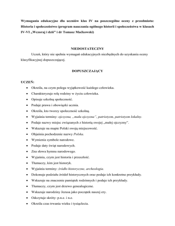 Wymagania edukacyjne dla uczniów klas IV na poszczególne oceny z przedmiotu: Historia i społeczeństwo (program nauczania ogólnego historii i społeczeństwa w klasach IV-VI „Wczoraj i dziś” i dr Tomasz Maćkowski) NIEDOSTATECZNY Uczeń, który nie spełnia wymagań edukacyjnych niezbędnych do uzyskania oceny klasyfikacyjnej dopuszczającej. DOPUSZCZAJĄCY UCZEŃ: Określa, na czym polega wyjątkowość każdego człowieka. Charakteryzuje rolę rodziny w życiu człowieka. Opisuje szkolną społeczność. Podaje prawa i obowiązki ucznia. Określa, kto tworzy społeczność szkolną. Wyjaśnia terminy: ojczyzna, „mała ojczyzna”, patriotyzm, patriotyzm lokalny. Podaje nazwy miejsc związanych z historią swojej „małej ojczyzny”. Wskazuje na mapie Polski swoją miejscowość. Objaśnia pochodzenie nazwy Polska. Wymienia symbole narodowe. Podaje daty świąt narodowych. Zna słowa hymnu narodowego. Wyjaśnia, czym jest historia i przeszłość. Tłumaczy, kim jest historyk. Wyjaśnia terminy: źródło historyczne, archeologia. Dokonuje podziału źródeł historycznych oraz podaje ich konkretne przykłady. Wskazuje na znaczenie pamiątek rodzinnych i podaje ich przykłady. Tłumaczy, czym jest drzewo genealogiczne. Wskazuje narodziny Jezusa jako początek naszej ery. Odczytuje skróty: p.n.e. i n.e. Określa czas trwania wieku i tysiąclecia. Rysuje oś czasu i umieszcza na niej daty. Umie określić na podstawie daty rocznej wiek. Określa datę danego wydarzenia, używając określeń I połowa lub II połowa danego wieku. Tłumaczy, czym są skala i legenda mapy. Odczytuje z mapy podstawowe informacje. Omawia znaczenie umiejętności rozpalania ognia dla praludzi. Wymienia narzędzia, którymi posługiwali się praludzie. Wyjaśnia, czym była ziemianka. Wskazuje na mapie rzeki Eufrat, Tygrys, Nil oraz miasto Babilon. Przedstawia różne rodzaje pisma: obrazkowe, klinowe i alfabetyczne. Wskazuje na mapie starożytną Grecję i Ateny. Wyjaśnia termin demokracja. Wymienia rodzaje sztuk granych w teatrze greckim. Wymienia najważniejszych greckich bogów – Zeus, Hera, Posejdon, Afrodyta, Atena, Hades, Ares, Hefajstos, Apollo, Hermes. Określa, gdzie odbywały się najsłynniejsze igrzyska organizowane na cześć Zeusa. Przedstawia przebieg antycznych igrzysk. Wskazuje na mapie Rzym, Kartaginę i Półwysep Apeniński oraz największy zasięg terytorialny Imperium Rzymskiego. Wyjaśnia, kim byli gladiatorzy. Wskazuje na mapie Palestynę. Przedstawia, kim był Jezus z Nazaretu. DOSTATECZNY UCZEŃ: Określa, na czym polega wyjątkowość każdego człowieka. Charakteryzuje rolę rodziny w życiu człowieka. Opisuje szkolną społeczność. Podaje prawa i obowiązki ucznia. Określa, kto tworzy społeczność szkolną. Wyjaśnia terminy: ojczyzna, „mała ojczyzna”, patriotyzm, patriotyzm lokalny. Podaje nazwy miejsc związanych z historią swojej „małej ojczyzny”. Wskazuje na mapie Polski swoją miejscowość. Objaśnia pochodzenie nazwy Polska. Wymienia symbole narodowe. Podaje daty świąt narodowych. Zna słowa hymnu narodowego. Wyjaśnia, czym jest historia i przeszłość. Tłumaczy, kim jest historyk. Wyjaśnia terminy: źródło historyczne, archeologia. Dokonuje podziału źródeł historycznych oraz podaje ich konkretne przykłady. Wskazuje na znaczenie pamiątek rodzinnych i podaje ich przykłady. Tłumaczy, czym jest drzewo genealogiczne. Wskazuje narodziny Jezusa jako początek naszej ery. Odczytuje skróty: p.n.e. i n.e. Określa czas trwania wieku i tysiąclecia. Rysuje oś czasu i umieszcza na niej daty. Umie określić na podstawie daty rocznej wiek. Określa datę danego wydarzenia, używając określeń I połowa lub II połowa danego wieku. Tłumaczy, czym są skala i legenda mapy. Odczytuje z mapy podstawowe informacje. Omawia znaczenie umiejętności rozpalania ognia dla praludzi. Wymienia narzędzia, którymi posługiwali się praludzie. Wyjaśnia, czym była ziemianka. Wskazuje na mapie rzeki Eufrat, Tygrys, Nil oraz miasto Babilon. Przedstawia różne rodzaje pisma: obrazkowe, klinowe i alfabetyczne. Wskazuje na mapie starożytną Grecję i Ateny. Wyjaśnia termin demokracja. Wymienia rodzaje sztuk granych w teatrze greckim. Wymienia najważniejszych greckich bogów – Zeus, Hera, Posejdon, Afrodyta, Atena, Hades, Ares, Hefajstos, Apollo, Hermes. Określa, gdzie odbywały się najsłynniejsze igrzyska organizowane na cześć Zeusa. Przedstawia przebieg antycznych igrzysk. Wskazuje na mapie Rzym, Kartaginę i Półwysep Apeniński oraz największy zasięg terytorialny Imperium Rzymskiego. Wyjaśnia, kim byli gladiatorzy. Wskazuje na mapie Palestynę. Przedstawia, kim był Jezus z Nazaretu. Wymienia potrzeby człowieka. Wyjaśnia termin społeczność. Tłumaczy, jakie przysługują mu prawa i jakie ma obowiązki w rodzinie. Omawia kompetencje dyrektora szkoły, rady pedagogicznej, rady rodziców oraz rady szkoły. Wyjaśnia, dlaczego do szkolnej społeczności zaliczamy także rodziców. Tłumaczy, czym jest statut szkoły. Określa, czym zajmuje się rada samorządu uczniowskiego. Wskazuje przykłady działania rady samorządu uczniowskiego w swojej szkole. Podaje przykład postępowania zgodnego z zasadami tolerancji i sprawiedliwości.. Wymienia przykłady konfliktów i sposoby ich rozwiązywania. Przedstawia sposoby zapobiegania konfliktom. Tłumaczy, kim jest patriota. Wymienia postacie związane z historią swojego rodzinnego miasta i regionu. Opisuje problemy społeczno – gospodarcze swojej „małej ojczyzny”. Odnajduje na planie miejscowości siedzibę władz lokalnych. Wyjaśnia znaczenie słowa naród. Wie, kto jest autorem słów hymnu narodowego. Nazywa krainy historyczno – geograficzne Polski. Wyjaśnia terminy: mniejszość narodowa, mniejszość etniczna. Wymienia mniejszości narodowe i etniczne mieszkające w Polsce oraz na wybranych przykładach opisuje ich kulturę i tradycje. Tłumaczy znaczenie słowa Polonia. 