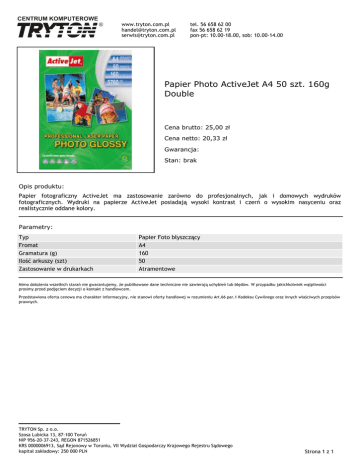 www.tryton.com.pl [email protected] [email protected] tel. 56 658 62 00 fax 56 658 62 19 pon-pt: 10.00-18.00, sob: 10.00-14.00 Papier Photo ActiveJet A4 50 szt. 160g Double Cena brutto: 25,00 zł Cena netto: 20,33 zł Gwarancja: Stan: brak Opis produktu: Papier fotograficzny ActiveJet ma zastosowanie zarówno do profesjonalnych, jak i domowych wydruków fotograficznych. Wydruki na papierze ActiveJet posiadają wysoki kontrast i czerń o wysokim nasyceniu oraz realistycznie oddane kolory. Parametry: Typ Fromat Gramatura (g) Ilość arkuszy (szt) Zastosowanie w drukarkach Papier Foto błyszczący A4 160 50 Atramentowe Mimo dołożenia wszelkich starań nie gwarantujemy, że publikowane dane techniczne nie zawierają uchybień lub błędów. W przypadku jakichkolwiek wątpliwości prosimy przed podjęciem decyzji o kontakt z handlowcem. Przedstawiona oferta cenowa ma charakter informacyjny, nie stanowi oferty handlowej w rozumieniu Art.66 par.1 Kodeksu Cywilnego oraz innych właściwych przepisów prawnych. TRYTON Sp. z o.o. Szosa Lubicka 13, 87-100 Toruń NIP 956-20-37-243, REGON 871526851 KRS 0000006913, Sąd Rejonowy w Toruniu, VII Wydział Gospodarczy Krajowego Rejestru Sądowego kapitał zakładowy: 250 000 PLN Strona 1 z 1