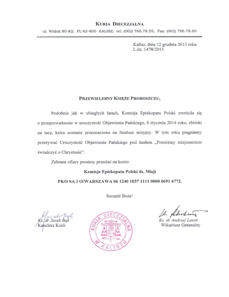 KURIA DIECEZJALNA ul. Widok 80-82; PL 62-800 KALISZ; tel.(062)766.78.55; Fax. (062) 766.78.60 Kalisz, dnia 12 grudnia 2013 roku L.dz. 1478/2013 PRZEWIELEBNY KSIĘŻE PROBOSZCZU, Podobnie jak w ubiegłych latach, Komisja Episkopatu Polski zwróciła się o przeprowadzenie w uroczystość Objawienia Pańskiego, 6 stycznia 2014 roku, zbiórki na tacę, która zostanie przeznaczona na fundusz misyjny. W tym roku pragniemy przeżywać Uroczystość Objawienia Pańskiego pod hasłem „Pomóżmy misjonarzom świadczyć o Chrystusie". Zebrane ofiary prosimy przesłać na konto: Komisja Episkopatu Polski ds. Misji PKO SA I O/WARSZAWA 06 1240 1037 1111 0000 0691 6772. Szczęść Boże! PRZEWODNICZĄCY KOMISJI EPISKOPATU POLSKI DS. MISJI KOMUNIKAT PRZEWODNICZĄCEGO KOMISJI EPISKOPATU POLSKI DS. MISJI NA DZIEŃ POMOCY MISJOM PRZYPADAJĄCY W UROCZYSTOŚĆ OBJAWIENIA PAŃSKIEGO 6 STYCZNIA 2014 R. Umiłowani w Chrystusie Panu, Siostry i Bracia! Dzisiejsza uroczystość, podczas której przeżywamy tajemnicę objawienia się Chrystusa narodom pogańskim, budzi w nas uczucie wdzięczności dla misjonarzy, którzy przynieśli światło wiary na polską ziemię i zaszczepili ją w sercach naszych przodków. Dzięki nim Ewangelia Chrystusa kształtuje nasze życie osobiste i wspólnotowe. Cieszymy się skarbem wiary. Mamy jednak świadomość, że nadal ponad dwa miliardy ludzi na świecie nie słyszało o Chrystusie. Jego nakaz: „Idźcie więc i nauczajcie wszystkie narody, udzielając im chrztu w imię Ojca i Syna, i Ducha Świętego" (Mt 28,19) nadal pozostaje naglącym zadaniem. Trzeba, abyśmy całym sercem włączyli się w misyjny trud Kościoła. Bez względu na to, jakim powołaniem życiowym Bóg nas obdarzył, na mocy chrztu świętego wszyscy odpowiadamy za misje. Wiara zobowiązuje do dzielenia się nią z innymi. Jesteśmy misjonarzami Chrystusa także poprzez sakramenty święte, modlitwę, cierpienie, świadectwo życia i pracę. Przypomniał o tym Jan Paweł II, największy misjonarz naszych czasów, w encyklice „Redemptoris missio". W tym roku rozpoczynamy przygotowania do IV Krajowego Kongresu Misyjnego, który odbędzie się w roku 2015. Mamy zatem okazję, aby odnowić w nas świadomość misyjnej natury Kościoła i naszej odpowiedzialności za misje. Dzisiaj jesteśmy zapraszani, by przyłączyć się do Orszaku Trzech Króli organizowanego w wielu miastach naszej Ojczyzny. Orszak tworzą zwyczajni ludzie, którzy z entuzjazmem i radością chcą wraz z rodzinami oraz przyjaciółmi świętować narodziny Chrystusa. Niech udział w Orszaku uświadomi nam jeszcze dobitniej drogę do wiary Trzech Mędrców. Niech uczy odwagi, pokory i wytrwałości na drodze wiary. Niech przypomina, że mamy także innym pomagać odnaleźć drogę do Chrystusa i wspomagać duchowo i materialnie misjonarzy i misjonarki. Objawienie Pańskie jest też patronalnym świętem Papieskiego Dzieła Misyjnego Dzieci. W Polsce w tym dniu dzieci stają się nowymi członkami tego Dzieła. Na całym świecie tego dnia dzieci należące do Papieskiego Dzieła Komisja Episkopatu Polski ds. Misji ul. Byszewska 1, skr. poczt. 112, 03-729 Warszawa 4 tel. (022) 679 32 35, 743 95 25-26; fax (022) 679 68 95; e-mail: [email protected]; www.misje.pl Konto: PEKAO S.A. I O/Warszawa 06124010371111000006916772 NIP: 527-21-40-918 REGON: 04000181800025 Dziecięctwa Misyjnego łączą się w modlitwie. Przebrane w stroje symbolizujące 5 kontynentów stają się kolędnikami misyjnymi, a zebrane w czasie kolędowania ofiary przekazują swoim rówieśnikom z krajów misyjnych. Dzieci, jako kolędnicy naśladują świętych Trzech Królów, pukając do naszych domów, proszą o datek dla dzieci z Republiki Konga i Demokratycznej Republiki Konga oraz dla wszystkich dzieci krajów misyjnych. Chrystus daje nam dzisiaj możliwość obdarowania Go w tych, którzy są biedni i potrzebujący. On nas zapewnia, że „Wszystko cokolwiek uczyniliśmy jednemu z tych braci najmniejszych, Mnieście uczynili" (Mt 25,40). Dzisiaj możemy dołączyć do świętych Trzech Mędrców, aby Dziecięciu ofiarować swe dary. Uwrażliwiani dzisiaj jesteśmy na działalność misyjną Kościoła oraz wspomaganie tych, którzy niosą orędzie Chrystusa aż po krańce świata. Obchodzimy ten dzień pod hasłem: „Pomóżmy misjonarzom świadczyć o Chrystusie". Obecnie, już 2015 misjonarek i misjonarzy z Polski głosi Ewangelię w 97 krajach świata. Opuścili swe domy rodzinne, wspólnoty i diecezje, by wśród trudności i przeszkód dzielić się skarbem wiary i służyć najuboższym z ubogich. Misjonarze prowadzą działalność charytatywną, edukacyjną i medyczną, stając się znakiem nadziei dla opuszczonych, sierot, starców, bezdomnych i wykluczonych. By prowadzić wspaniałe dzieła ewangelizacyjne, potrzebują naszej pomocy duchowej i materialnej. Wszyscy możemy im pomóc świadczyć o Chrystusie. Dzisiaj, zgodnie z zaleceniem Konferencji Episkopatu Polski zebrane we wszystkich parafiach ofiary są przeznaczone na Krajowy Fundusz Misyjny. Z tego funduszu utrzymuje się również Centrum Formacji Misyjnej w Warszawie, gdzie obecnie 34 osoby przygotowują się do posługi misyjnej. Mamy wśród nich 17 kapłanów diecezjalnych, 3 kapłanów zakonnych, 9 sióstr zakonnych i 5 osób świeckich. W imieniu wszystkich polskich misjonarek i misjonarzy oraz tych, którzy przygotowują się do wyjazdu na misje, składam serdeczne Bóg zapłać za modlitwę i ofiarność, poprzez które wyraża się nasza troska o misje. Życzę Wam, byście wzrastając w wierze doświadczyli tej radości, jaką daje dzielenie się wiarą i miłością z innymi. Z serca wszystkim błogosławię w Imię Ojca i Syna, i Ducha Świętego. Amen. Warszawa - Ełk 11 listopada 2013 r.