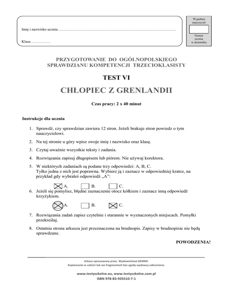 Wypełnia nauczyciel Imię i nazwisko ucznia ……………………………………………………………………………… Numer ucznia w dzienniku Klasa …………… PRZYGOTOWANIE DO OGÓLNOPOLSKIEGO SPRAWDZIANU KOMPETENCJI TRZECIOKLASISTY TEST VI CHŁOPIEC Z GRENLANDII Czas pracy: 2 x 40 minut Instrukcje dla ucznia 1. Sprawdź, czy sprawdzian zawiera 12 stron. Jeżeli brakuje stron powiedz o tym nauczycielowi. 2. Na tej stronie u góry wpisz swoje imię i nazwisko oraz klasę. 3. Czytaj uważnie wszystkie teksty i zadania. 4. Rozwiązania zapisuj długopisem lub piórem. Nie używaj korektora. 5. W niektórych zadaniach są podane trzy odpowiedzi: A, B, C. Tylko jedna z nich jest poprawna. Wybierz ją i zaznacz w odpowiedniej kratce, na przykład gdy wybrałeś odpowiedź „A”: A. B. C. 6. Jeżeli się pomylisz, błędne zaznaczenie otocz kółkiem i zaznacz inną odpowiedź krzyżykiem. A. B. C. 7. Rozwiązania zadań zapisz czytelnie i starannie w wyznaczonych miejscach. Pomyłki przekreślaj. 8. Ostatnia strona arkusza jest przeznaczona na brudnopis. Zapisy w brudnopisie nie będą sprawdzane. POWODZENIA! Arkusz opracowany przez Wydawnictwo GEMMI. Kopiowanie w całości lub we fragmentach bez zgody wydawcy zabronione. www.testyszkolne.eu, www.testyszkolne.com.pl ISBN 978-83-935510-7-1 CHŁOPIEC Z GRENLANDII CZĘŚĆ POLONISTYCZNA Wśród gromady dzieci eskimoskich, bawiących się między namiotami na brzegu morza, rej wodził Anaruk. Słuchali go nie tylko rówieśnicy, ale i starsi chłopcy. Nawet psy chętnie poddawały się jego rozkazom. Anaruk miał dwanaście lat był jednak tak silny, zręczny i odważny, że ojciec jego, Tugto, często zabierał syna ze sobą na polowanie. Anaruk był z tego niezmiernie dumny. Zaprzyjaźniłem się z nim bardzo prędko. Pozwoliłem mu obejrzeć moją broń i podarowałem nóż stalowy, który wzbudził w nim zachwyt. Następnego dnia Anaruk przyprowadził ze sobą swego brata, pięcioletniego Nukuna, żeby i on obejrzał te cuda. Musiałem wszystko pokazywać jeszcze raz i objaśniać, co do czego służy. Ze zdumieniem dotykali mięciutkiego, wełnianego swetra. - Jak wygląda zwierzę, które ma takie futro? - zapytał Anaruk. Z trudem wytłumaczyłem mu, jak się robi materiał. Nie przypuszczał, że można nosić ubranie z czegoś innego niż skóra. Kazał obracać się Nukunowi na wszystkie strony i pokazywał mi, jak uszyte są jego spodnie z futra białego niedźwiedzia, bluza ze skóry foki i buty z miękkiej skóry młodego rena. Tak ubiera się Eskimos w lecie. Ale lato trwa tutaj tylko trzy miesiące i jest zaledwie tak ciepłe, jak nasza wczesna wiosna. Jesieni nie ma właściwie wcale - od razu zjawiają się zimne wiatry, śnieżyce i wielkie mrozy, dochodzące do pięćdziesięciu stopni. I tak bez przerwy przez długie miesiące. Wtedy mieszkańcy Grenlandii, a jest ich kilkadziesiąt tysięcy na wybrzeżach tej największej wyspy świata, chodzą otuleni w futra. Ledwie nosy widać… Test VI strona 2 z 12 Grenlandia liczy ponad dwa miliony kilometrów kwadratowych, a więc jest prawie siedem razy większa od całej Polski. Prawie cała Grenlandia skuta jest lodem. W samym środku wyspy grubość lodowej pokrywy dochodzi do trzech kilometrów i naturalnie nigdy nie taje. Podczas lata rodzina Anaruka mieszka na brzegu morza w namiotach zrobionych ze skór fok i renów. Obok stoją namioty ich krewnych i przyjaciół. Najtrudniej jest zdobyć drewno na pale do namiotów. Większe kawałki drewna można wyłowić jedynie... z morza. Ludzie Dalekiej Północy umieją sobie jakoś poradzić i bez drzewa: skóry namiotu rozpinają na żebrach wielorybów. Namiot taki wcale nie jest szczelny - deszcz przedostaje się do środka. Anaruk nie martwił się jednak, że woda kapie mu na głowę, dziwił się nawet bardzo, że my w Europie nawet w lecie mieszkamy w kamiennych domach. - Chyba żartujesz! Ci wszyscy ludzie nie mogą przecież mieszkać razem - skąd wzięliby tyle mięsa do jedzenia? Tłumaczyłem mu, jak mogłem, ale nie wiem, czy udało mi się go przekonać. Zdobycie pożywienia to sprawa życia i śmierci dla mieszkańców Grenlandii. Polowanie na zwierzęta morskie, tak jak to robią Eskimosi w dalekich zakątkach Grenlandii, nie jest rzeczą łatwą ani bezpieczną. Czesław Centkiewicz, Anaruk, chłopiec z Grenlandii (fragment), Warszawa 2011. 1. Anaruk jest z pochodzenia: A. Afrykańczykiem, B. Indianinem, C. Eskimosem. 2. Ojciec chłopca miał na imię: A. Tugto, B. Nukun, C. Omialik. Test VI strona 3 z 12 3. Jak długo trwa lato w Grenlandii? A. miesiąc, B. dwa miesiące, C. trzy miesiące. 4. Grenlandia to: A. największa wyspa świata, B. wielki półwysep skuty lodem, C. najzimniejszy kontynent świata. 5. W której grupie wyrazów znajdują się tylko mieszkańcy Grenlandii: A. pingwin, Afrykańczyk, orka, B. papuga, pies, Europejczyk, C. ren, Eskimos, foka. 6. Pokrywa lodowa Grenlandii: A. dochodzi do 3 km, B. przekracza 2 km, C. ma ponad 4 km. 7. Eskimosi wyławiają drewno do budowy namiotów z: A. jezior, B. rzek, C. morza. Test VI strona 4 z 12 8. W której grupie każdy wyraz zawiera taką samą liczbę liter i głosek? A. ren, nóż, dom, B. ryba, pięć, foka, C. igloo, pies, futro. 9. Zastąp podkreślone fragmenty zdań wyrazami wybranymi spośród podanych. wyrazy do wyboru: silnym, największa, dzielnego, nieszczelny, mądrym, niebieski a) Anaruk był grzecznym ……………………………….. Eskimosem. b) Tugto zabierał swojego syna …………………………….. na polowanie. c) Grenlandia to okrągła ……………………………… wyspa świata. d) Namiot Eskimosów jest wodoodporny …………………………… . 10. Podkreśl cztery wyrazy należące do tej samej rodziny. przykład: pies – piesek, psi, pierwszy, pieseczek, piegi, psia zima – zimowy, zimny, zięba, ziemisty, zimowisko, zimować 11. Policz sylaby w podanym zdaniu i uzupełnij o
