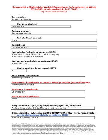 Uniwersytet w Białymstoku Wydział Ekonomiczno-Informatyczny w Wilnie SYLLABUS na rok akademicki 2012/2013 http://www.wilno.uwb.edu.pl/ Tryb studiów Studia stacjonarne Kierunek studiów Informatyka Poziom studiów Pierwszego stopnia Rok studiów/ semestr II / 3 Specjalność Bez specjalności Kod katedry/zakładu w systemie USOS 10000000 Wydział Ekonomiczno-Informatyczny 10020000 Katedra Informatyki Kod kursu/przedmiotu w systemie USOS 1000-IS1-2TSI Liczba punktów kredytowych ECTS 5 Tytuł kursu/przedmiotu Technologie sieciowe Grupa treści kształcenia, w ramach której przedmiot jest realizowany Przedmioty kierunkowe Typ kursu / przedmiotu Obowiązujący Język kursu/przedmiotu polski Imię, nazwisko i tytuł/stopień prowadzącego kurs/przedmiot Andrzej Kużelewski, dr inż., Mirosław Najbuk, mgr inż. Imię, nazwisko i tytuł/stopień KOORDYNATORA (-ÓW) kursu/przedmiotu – zatwierdzającego protokoły w systemie USOS Andrzej Kużelewski, dr inż. Decyzją Dziekana WEI syllabusy przedmiotów realizowanych podczas studiów na Wydziale Ekonomiczno-Informatycznym Filii UwB w Wilnie są udostępniane studentom i absolwentom przed rozpoczęciem zajęć, w postaci elektronicznej (na stronie internetowej WEI) oraz papierowej (w Dziekanacie). Zbiory papierowe są oprawiane według lat akademickich i archiwizowane w bibliotece wydziałowej. Syllabusy powinno się drukować obustronnie. Za przygotowanie syllabusa oraz jego terminowe przekazanie do opublikowania w postaci elektronicznej odpowiada koordynator przedmiotu. Dziekanat prowadzi zbiór bieżących i archiwalnych syllabusów zgodnie z wykazem przedmiotów realizowanych przez pracowników dydaktycznych zatrudnionych na Wydziale. Dany rocznik syllabusów w wersji papierowej powinien zawierać płytkę CD z kopiami zarchiwizowanych plików syllabusów w postaci elektronicznej, służącą jako źródło plików do wysyłki pocztą elektroniczną w razie prośby studenta lub absolwenta . Kopia papierowej wersji syllabusa danego przedmiotu wydawana jest na prośbę studenta lub absolwenta WEI. Zgodność kopii z oryginałem poświadcza swoim podpisem i pieczątką uczelni Prodziekan ds. Dydaktyki. Uniwersytet w Białymstoku Wydział Ekonomiczno-Informatyczny w Wilnie SYLLABUS na rok akademicki 2012/2013 http://www.wilno.uwb.edu.pl/ Imiona, nazwiska oraz tytuły/stopnie członków zespołu dydaktycznego Andrzej Kużelewski, dr inż., Dominik Tomaszuk, mgr inż. Forma zaliczenia kursu Forma kursu Ogólna ilość godzin Liczba godzin w tygodniu / liczba godzin na zjazd Wykład 30 4 Ćwiczenia 30 4 Seminarium Założenia i cel przedmiotu Celem jest zdobycie podstawowej wiedzy z zakresu sieci komputerowych: protokołów komunikacyjnych, topologii sieci, przełączaniu i routingu, urządzeniach wykorzystywanych w sieciach, zagrożeniach atakami na sieć oraz sposobach ich wykrywania i zapobiegania. Zajęcia prowadzone częściowo w formie e-zajęć (blended learning). Wymagania wstępne Wstęp do informatyki Treści merytoryczne przedmiotu Wprowadzenie do sieci komputerowych. Komunikacja w sieciach komputerowych. Modele sieci. Bezpieczeństwo w sieciach komputerowych. Technologie udostępniania informacji w sieciach komputerowych. Wykład Zawartość tematyczna poszczególnych wykładów (w skrócie) Wprowadzenie. Wpływ sieci komputerowych na życie w nowoczesnym społeczeństwie (stacjonarnie) Sposoby komunikacji w sieci (stacjonarnie) Warstwa aplikacji. Protokoły i funkcjonalność (on-line) Warstwa transportowa. Łączenie procesów (on-line) Warstwa sieci. Komunikacja pomiędzy hostami (on-line) Adresowanie sieci IPv4 (on-line) Podział sieci IP (on-line) Warstwa dostępu do sieci (on-line) Routing (on-line) Przełączanie (switching) (on-line) Wirtualne sieci lokalne (VLAN) (on-line) Sieci rozległe (WAN) (on-line) Listy kontroli dostępu (ACL – Access Control Lists) (on-line) Wirtualne sieci prywatne (VPN) (on-line) Razem godzin L.godz. 2 2 2 2 2 2 4 2 2 2 2 2 2 2 30 Decyzją Dziekana WEI syllabusy przedmiotów realizowanych podczas studiów na Wydziale Ekonomiczno-Informatycznym Filii UwB w Wilnie są udostępniane studentom i absolwentom przed rozpoczęciem zajęć, w postaci elektronicznej (na stronie internetowej WEI) oraz papierowej (w Dziekanacie). Zbiory papierowe są oprawiane według lat akademickich i archiwizowane w bibliotece wydziałowej. Syllabusy powinno się drukować obustronnie. Za przygotowanie syllabusa oraz jego terminowe przekazanie do opublikowania w postaci elektronicznej odpowiada koordynator przedmiotu. Dziekanat prowadzi zbiór bieżących i archiwalnych syllabusów zgodnie z wykazem przedmiotów realizowanych przez pracowników dydaktycznych zatrudnionych na Wydziale. Dany rocznik syllabusów w wersji papierowej powinien zawierać płytkę CD z kopiami zarchiwizowanych plików syllabusów w postaci elektronicznej, służącą jako źródło plików do wysyłki pocztą elektroniczną w razie prośby studenta lub absolwenta . Kopia papierowej wersji syllabusa danego przedmiotu wydawana jest na prośbę studenta lub absolwenta WEI. Zgodność kopii z oryginałem poświadcza swoim podpisem i pieczątką uczelni Prodziekan ds. Dydaktyki. Uniwersytet w Białymstoku Wydział Ekonomiczno-Informatyczny w Wilnie SYLLABUS na rok akademicki 2012/2013 http://www.wilno.uwb.edu.pl/ Ćwiczenia Zawartość tematyczna poszczególnych ćwiczeń (w skrócie) Zajęcia wstępne. Zapoznanie ze sprzętem i oprogramowaniem stosowanym na zajęciach (stacjonarnie) Konfiguracja interfejsu sieciowego w SO LINUX (stacjonarnie) Przechwytywanie i przeglądanie zawartości pakietów (stacjonarnie) Przechwytywanie pakietów w sieci przełączanej (stacjonarnie) Skanowanie sieciowe (stacjonarnie) Zapory sieciowe – iptables (stacjonarnie) Maskowanie adresów sieciowych, linux jako router, logowanie pakietów na zaporze sieciowej (stacjonarnie) Podział sieci (stacjonarnie) Kolokwium (stacjonarnie) Podstawowa konfiguracja routera (stacjo