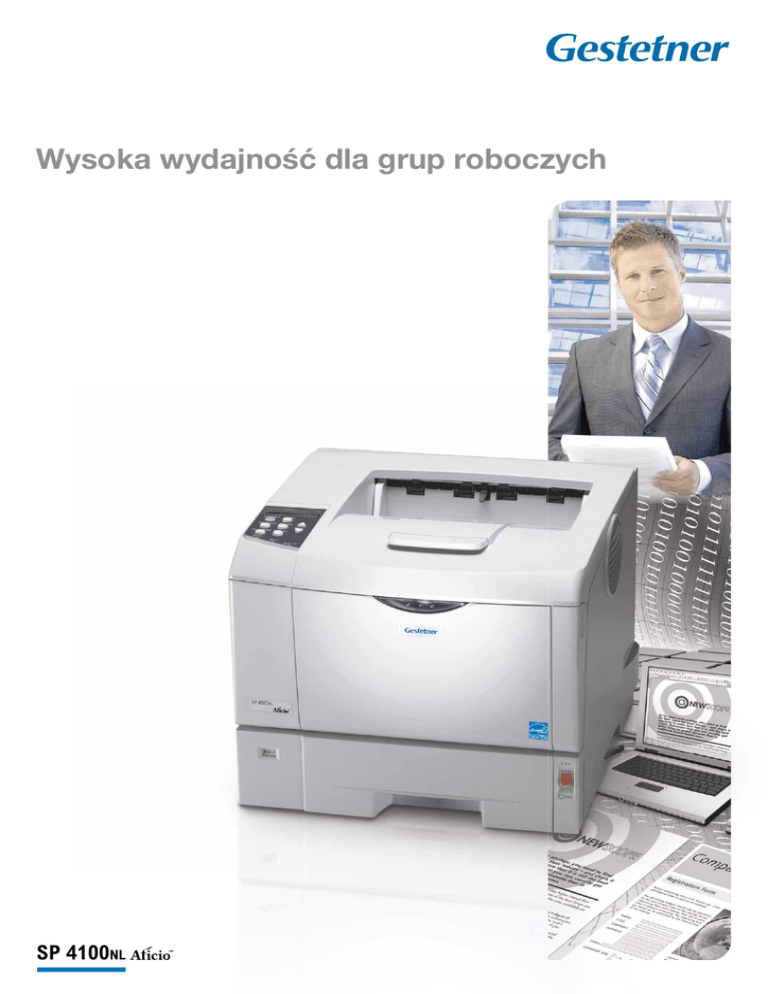 Wysoka wydajność dla grup roboczych SP 4100NL Potęga druku czarno białego Pewność, szybkość i konkurencyjne koszta Jeżeli potrzebujesz laserowego druku czarno białego o wysokiej jakości, SP 4100NL spełnia te oczekiwania. Każdego miesiąca możesz wydrukować do 100,000 stron z prędkością 31 stron na minutę. Wyposażony w procesor 400 MHz potrafi sprostać ciężkim zadaniom. SP 4100NL jest doskonałą drukarką sieciową oferującą niezawodność, obsługę szerokiej gamy nośników oraz niski koszt posiadania. Doskonały wybór dla małych firm i grup roboczych w dużych przedsiębiorstwach. • 31 stron na minutę. • Do 100,000 wydruków miesięcznie. • Niski koszt posiadania (TCO). Obsługa dla każdego SP 4100NL jest prosta w obsłudze i eksploatacji. Po zainstalowaniu opcji drukarka automatycznie wykrywa sprzęt i instaluje niezbędne sterowniki. Funkcja zdalnego monitorowania pozwala na stałą obserwację z każdej stacji roboczej. Do urządzenia dołączony jest unikalny sterownik drukowania, zaprojektowany przez Gestetner, przyjazny dla użytkownika, oparty na ikonach sterownik RPCS™. • Łatwa w obsłudze. • Unikalne sterowanie za pomocą ikon. • Niestandardowe ustawienia papieru. Innowacje w jakości Każdego roku Gestetner inwestuje w badania i rozwój, utrzymując firmę w czołówce wprowadzanych nowych rozwiązań. Niewiele przedsiębiorstw zdobyło nagrodę Deming Award for Quality Control. Dla Gestetner jako producenta urządzeń biurowych udało się to dwukrotnie. Dążymy do najwyższej jakości we wszystkim co robimy. Następnym dowodem na to jest SP 4100NL. Sprawdzona jakośc SP 4100NL została zaprojektowana z myślą o użytkowniku. Drukarka oferuje funkcjonalność typową dla drukarek z najwyższej półki cenowej. Zmniejszyliśmy pobór mocy: mniej niż 6,5W w trybie oszczędzania energii, co obniża jeszcze bardziej koszt posiadania (TCO). Gestetner gwarantuje wysoką jakość swoich urządzeń poprzez największą sieć serwisową w branży. Zminimalizowany pobór mocy: mniej niż 6,5W w trybie oszczędzania energii • Wysoka funkcjonalność. • Konkurencyjna cena zakupu. • Zmniejszone koszta obsługi. Wyjątkowa obsługa nośników SP 4100NL potrafi drukować na różnych nośnikach. Standardowa i opcjonalna kaseta na papier obsługują papier do formatu A4 i do 130g/m2 gramatury. Z podajnika ręcznego możliwy jest druk na papierze o gramaturze do 162 g/m2. Dzięki inteligentnemu systemowi przebiegu papieru, wydruk jest szybko i bez ryzyka zacięcia. Nowością jest dedykowany system nadrukowywania kopert. Automatyczny druk dwustronny dostępny jest w opcji. • Szeroka gama obsługiwanych nośników. • Inteligentny przebieg papieru. • Dedykowany system nadruku kopert. SP 4100NL SPECYFIKACJA OGÓLNIE OPROGRAMOWANIE Technologia: Dioda laserowa, drukowanie elektrofotograficzne Prędkość druku ciągłego: 31 stron na minutę Czas wybudzania: Mniej niż 12 sek. Pierwszy wydruk: Mniej niż 6,9 sek. Standard: DeskTopBinder™ Lite, SmartDeviceMonitor™ for Admin/Client, Web Image Monitor, Printer utility for Mac, Font Manager 2000 Opcja: Document management utilities & professional software solutions, @Remote Service, IPDS/SCS printing, Web SmartDeviceMonitor™ 2 Wymiary (Szer. x Gł. x Wys.): 388 x 450 x 345 mm 15.5 kg Zasilanie: 220 - 240 V, 50/60 Hz Pobór mocy: Maksimum: 970 W (tylko urządzenie) 990 W (pełna opcja) Tryb oszczędzania energii: Mniej niż 6.5 W (tylko rządzenie) Mniej niż 12.5 W (pełna opcja) Maksimum: 100,000 stron miesięcznie Pamięć: Standard: Maksimum: Sterowniki: PCL5e, PCL6, RPCS™: Adobe® PostScript® 3™: 600 x 600 dpi 1.200 x 600 dpi 1.200 x 600 dpi 192 MB 384 MB Windows® 2000/XP/Server 2003 Windows® 2000/XP/Server 2003 Macintosh 8.6 or later (OS X Classic) Macintosh X v10.1 or later (native mode) Wspierane środowiska: 35 intelli fonts 10 true type fonts 1 bitmap font (31 fonts can be downloaded) ® ® ® Adobe PostScript 3™: 136 Adobe type 1 fonts Option: OCR Barcode Standard: Opcja: Funkcje dodatkowe: Gramatura: Kasety: Podajnik ręczny: Dupleks: Nośniki: Zwykły papier, papier z recyklingu, przeźrocza, etykiety, koperty A4 - A5 A4 - A6 60 - 130 g/m2 60 - 162 g/m2 64 - 105 g/m2 MATERIAŁY EKSPLOATACYJNE Kartridż: Czarny: 7.500 arkuszy1 SP 4100NL dostarczana jest z tonerem startowym na 3.000 wydruków. OPCJE Opcje wewnętrzne: Opcje zewnętrzne: TCP/IP, IPX/SPX, SMB, AppleTalk Windows® 2000/XP/Vista /Server 2003 Novell® NetWare® 3.12/3.2/4.1/4.11/5.0/5.1/6/6.5 UNIX Sun® Solaris 2.6/7/8/9/10 HP-UX 10.x/11.x/11i v2 SCO OpenServer 5.0.7/6.0 ® RedHat Linux 6.x/7.x/8.x/9.x/Enterprise IBM® AIX v4.3/5L v5.1/5L v5.2/5L v5.3 Macintosh 8.6 - 9.2.x (OS X Classic) Macintosh X v10.1 or later (native mode) IBM® System i5™ HPT SAP® R/3® 3.x or later NDPS Gateway AS/400® using OS/400 Host Print Transform Interfejs: Kasety: Podajnik ręczny PCL: SIEĆ Protokoły sieciowe: Rozmiar papieru: 400 MHz Język drukarki/rozdzielczość: PCL5e: PCL6: RPCS™, Adobe® PostScript® 3™: CZcionki: kaseta na 500 arkuszy Podajnik ręczny na 100 arkuszy 1.600 arkuszy Pojemność wyjściowa papieru: 250 arkuszy nadrukiem do dołu KONTROLER Procesor: Pojemność wejściowa papieru: Standard: PDF Direct Print Ethernet 10 base-T/100 base-TX USB 2.0 Bi-directional IEEE 1284 Wireless LAN (IEEE 802.11b) USB Host I/F Gigabit Ethernet 40 GB Hard Disk Drive 128/256 MB SDRAM DIMM Wireless LAN (IEEE 802.11b) Gigabit Ethernet Data Overwrite Security Unit VM Card Data Storage Card 1 kaseta na 500 arkuszy 2 Podajnik kopert (60 kopert) Dupleks 1 Zadeklarowana wydajność zgodna z ISO/IEC 19752. 2 Maksymalnie 2 kasety mogą być podłączone do urządzenia. Dostępność urządzeń, opcji oraz oprogramowania prosimy skonsultować z najbliższym dostawcą Gestetner. Certyfikat ISO9001: 2000 Certyfikat ISO14001 Niniejsze produkty zostały zaprojektowane aby spełniać wymogi dotyczące wydajności energetycznej E