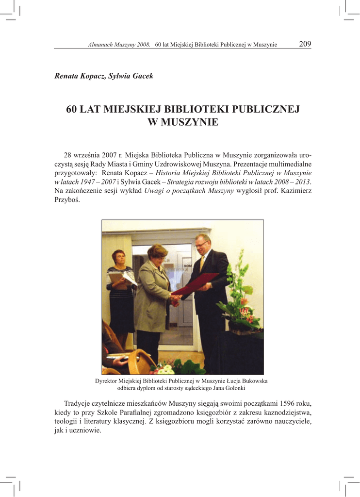 Almanach Muszyny 2008. 60 lat Miejskiej Biblioteki Publicznej w Muszynie 209 Renata Kopacz, Sylwia Gacek 60 LAT MIEJSKIEJ BIBLIOTEKI PUBLICZNEJ W MUSZYNIE 28 września 2007 r. Miejska Biblioteka Publiczna w Muszynie zorganizowała uroczystą sesję Rady Miasta i Gminy Uzdrowiskowej Muszyna. Prezentacje multimedialne przygotowały: Renata Kopacz – Historia Miejskiej Biblioteki Publicznej w Muszynie w latach 1947 – 2007 i Sylwia Gacek – Strategia rozwoju biblioteki w latach 2008 – 2013. Na zakończenie sesji wykład Uwagi o początkach Muszyny wygłosił prof. Kazimierz Przyboś. Dyrektor Miejskiej Biblioteki Publicznej w Muszynie Łucja Bukowska odbiera dyplom od starosty sądeckiego Jana Golonki Tradycje czytelnicze mieszkańców Muszyny sięgają swoimi początkami 1596 roku, kiedy to przy Szkole Parafialnej zgromadzono księgozbiór z zakresu kaznodziejstwa, teologii i literatury klasycznej. Z księgozbioru mogli korzystać zarówno nauczyciele, jak i uczniowie. 210 Renata Kopacz, Sylwia Gacek Powstanie kolejnych bibliotek w Muszynie związane było z działalnością organizacji społecznych i oświatowych, a z ich zasobów korzystali i członkowie tychże organizacji, i mieszkańcy miasta. 1 września 1947 r., na mocy Dekretu o bibliotekach i opiece nad zbiorami bibliotecznymi, ogłoszonego 17 kwietnia 1946 r., w Muszynie powstała Miejska Biblioteka Publiczna. Nowa placówka otrzymała pomieszczenie o powierzchni 35 m2 w budynku Sądu. Pierwszą kierowniczką została Janina Rybiańska, wspomagana przez pracującą społecznie nauczycielkę, Marię Kuryłowicz. Od 1972 roku do chwili obecnej kierownikiem muszyńskiej Biblioteki jest Łucja Bukowska. 6 września 2007 roku została oznaczona Srebrnym Medalem „Zasłużony Kulturze Gloria Artis”. W roku 1973 po zmianach administracyjnych powstała Miejsko-Gminna Biblioteka Publiczna, w skład której weszły – oprócz muszyńskiej centrali – filia na ul. Kościuszki, dwie byłe Gromadzkie Biblioteki Publiczne (w Powroźniku i Żegiestowie) oraz punkty biblioteczne w ośmiu wsiach gminy. W roku 1990 Biblioteka przeniosła się do nowych pomieszczeń w Rynku przy Urzędzie Miasta i Gminy, o powierzchni 173 m2. Lokum to zajmuje do dziś. Biblioteka Publiczna jest samorządową instytucją kultury, założoną i utrzymywaną przez Miasto i Gminę Uzdrowiskową Muszyna. Misją Biblioteki jest: • zapewnienie i promowanie w odpowiednim miejscu i czasie, w dogodny dla użytkowników sposób, dostępu do źródeł informacji – w formie zarówno elektronicznej, jak i tradycyjnej – niezbędnych do poszerzenia wiedzy ogólnej i zawodowej; • rozbudzanie, kształtowanie i zaspokajanie przez odpowiednie działania potrzeb kulturalnych środowiska, w którym działa Biblioteka (także poprzez współpracę z instytucjami działającymi na terenie gminy); • gromadzenie dokumentacji życia społecznego, politycznego i kulturalnego gminy (także dokumentów z poprzednich okresów historycznych); • usługi biblioteczne powinny być wysokiej jakości oraz dostarczane przez życzliwy i dobrze przygotowany zespół. W gościnnych progach Biblioteki działa Mała Galeria, której celem jest prezentowanie dzieł twórców, związanych z ziemią muszyńską. Dzięki stałej współpracy z Towarzystwem Przyjaciół Sztuk Pięknych (Oddziałami w Krynicy i w Muszynie), Krynickim Towarzystwem Fotograficznym i redakcją „Almanachu Muszyny” na ścianach bibliotecznych prezentowane są liczne zdjęcia, pocztówki, obrazy, a także rzeźby. Biblioteka muszyńska ma w chwili obecnej trzy filie. Z danych na koniec 2006 roku wynika, że ogólna liczba czytelników wyniosła 2876 osób. Księgozbiór w tym samym okresie obejmował 73 822 woluminy. 50% zbiorów Biblioteki, skatalogowanych w systemie MAK, można przeglądać w Internecie na stronie multiwyszukiwarki Fidkar M@łopolski oraz na stronie internetowej Biblioteki www.biblioteka.muszyna.pl . O historii Biblioteki zob. Łucja Bukowska, Dzieje Biblioteki Miejskiej w Muszynie, „Almanach Muszyny” 1997, s. 5–11. Almanach Muszyny 2008. 60 lat Miejskiej Biblioteki Publicznej w Muszynie 211 Uroczysta sesja Rady MiGU Muszyna poświęcona 60-leciu Biblioteki w Muszynie 28 września 2007 roku Fot. Renata Kopacz