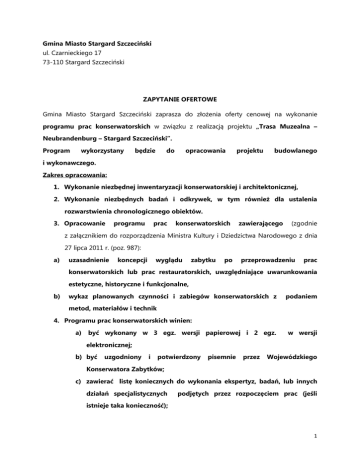Gmina Miasto Stargard Szczeciński ul. Czarnieckiego 17 73-110 Stargard Szczeciński ZAPYTANIE OFERTOWE Gmina Miasto Stargard Szczeciński zaprasza do złożenia oferty cenowej na wykonanie programu prac konserwatorskich w związku z realizacją projektu „Trasa Muzealna – Neubrandenburg – Stargard Szczeciński”. Program wykorzystany będzie do opracowania projektu budowlanego i wykonawczego. Zakres opracowania: 1. Wykonanie niezbędnej inwentaryzacji konserwatorskiej i architektonicznej, 2. Wykonanie niezbędnych badań i odkrywek, w tym również dla ustalenia rozwarstwienia chronologicznego obiektów. 3. Opracowanie programu prac konserwatorskich zawierającego (zgodnie z załącznikiem do rozporządzenia Ministra Kultury i Dziedzictwa Narodowego z dnia 27 lipca 2011 r. (poz. 987): a) uzasadnienie koncepcji wyglądu zabytku po przeprowadzeniu prac konserwatorskich lub prac restauratorskich, uwzględniające uwarunkowania estetyczne, historyczne i funkcjonalne, b) wykaz planowanych czynności i zabiegów konserwatorskich z podaniem metod, materiałów i technik 4. Programu prac konserwatorskich winien: a) być wykonany w 3 egz. wersji papierowej i 2 egz. w wersji elektronicznej; b) być uzgodniony i potwierdzony pisemnie przez Wojewódzkiego Konserwatora Zabytków; c) zawierać listę koniecznych do wykonania ekspertyz, badań, lub innych działań specjalistycznych podjętych przez rozpoczęciem prac (jeśli istnieje taka konieczność); 1 d) musi zawierać informację o zagrożeniach mogących wyniknąć w czasie prac remontowo – konserwatorskich przy zabytkach, e) zawierać orientacyjny, szacunkowy koszt robót wynikających z programu f) zawierać „wytyczne” dla autora szczegółowej dokumentacji projektowokosztorysowej g) zostać zaprezentowany Zamawiającemu w ramach roboczej prezentacji. Zamawiający zastrzega sobie prawo do wnoszenia uwag do opracowania Opis zamierzenia inwestorskiego: Średniowieczny system obronny Stargardu powstawał od połowy XIII w., tj. od momentu lokacji miasta w 1243 r. Wcześniejsze obwałowania drewniano-ziemne zastąpiono murem kamienno-ceglanym. W XV-XVI w. mury podwyższano, a także przebudowywano, co związane było z coraz powszechniejszym zastosowaniem broni palnej. Całkowity obwód murów obronnych wynosił 2 260m, a wysokość od 6 do 8 m. W skład systemu obronnego miasta wchodziły cztery bramy, w tym trzy lądowe (wraz z przedbramiami lub barbakanem) oraz jedna wodna, dziewięć baszt, cztery furty, czterdzieści pięć czatowni oraz cztery basteje. W XIX w. mury straciły swoją funkcjonalność, wtedy też niektóre z odcinków zostały rozebrane. Z dawnego systemu obronnego pozostało 1 040 m murów obronnych, cztery bramy miejskie (w tym jedna przebudowana, zachowana jedynie w partii przyziemia), cztery baszty oraz część czatowni. Baszty: Morze Czerwone i Tkaczy należą do najwyższych budowli tego rodzaju w Polsce, a Brama Młyńska jest jednym z dwóch tego rodzaju obiektów w Europie. Wstępne założenia do zrealizowania: 1. Remont Baszty Tkaczy, oraz budowa pomostu pomiędzy Basztą Tkaczy a Basteją Pomiędzy Basteją a Basztą Tkaczy powstanie pomost Basteja będzie stanowiła punkt, z którego wychodzą na koronę murów dwa tarasy – już istniejący w kierunku Bramy Pyrzyckiej oraz planowany w kierunku Baszty Tkaczy. Komunikacja będzie się odbywała poprzez klatkę schodową Bastei. Pomost wizualnie stanowić będzie odwzorowanie przebiegu murów 2 obronnych na tym odcinku. Dzięki hurdycji możliwe będzie udostępnienie zwiedzającym Baszty Tkaczy. Przewidywany do wykonania rodzaj robót budowlanych: - izolacja pozioma ścian zewnętrznych i wewnętrznych ( iniekcja ), - roboty budowlane wewnętrzne, - instalacja elektryczna zewnętrzna i wewnętrzna, - roboty konserwatorskie zewnętrzne i wewnętrzne, - iluminacja Baszty i zagospodarowanie terenu, - wykonanie kładki łączącej Basztę Tkaczy z Basteją - uzupełnienie istniejącej historycznej stolarki drzwiowej , okiennej oraz uzupełnienie stropu pomiędzy lochem a pierwszym poziomem w technice szachulcowej. 2. Remont odcinka murów obronnych przy ul. Warownej (odcinek od Bramy Pyrzyckiej do Baszty Morze Czerwone) wraz z budową hurdycji ( długość około 192.0 mb, wysokość około 7.5 mb ) oraz wymiana nawierzchni ul. Warownej – jezdnia i chodniki od Bramy Pyrzyckiej do Baszty Morze Czerwone około -1157 m2. Przewidywany do wykonania rodzaj robót budowlanych : - wzmocnienie fundamentów, - remont muru ( wymiana spoinowania , zszycie pęknięć muru , rozebranie i ponowne wymurowanie częściowych elementów muru , wypełnienie pustych przestrzeni w murze zaprawą , kamieniami i iniektem ), - wykonanie nowej ceglanej korony muru - impregnacja całości muru środkami impregnacyjnymi, - iluminacja muru, - wymiana istniejącej nawierzchni jezdni na kostkę granitową, - wymiana istniejącej nawierzchni chodników na kostkę granitową, - wymiana istniejących krawężników. Uwaga: hurdycja od Baszty Morze Czerwone w kierunku Bramy Pyrzyckiej 3 3. Remont Baszty Morze Czerwone Przewidywany do wykonania rodzaj robót budowlanych: - remont elewacji ,wymiana stolarki drzwiowej zewnętrznej, wewnętrznej, - wymiana schodów zewnętrznych stalowych, - adaptacja pomieszczenia wewnętrznego na WC, - wykonanie instalacji wewnętrznych wod-kan , elektrycznej i wentylacji, - wykonanie przyłączy wod – kan i elektrycznego, - wykonanie iluminacji zewnętrznej i monitoringu obiektu, - remont wnętrza w niezbędnym zakresie. 4. Remont odcinka murów obronnych przy ul. Klasztornej (długość około 135 mb, wysokość 5.5 mb) Przewidywany do wykonania rodzaj robót budowlanych: - wzmocnienie fundamentów, - remont muru ( wymiana spoinowania , zszycie pęknięć muru , rozebranie i ponowne wymurowanie częściowych elementów muru , wypełnienie pustych przestrzeni w murze zaprawą , kamieniami i iniektem ), - wykonanie nowej ceglanej korony muru, - impregn