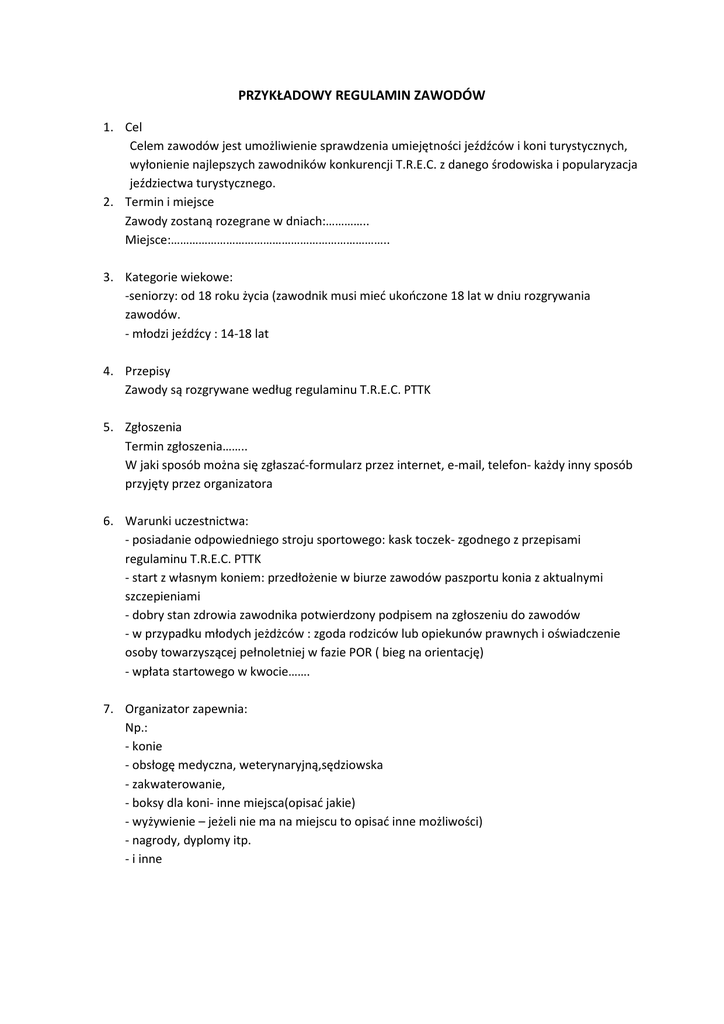 PRZYKŁADOWY REGULAMIN ZAWODÓW 1. Cel Celem zawodów jest umożliwienie sprawdzenia umiejętności jeźdźców i koni turystycznych, wyłonienie najlepszych zawodników konkurencji T.R.E.C. z danego środowiska i popularyzacja jeździectwa turystycznego. 2. Termin i miejsce Zawody zostaną rozegrane w dniach:………….. Miejsce:…………………………………………………………….. 3. Kategorie wiekowe: -seniorzy: od 18 roku życia (zawodnik musi mieć ukończone 18 lat w dniu rozgrywania zawodów. - młodzi jeźdźcy : 14-18 lat 4. Przepisy Zawody są rozgrywane według regulaminu T.R.E.C. PTTK 5. Zgłoszenia Termin zgłoszenia…….. W jaki sposób można się zgłaszać-formularz przez internet, e-mail, telefon- każdy inny sposób przyjęty przez organizatora 6. Warunki uczestnictwa: - posiadanie odpowiedniego stroju sportowego: kask toczek- zgodnego z przepisami regulaminu T.R.E.C. PTTK - start z własnym koniem: przedłożenie w biurze zawodów paszportu konia z aktualnymi szczepieniami - dobry stan zdrowia zawodnika potwierdzony podpisem na zgłoszeniu do zawodów - w przypadku młodych jeżdżców : zgoda rodziców lub opiekunów prawnych i oświadczenie osoby towarzyszącej pełnoletniej w fazie POR ( bieg na orientację) - wpłata startowego w kwocie……. 7. Organizator zapewnia: Np.: - konie - obsłogę medyczna, weterynaryjną,sędziowska - zakwaterowanie, - boksy dla koni- inne miejsca(opisać jakie) - wyżywienie – jeżeli nie ma na miejscu to opisać inne możliwości) - nagrody, dyplomy itp. - i inne