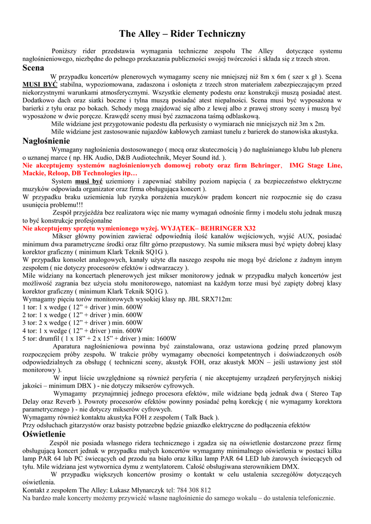 The Alley – Rider Techniczny Poniższy rider przedstawia wymagania techniczne zespołu The Alley dotyczące systemu nagłośnieniowego, niezbędne do pełnego przekazania publiczności swojej twórczości i składa się z trzech stron. Scena W przypadku koncertów plenerowych wymagamy sceny nie mniejszej niż 8m x 6m ( szer x gł ). Scena MUSI BYĆ stabilna, wypoziomowana, zadaszona i osłonięta z trzech stron materiałem zabezpieczającym przed niekorzystnymi warunkami atmosferycznymi. Wszystkie elementy podestu oraz konstrukcji muszą posiadać atest. Dodatkowo dach oraz siatki boczne i tylna muszą posiadać atest niepalności. Scena musi być wyposażona w barierki z tyłu oraz po bokach. Schody mogą znajdować się albo z lewej albo z prawej strony sceny i muszą być wyposażone w dwie poręcze. Krawędź sceny musi być zaznaczona taśmą odblaskową. Mile widziane jest przygotowanie podestu dla perkusisty o wymiarach nie mniejszych niż 3m x 2m. Mile widziane jest zastosowanie najazdów kablowych zamiast tunelu z barierek do stanowiska akustyka. Nagłośnienie Wymagany nagłośnienia dostosowanego ( mocą oraz skutecznością ) do nagłaśnianego klubu lub pleneru o uznanej marce ( np. HK Audio, D&B Audiotechnik, Meyer Sound itd. ). Nie akceptujemy systemów nagłośnieniowych domowej roboty oraz firm Behringer, IMG Stage Line, Mackie, Reloop, DB Technologies itp… System musi być uziemiony i zapewniać stabilny poziom napięcia ( za bezpieczeństwo elektryczne muzyków odpowiada organizator oraz firma obsługująca koncert ). W przypadku braku uziemienia lub ryzyka porażenia muzyków prądem koncert nie rozpocznie się do czasu usunięcia problemu!!! Zespół przyjeżdża bez realizatora więc nie mamy wymagań odnośnie firmy i modelu stołu jednak muszą to być konstrukcje profesjonalne Nie akceptujemy sprzętu wymienionego wyżej. WYJĄTEK– BEHRINGER X32 Mikser główny powinien zawierać odpowiednią ilość kanałów wejściowych, wyjść AUX, posiadać minimum dwa parametryczne środki oraz filtr górno przepustowy. Na sumie miksera musi być wpięty dobrej klasy korektor graficzny ( minimum Klark Teknik SQ1G ). W przypadku konsolet analogowych, kanały użyte dla naszego zespołu nie mogą być dzielone z żadnym innym zespołem ( nie dotyczy procesorów efektów i odtwarzaczy ). Mile widziany na koncertach plenerowych jest mikser monitorowy jednak w przypadku małych koncertów jest możliwość zagrania bez użycia stołu monitorowego, natomiast na każdym torze musi być zapięty dobrej klasy korektor graficzny ( minimum Klark Teknik SQ1G ). Wymagamy pięciu torów monitorowych wysokiej klasy np. JBL SRX712m: 1 tor: 1 x wedge ( 12” + driver ) min. 600W 2 tor: 1 x wedge ( 12” + driver ) min. 600W 3 tor: 2 x wedge ( 12” + driver ) min. 600W 4 tor: 1 x wedge ( 12” + driver ) min. 600W 5 tor: drumfil ( 1 x 18” + 2 x 15” + driver ) min: 1600W Aparatura nagłośnieniowa powinna być zainstalowana, oraz ustawiona godzinę przed planowym rozpoczęciem próby zespołu. W trakcie próby wymagamy obecności kompetentnych i doświadczonych osób odpowiedzialnych za obsługę ( techniczni sceny, akustyk FOH, oraz akustyk MON – jeśli ustawiony jest stół monitorowy ). W input liście uwzględnione są również peryferia ( nie akceptujemy urządzeń peryferyjnych niskiej jakości – minimum DBX ) - nie dotyczy mikserów cyfrowych. Wymagamy przynajmniej jednego procesora efektów, mile widziane będą jednak dwa ( Stereo Tap Delay oraz Reverb ). Powroty procesorów efektów powinny posiadać pełną korekcję ( nie wymagamy korektora parametrycznego ) - nie dotyczy mikserów cyfrowych. Wymagamy również kontaktu akustyka FOH z zespołem ( Talk Back ). Przy odsłuchach gitarzystów oraz basisty potrzebne będzie gniazdko elektryczne do podłączenia efektów Oświetlenie Zespół nie posiada własnego ridera technicznego i zgadza się na oświetlenie dostarczone przez firmę obsługującą koncert jednak w przypadku małych koncertów wymagamy minimalnego oświetlenia w postaci kilku lamp PAR 64 lub PC świecących od przodu na biało oraz kilku lamp PAR 64 LED lub żarowych świecących od tyłu. Mile widziana jest wytwornica dymu z wentylatorem. Całość obsługiwana sterownikiem DMX. W przypadku większych koncertów prosimy o kontakt w celu ustalenia szczegółów dotyczących oświetlenia. Kontakt z zespołem The Alley: Łukasz Młynarczyk tel: 784 308 812 Na bardzo małe koncerty możemy przywieźć własne nagłośnienie do samego wokalu – do ustalenia telefonicznie. W przypadku braku możliwości spełnienia naszych wymagań technicznych, istnieje możliwość aby zespół zapewnił system nagłośnieniowy oraz oświetleniowy. Szczegóły: „Art-Tech” Konrad Popiel, tel. 698-863-418 www.art-tech.net.pl Input List L.P. Instrument Mikrofon Insert 1 Stopa Audix D6 bramka 2 Werbel góra Audix i5 / Shure SM57 kompresor 3 Hi Hat Shure SM81 kompresor 4 Tom 1 Audix D2 / e604 bramka 5 Tom 2 Audix D2 / e604 bramka 6 Tom 3 Audix D2 / e604 bramka 7 Oh L Shure SM81 8 Oh P Shure SM81 9 Bas XLR 10 Git L Shure SM57 11 Git Acc Duży Jack + Di-Box 12 Keyb L Duży Jack + Di-Box 13 Keyb P Duży Jack + Di-Box 14 Voc Shure Beta58 kompresor 15 Voc Shure Beta58 kompresor 16 Voc Shure Beta58 kompresor 17 SPX 990 L 18 SPX 990 P 19 TC M-One L 20 TC M-One P Stage Plan kompresor kompresor