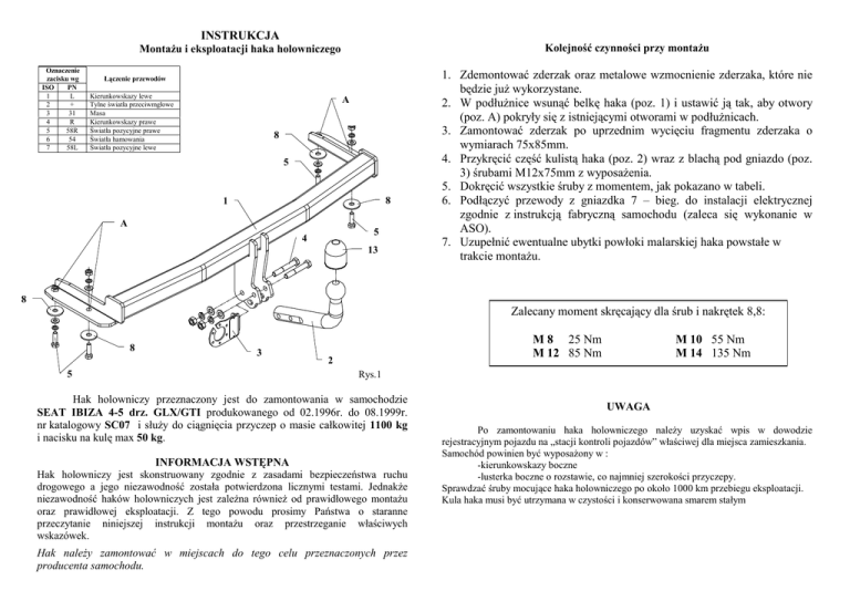 INSTRUKCJA Kolejność czynności przy montaŜu MontaŜu i eksploatacji haka holowniczego Oznaczenie zacisku wg ISO PN 1 L 2 + 3 31 4 R 5 58R 6 54 7 58L Łączenie przewodów Kierunkowskazy lewe Tylne światła przeciwmgłowe Masa Kierunkowskazy prawe Światła pozycyjne prawe Światła hamowania Światła pozycyjne lewe A 8 5 8 1 A 5 4 13 1. Zdemontować zderzak oraz metalowe wzmocnienie zderzaka, które nie będzie juŜ wykorzystane. 2. W podłuŜnice wsunąć belkę haka (poz. 1) i ustawić ją tak, aby otwory (poz. A) pokryły się z istniejącymi otworami w podłuŜnicach. 3. Zamontować zderzak po uprzednim wycięciu fragmentu zderzaka o wymiarach 75x85mm. 4. Przykręcić część kulistą haka (poz. 2) wraz z blachą pod gniazdo (poz. 3) śrubami M12x75mm z wyposaŜenia. 5. Dokręcić wszystkie śruby z momentem, jak pokazano w tabeli. 6. Podłączyć przewody z gniazdka 7 – bieg. do instalacji elektrycznej zgodnie z instrukcją fabryczną samochodu (zaleca się wykonanie w ASO). 7. Uzupełnić ewentualne ubytki powłoki malarskiej haka powstałe w trakcie montaŜu. 8 Zalecany moment skręcający dla śrub i nakrętek 8,8: 8 5 3 M 8 25 Nm M 12 85 Nm 2 M 10 55 Nm M 14 135 Nm Rys.1 Hak holowniczy przeznaczony jest do zamontowania w samochodzie SEAT IBIZA 4-5 drz. GLX/GTI produkowanego od 02.1996r. do 08.1999r. nr katalogowy SC07 i słuŜy do ciągnięcia przyczep o masie całkowitej 1100 kg i nacisku na kulę max 50 kg. INFORMACJA WSTĘPNA Hak holowniczy jest skonstruowany zgodnie z zasadami bezpieczeństwa ruchu drogowego a jego niezawodność została potwierdzona licznymi testami. JednakŜe niezawodność haków holowniczych jest zaleŜna równieŜ od prawidłowego montaŜu oraz prawidłowej eksploatacji. Z tego powodu prosimy Państwa o staranne przeczytanie niniejszej instrukcji montaŜu oraz przestrzeganie właściwych wskazówek. Hak naleŜy zamontować w miejscach do tego celu przeznaczonych przez producenta samochodu. UWAGA Po zamontowaniu haka holowniczego naleŜy uzyskać wpis w dowodzie rejestracyjnym pojazdu na „stacji kontroli pojazdów” właściwej dla miejsca zamieszkania. Samochód powinien być wyposaŜony w : -kierunkowskazy boczne -lusterka boczne o rozstawie, co najmniej szerokości przyczepy. Sprawdzać śruby mocujące haka holowniczego po około 1000 km przebiegu eksploatacji. Kula haka musi być utrzymana w czystości i konserwowana smarem stałym WyposaŜenie haka: PPUH AUTO-HAK s.j. Produkcja Haków Holowniczych Henryk & Zbigniew Nejman 76-200 SŁUPSK ul. Słoneczna 16K tel/fax (059) 8-414-414; 8-414-413 E-mail: [email protected] www. autohak.com.pl Hak holowniczy bez wyposaŜenia elektrycznego Klasa: A50-X Nr kat. SC07 Przeznaczony do zamontowania w samochodzie: Producent: SEAT Model: IBIZA GLX/GTI Typ: 4-5drz. produkowanego od 02.1996 – 08.1999 r. Dane techniczne: Wartość siły D: 6,31 kN maksymalna masa przyczepy: 1100 kg maksymalny nacisk na kulę: 50 kg Numer homologacji zgodnie z dyrektywą 94/20/WE: e20*94/20*0219*00 KARTA GWARANCYJNA Producent udziela gwarancji niniejszą kartą gwarancyjną na okres 24 miesięcy licząc od dnia zakupu haka holowniczego do samochodu: SEAT IBIZA GLX/GTI 4-5 drz. produkowanego od 02.1996r. do 08.1999r. Data produkcji .............................. Data zakupu.................................. Zakres gwarancji obejmuje wyłącznie wady jakościowe wynikające z winy producenta. Gwarancja nie obejmuje natomiast uszkodzeń zawinionych przez nabywcę, wynikających z niewłaściwego montaŜu, uŜytkowania lub konserwacji, uszkodzeń mechanicznych, normalnego zuŜycia podczas eksploatacji itp. Gwarancja udzielona na zakupiony towar nie wyłącza, nie ogranicza ani nie zawiesza uprawnień kupującego wynikających z niezgodności towaru z umową. Reklamacje naleŜy zgłaszać w punkcie sprzedaŜy, składając jednocześnie kartę gwarancyjną. Usunięcie "wady" następuje po stwierdzeniu przez punkt sprzedaŜy wspólnie z producentem słuszności złoŜonej reklamacji. Reklamacja powinna być załatwiona w ciągu czternastu dni od dnia uznania reklamacji. Karta gwarancyjna jest niewaŜna jeŜeli nie jest wypełniona i podpisana. Data zgłoszenia reklamacji: ................................................................... INFORMACJA WSTĘPNA Hak holowniczy jest skonstruowany zgodnie z zasadami bezpieczeństwa ruchu drogowego. Hak holowniczy jest elementem wpływającym na bezpieczeństwo jazdy i moŜe zostać zainstalowany wyłącznie przez personel wyspecjalizowany. Niedopuszczalne jest dokonywanie jakichkolwiek zmian w konstrukcji haka. Powoduje to wygaśniecie dopuszczenia do stosowania. W przypadku obecności masy izolacyjnej lub osłony podwozia w miejscu przylegania haka, naleŜy ją usunąć. Nieosłonięte miejsca karoserii oraz wywiercone otwory naleŜy pomalować farbą antykorozyjną. Informacjami wiąŜącymi odnośnie wartości obciąŜeń są dane podawane przez producenta samochodu, względnie wartości maksymalnej masy przyczepy oraz maksymalnego nacisku na kulę, przy czym wartości parametrów haka holowniczego nie mogą być przekroczone. Wzór do obliczania wartości siły D: Maks. masa przyczepy [kg] x Masa całkowita samochodu [kg] 9,81 = X + 1000 Maks. masa przyczepy [kg] + Masa całkowita samochodu [kg] + D [kN] INSTRUCTION De montage et d’exploitation du dispositif d'attelage à boule Désignation de borne selon la norme ISO PN 1 L 2 3 + 31 4 R 5 6 7 58R 54 58L Connexion des câbles Instructions de montage A Pour indicateurs de direction gauche Feux de brouillard arrière Au poids du véhicule Pour indicateurs de direction droite Feux de circulation droites Pour feux de freinage Feux de circulation gauches 8 5 8 1 A 5 4 13 8 8 3 2 5 Le dispositif d'attelage à boule est conçu pour être monté dans la voiture: SEAT IBIZA, 4/5 portes, GLX/GTI, produit à partir de 02.1996 au 08.1999, numéro de catalogue SC07 et est utilisé pour tirer des remorques du poids total 1100 kg et de la pre