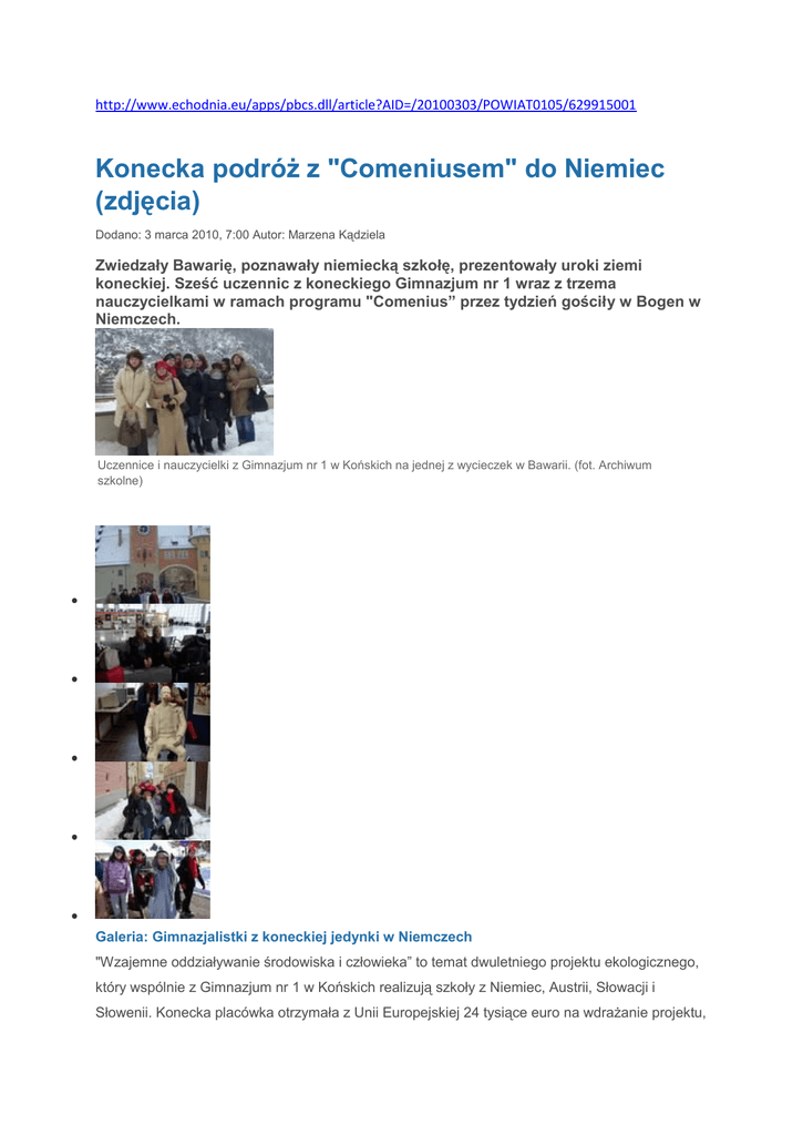 http://www.echodnia.eu/apps/pbcs.dll/article?AID=/20100303/POWIAT0105/629915001 Konecka podróż z "Comeniusem" do Niemiec (zdjęcia) Dodano: 3 marca 2010, 7:00 Autor: Marzena Kądziela Zwiedzały Bawarię, poznawały niemiecką szkołę, prezentowały uroki ziemi koneckiej. Sześć uczennic z koneckiego Gimnazjum nr 1 wraz z trzema nauczycielkami w ramach programu "Comenius” przez tydzień gościły w Bogen w Niemczech. Uczennice i nauczycielki z Gimnazjum nr 1 w Końskich na jednej z wycieczek w Bawarii. (fot. Archiwum szkolne) Galeria: Gimnazjalistki z koneckiej jedynki w Niemczech "Wzajemne oddziaływanie środowiska i człowieka” to temat dwuletniego projektu ekologicznego, który wspólnie z Gimnazjum nr 1 w Końskich realizują szkoły z Niemiec, Austrii, Słowacji i Słowenii. Konecka placówka otrzymała z Unii Europejskiej 24 tysiące euro na wdrażanie projektu, którego jednym z elementów była wycieczka do niemieckich partnerów – szkoły w Bogen w Bawarii. Do Bogen przyjechali także uczniowie ze Słowacji, Słowenii i Austrii. Na wycieczkę tę pojechało sześć uczennic klas trzecich: Paula Kuleta, Anna Kubała, Izabella Majewska, Anna Przybył, Magdalena Grochal i Agnieszka Moszczyńska. Towarzyszyły im nauczycielki: Jadwiga Bernat – główny koordynator projektu, Dorota Parszewska i Jolanta Boba. Podczas tygodniowego pobytu konecczanki zwiedziły kilka bawarskich miast, zapoznały się z nowoczesnymi metodami wykorzystywania surowców wtórnych oraz technologią budowy ekologicznych domów. Brały udział we wspólnych zabawach oraz prezentacjach krajów uczestniczących w projektach. - Nasze koneckie stoisko pełne było folderów przedstawiających ziemię konecką i świętokrzyską – mówi nauczycielka Dorota Parszewska. – Dziewczyny, oczywiście po niemiecku, prezentowały walory naszej małej ojczyzny. Częstowałyśmy gości własnymi wypiekami: faworkami, rogalikami, piernikami, makowcem. - Znakomicie wypadła nasza wokalistka Iza Majewska, która śpiewając z akompaniamentem Pauli Kulety zebrała najwięcej braw ze wszystkich prezentujących swe muzyczne dokonania – dodaje Jadwiga Bernat. Gimnazjalistki najbardziej cenią sobie fakt, iż mieszkały u niemieckich rodzin, co powodowało, że przez cały czas musiały posługiwać się językiem niemieckim. – Wszystkie zaprzyjaźniłyśmy się z niemieckimi rówieśnikami – opowiada Iza Majewska. – Ja na przykład bardzo polubiłam moją gospodynię Ninę, z którą niemal codziennie koresponduję. Ania Kubała jest zachwycona niemiecką szkołą, jej wyposażeniem, szkolnym sklepem. Paula Kuleta wspomina trudną wspinaczkę na górę Bogenberg. Kolejnym etapem projektu są działania proekologiczne, na przykład wiosenne nasadzanie drzew wokół szkoły czy zbiórka zużytych baterii. A potem kolejna comeniusowa podróż, tym razem do Austrii. Podróż, w którą udadzą się najaktywniejsi gimnazjaliści znający język niemiecki, w maju.