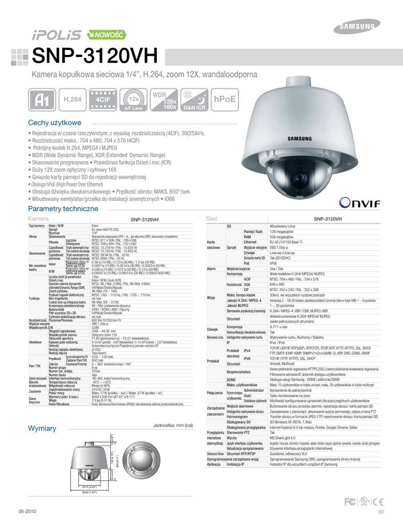 NOWOŚĆ SNP-3120VH Kamera kopułkowa sieciowa 1/4”, H.264, zoom 12X, wandaloodporna H.264 12x 4CIF 128x 160x hPoE D&N ICR Cechy użytkowe • Rejestracja w czasie rzeczywistym, z wysoką rozdzielczością (4CIF), 30(25)kl/s. • Rozdzielczość maks.: 704 x 480, 704 x 576 (4CIF) • Potrójny kodek H.264, MPEG4 i MJPEG • WDR (Wide Dynamic Range), XDR (Extended Dynamic Range) • Skanowanie progresywne • Prawdziwa funkcja Dzień i noc (ICR) • Duży 12X zoom optyczny i cyfrowy 16X • Gniazdo karty pamięci SD do rejestracji wewnętrznej • Obsługa hPoE (High Power Over Ethernet) • Obsługa dźwięku dwukierunkowego • Prędkość obrotu: MAKS. 650°/sek • Wbudowany wentylator/grzałka do instalacji zewnętrznych • IO66 Parametry techniczne Kamera Typ kamery Kolor / B/W Sprzęt Rozmiar Obraz Skanowanie Łącznie Piksele Efektywne Częstotliwość Tryb wewnętrzny pozioma Tryb zasilania sieciowego Skanowanie Częstotliwość Tryb wewnętrzny pionowa Tryb zasilania sieciowego Wyłączenie Sens-up (zwiększania czułości) Min. oświetlenie Kolor Sens-up 512x Wyłączenie Sens-up kadru (zwiększania czułości) B/W Sens-up 512x Liczba stref prywatności Dzień i noc Szeroki zakres dynamiki eXtended Dynamic Range (XDR) Zoom cyfrowy Prędkość migawki elektronicznej Funkcje Bez migotania Czułość sens-up (integracja kadru) Kompensacja oświetlenia tylnego Balans bieli Filtr szumów 2D+3D Cyfrowa stabilizacja obrazu Rozdzielczość Pozioma/Pionowa Wyjście wizyjne Współczynnik S/N Długość ogniskowej Współczynnik zoomu Stosunek apertury Obiektyw Kątowe pole widzenia Ostrość Rodzaj napędu obiektywu Rodzaj złącza Ręczne sterowanie Pan/Tilt Prędkość Zadane Pan/Tilt Zakres Panorama/Przechył Pan / Tilt Numer grupy Numer ust. wstęp. Numer śladu Zdalne sterowanie Interfejs komunikacyjny Warunki Temperatura robocza środowiskowe Wilgotność robocza Zapotrzebowanie mocy Zasilanie Pobór mocy Wymiary (szer. X wys.) Dane Waga fizyczne Kolor/Obudowa SNP-3120VH Kolor Ex-view HAD PS CCD 1/4" Skanowanie progresywne (VPS – wł._ (po włączeniu WDR, skanowanie z przeplotem) NTSC: 811 x 508 / PAL : 795 x 596 NTSC: 768 x 494 / PAL : 752 x 582 NTSC: 15,734 Hz / PAL : 15,625 Hz NTSC: 15,750 Hz / PAL : 15,625 Hz NTSC: 59.94 Hz / PAL : 50 Hz NTSC: 60Hz / PAL : 50 Hz 0.36 lx (15 IRE) / 0.72 lx (30 IRE) / 1.2 lux (50 IRE) 0.0007 lx (15 IRE) / 0.0014 lx (30 IRE) / 0.0023 lx (50 IRE) 0.036 lx (15 IRE) / 0.072 lx (30 IRE) / 0.12 lx (50 IRE) 0.00007 lx (15 IRE) / 0.00014 lx (30 IRE) / 0.00023 lx(50 IRE) 12ea Kolor / B/W / Auto (ICR) NTSC: Wł. / Wył. (128X) / PAL: Wł./Wył. (160X) Off/Niski/Średni/Wysoki Wł./Wył. (1X ~ 16X) NTSC: 1/60 ~ 1/10 ks. / PAL : 1/50 ~ 1/10 ks. wł./wył. Wł./Wył. (2X ~ 512X) Wł. / Wył. (ustawianie obszaru) ATW1 / ATW2 / AWC / Ręczny Off/Niski/Średni/Wysoki wł./wył. 600 linii TV/350 linii TV VBS 1.0Vp-p 52dB 3,69 ~ 44,32 mm Optyczny zoom 12X F1,65 (panoramiczny) ~ F2,01 (teleobiektyw) H: 54,44°(szeroki) ~ 4,64°(teleobiektyw) / V : 41,44°(szeroki) ~ 3,52°(teleobiektyw) Automatyczny/ręczny/Pojedynczy pomiar ostrości AF AI (DC) Typu board 0.05 ~ 120˚/sek 650˚/sek 0 ~ 360˚ (nieskończone) / 180˚ 6 ea 255ea 4ea RS-485, kabel koncentryczny -40˚C ~ +50˚C Mniej niż 90% 24 V AC, hPoE Maks. 17 W (grzałka – wył.) / Maks. 37 W (grzałka – wł.) Ø200 x 206 mm (Ø7.87" x 8.11") 2.5 kg (5.51 lb) Kość słoniowa/Aluminiowa (IP66)/ wbudowana osłona przeciwsłoneczna Jednostka: mm (cal) 122 (4.72") SNP-3120VH Wbudowany Linux SO 128 megabajtów Pamięć flash 256 megabajtów RAM RJ-45 (10/100 Base-T) Karta Ethernet sieciowa Sprzęt Wyjście wizyjne VBS 1.0Vp-p Linia we./Linia wy. Dźwięk Gniazdo karty SD Tak (SD/SDHC) hPoE PoE 2ea / 2ea Alarm Wejście/wyjście Wiele kodeków H.264/ MPEG4/ MJPEG Kompresja NTSC: 704 x 480 / PAL : 704 x 576 4CIF 640 x 480 Rozdzielczość VGA NTSC: 352 x 240 / PAL : 352 x 288 CIF 30kl/s. we wszystkich rozdzielczościach Maks. tempo klatek Wizja Jakość H.264 / MPEG-4 Kompresja: 5 ~ 100 (20 kroków), docelowa predkość transmisji (tylko w trybie CBR): 1 ~ 10 poziomów Jakość MJPEG 1 ~ 20 poziomów Sterowanie prędkością transmisji H.264 / MPEG-4: VBR / CBR, MJPEG: VBR Wielostrumieniowe H.264/ MPEG4/ MJPEG Strumień (wiele jednoczesnych strumieni) G.711 u-law Kompresja Dźwięk Komunikacja dwukierunkowa Tak Wykrywanie ruchu, Ruchomy / Stabilny Wykrywanie ruchu Inteligentne wykrywanie ruchu IPv4 / IPv6 IP TCP/IP, UDP/IP, RTP(UDP), RTP(TCP), RTSP, NTP, HTTP, HTTPS, SSL, DHCP, Protokół IPv4 FTP, SMTP, ICMP, IGMP, SNMPv1/v2c/v3(MIB-2), ARP, DNS, DDNS, ONVIF sieciowy TCP/IP, HTTP, HTTPS, SSL, DHCP IPv6 Protokół Unicast, Multicast Strumień Uwierzytelnianie logowania HTTPS (SSL) Uwierzytelnianie kodowane logowania Bezpieczeństwo Filtrowanie adresów IP, dziennik dostępu użytkowników Obsługa usługi Samsung - DDNS i piblicznej DDNS DDNS Maks. użytkowników Maks. 10 użytkowników w trybie unicast; maks. 20 użytkowników w trybie multicast Uprawnienia do pełnej kontroli Administrator Połączenie Poziom dostępu Tylko monitorowanie na żywo Gość użytkownika Dodatkowy użytkownik Możliwość konfigurowania uprawnień dla poszczególnych użytkowników Buforowanie obrazu przed/po alarmie, rejestracja obrazu: karta pamięci SD Zarządzanie Wejście alarmowe Inteligentne wykrywanie obrazu Zawiadamianie o zdarzeniach, aktywowanie wyjścia alarmowego, zadana zmiana PTZ zdarzeniami Harmonogram Transfer obrazu w formacie JPEG: FTP, rejestrowanie obrazu: Karta pamięci SD Obsługiwany SO SO Windows XP, VISTA, 7, Mac Obsługiwana przeglądarka Internet Explorer 6.0 lub nowszy, Firefox, Google Chrome, Safari Tak Przeglądarka Sterowanie PTZ MS SilverLight 4.0 internetowa Wtyczka Angielski, francuski, niemiecki, hiszpański, włoski, chiński, rosyjski, japoński, koreański, szwedzki, duński, portugalski (domyślna) Język interfejsu użytkownika Aktualizacja oprogramowania Używanie interfejsu przeglądarki