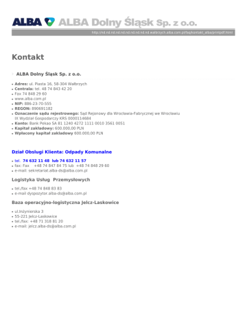http://nd.nd.nd.nd.nd.nd.nd.nd.nd.nd.walbrzych.alba.com.pl/faq/kontakt_alba/printpdf.html Kontakt ALBA Dolny Śląsk Sp. z o.o. ● ● ● ● ● ● ● ● ● ● Adres: ul. Piasta 16, 58-304 Wałbrzych Centrala: tel. 48 74 843 42 20 Fax 74 848 29 60 www.alba.com.pl NIP: 886-23-70-555 REGON: 890691182 Oznaczenie sądu rejestrowego: Sąd Rejonowy dla Wrocławia-Fabrycznej we Wrocławiu IX Wydział Gospodarczy KRS 0000114684 Konto: Bank Pekao SA 81 1240 4272 1111 0010 3561 0051 Kapitał zakładowy: 600.000,00 PLN Wpłacony kapitał zakladowy 600.000,00 PLN Dział Obslugi Klienta: Odpady Komunalne ● ● ● tel. 74 632 11 48 lub 74 632 11 57 fax: Fax +48 74 847 84 75 lub +48 74 848 29 60 e-mail: [email protected] Logistyka Usług Przemysłowych ● ● tel./fax +48 74 848 83 83 e-mail [email protected] Baza operacyjno-logistyczna Jelcz-Laskowice ● ● ● ● ul.Inżynierska 3 55-221 Jelcz-Laskowice tel./fax: +48 71 318 81 20 e-mail: [email protected]