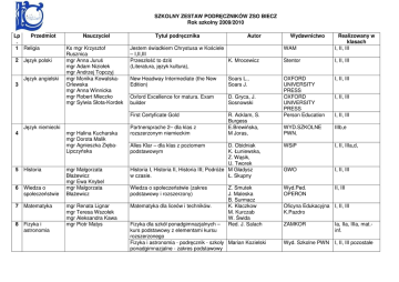 SZKOLNY ZESTAW PODRĘCZNIKÓW ZSO BIECZ Rok szkolny 2009/2010 Lp Przedmiot . 1 Religia 2 3 4 Język polski Język angielski Nauczyciel Ks mgr Krzysztof Rusznica mgr Anna Juruś mgr Adam Niziołek mgr Andrzej Topczyj mgr Monika KowalskaOrlewska mgr Anna Winnicka mgr Robert Mleczko mgr Sylwia Słota-Kordek Język niemiecki mgr Halina Kucharska mgr Dorota Malik mgr Agnieszka ZiębaLipczyńska 5 Historia 6 Wiedza o społeczeństwie 7 Matematyka 8 Fizyka i astronomia mgr Małgorzata Błażewicz mgr Ewa Knybel mgr Małgorzata Błażewicz mgr Renata Lignar mgr Teresa Wszołek mgr Aleksandra Kawa mgr Piotr Matys Tytuł podręcznika Jestem świadkiem Chrystusa w Kościele – I,II,III Przeszłość to dziś K. Mrocewicz (Literatura, język kultura), WAM Realizowany w klasach I, II, III Stentor I, II, III New Headway Intermediate (the New Edition) Soars L., Soars J. I, II, III Oxford Excellence for matura. Exam builder D. Gryca, J. Sosnowski First Certyficate Gold R. Acklam, S. Burgess E.Brewińska, M Joras, OXFORD UNIVERSITY PRESS OXFORD UNIVERSITY PRESS Person Education WYD.SZKOLNE PWN. IIIb,e WSiP I, II, IIIa,d, GWO I, II, III Wyd.Ped. OPERON II, III Partnersprache 2– dla klas z rozszerzonym niemieckim Autor Alles Klar – dla klas z poziomem podstawowym D. Obidniak K. Łuniewska, Z. Wąsik, U. Tworek Historia I, Historia II, Historia III; Podróże M Gładysz w czasie. Ł. Skupny Wiedza o społeczeństwie (zakres podstawowy i rozszerzony) Matematyka dla liceów i techników. Z. Smutek J. Maleska B. Surmacz K. Kłaczkow M. Kurczab W. Świda Red. J. Salach Fizyka dla szkół ponadgimnazjalnych – kurs podstawowy z elementami kursu rozszerzonego Fizyka i astronomia - podręcznik - szkoły Marian Kozielski ponadgimnazjalne - zakres podstawowy Wydawnictwo I, II, III I, II, III Oficyna Edukacyjna I, II, III K.Pazdro ZAMKOR Ia, IIa, IIIa, mat.inf. Wyd. Szkolne PWN I, II, III pozostałe 9 Chemia mgr Jolanta Szymczyk Chemia (zakres podstawowy) M. Poźniczek Z. Kluz, WsiP I,IIacd, IIIacde Chemia (zakres rozszerzony) M. Poźniczek Z. Kluz W. Lewiński G. Skirmunt J. Prokop P. Czubla E. Papińska B. Lenartowicz E. Wilczyńska M. Wójcik Z. Makieła T. Rachwał ZAMKOR IIb, IIIb Wyd. OPERON I, II, III Wydawnictwo Szkolne PWN Wydawnictwo Szkolne PWN Id NOWA ERA I, II G. Koba Migra I,II G. Koba Migra I,II,III Bogusława Breitkopf, Mirosław Marciniak, Zbigniew Worwa WSiP I,II 10 Biologia mgr Jadwiga Kuzak Biologia, 11 Geografia mgr Anna Szurek Geografia fizyczna zakres rozszerzony Geografia na czasie cz. 1 Geografia fizyczna świata i Polski 12 Podstawy mgr Grażyna Dranka przedsiębiorczoś ci 13 Technologia informacyjna 14 Informatyka mgr Tomasz Dykas mgr Krzysztof Rogowski mgr Aleksandra Kawa mgr Krzysztof Rogowski 15 Przysposobienie mgr Maciej Ławrowski obronne Podstawy przedsiębiorczości. Podręcznik dla liceum ogólnokształcącego, liceum profilowanego i technikum Technologia informacyjna dla szkół ponadgimnazjalnych Informatyka dla liceum ogólnokształcącego Przysposobienie obronne Ia,b,c