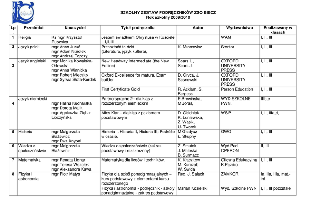 Szkolny zestaw podręczników 2009/2010