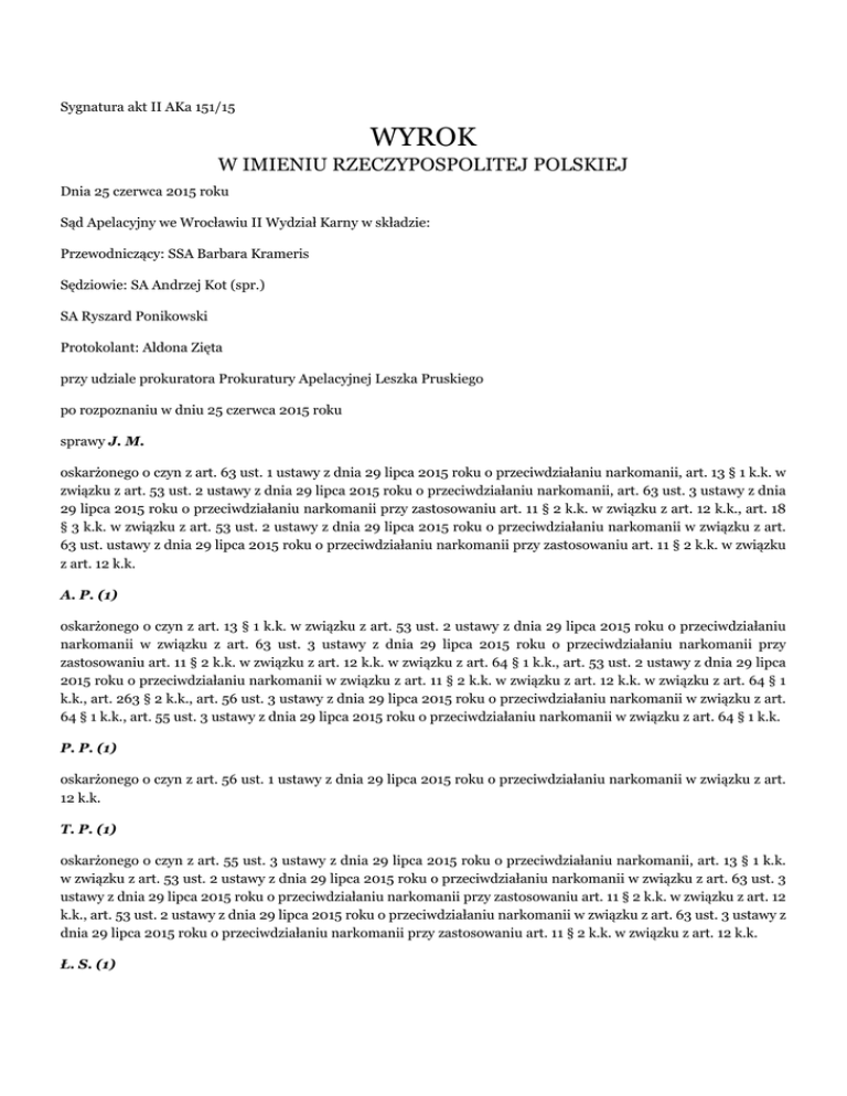 Sygnatura akt II AKa 151/15 WYROK W IMIENIU RZECZYPOSPOLITEJ POLSKIEJ Dnia 25 czerwca 2015 roku Sąd Apelacyjny we Wrocławiu II Wydział Karny w składzie: Przewodniczący: SSA Barbara Krameris Sędziowie: SA Andrzej Kot (spr.) SA Ryszard Ponikowski Protokolant: Aldona Zięta przy udziale prokuratora Prokuratury Apelacyjnej Leszka Pruskiego po rozpoznaniu w dniu 25 czerwca 2015 roku sprawy J. M. oskarżonego o czyn z art. 63 ust. 1 ustawy z dnia 29 lipca 2015 roku o przeciwdziałaniu narkomanii, art. 13 § 1 k.k. w związku z art. 53 ust. 2 ustawy z dnia 29 lipca 2015 roku o przeciwdziałaniu narkomanii, art. 63 ust. 3 ustawy z dnia 29 lipca 2015 roku o przeciwdziałaniu narkomanii przy zastosowaniu art. 11 § 2 k.k. w związku z art. 12 k.k., art. 18 § 3 k.k. w związku z art. 53 ust. 2 ustawy z dnia 29 lipca 2015 roku o przeciwdziałaniu narkomanii w związku z art. 63 ust. ustawy z dnia 29 lipca 2015 roku o przeciwdziałaniu narkomanii przy zastosowaniu art. 11 § 2 k.k. w związku z art. 12 k.k. A. P. (1) oskarżonego o czyn z art. 13 § 1 k.k. w związku z art. 53 ust. 2 ustawy z dnia 29 lipca 2015 roku o przeciwdziałaniu narkomanii w związku z art. 63 ust. 3 ustawy z dnia 29 lipca 2015 roku o przeciwdziałaniu narkomanii przy zastosowaniu art. 11 § 2 k.k. w związku z art. 12 k.k. w związku z art. 64 § 1 k.k., art. 53 ust. 2 ustawy z dnia 29 lipca 2015 roku o przeciwdziałaniu narkomanii w związku z art. 11 § 2 k.k. w związku z art. 12 k.k. w związku z art. 64 § 1 k.k., art. 263 § 2 k.k., art. 56 ust. 3 ustawy z dnia 29 lipca 2015 roku o przeciwdziałaniu narkomanii w związku z art. 64 § 1 k.k., art. 55 ust. 3 ustawy z dnia 29 lipca 2015 roku o przeciwdziałaniu narkomanii w związku z art. 64 § 1 k.k. P. P. (1) oskarżonego o czyn z art. 56 ust. 1 ustawy z dnia 29 lipca 2015 roku o przeciwdziałaniu narkomanii w związku z art. 12 k.k. T. P. (1) oskarżonego o czyn z art. 55 ust. 3 ustawy z dnia 29 lipca 2015 roku o przeciwdziałaniu narkomanii, art. 13 § 1 k.k. w związku z art. 53 ust. 2 ustawy z dnia 29 lipca 2015 roku o przeciwdziałaniu narkomanii w związku z art. 63 ust. 3 ustawy z dnia 29 lipca 2015 roku o przeciwdziałaniu narkomanii przy zastosowaniu art. 11 § 2 k.k. w związku z art. 12 k.k., art. 53 ust. 2 ustawy z dnia 29 lipca 2015 roku o przeciwdziałaniu narkomanii w związku z art. 63 ust. 3 ustawy z dnia 29 lipca 2015 roku o przeciwdziałaniu narkomanii przy zastosowaniu art. 11 § 2 k.k. w związku z art. 12 k.k. Ł. S. (1) oskarżonego o czyn z art. 13 § 1 k.k. w związku z art. 53 ust. 2 ustawy z dnia 29 lipca 2015 roku o przeciwdziałaniu narkomanii w związku z art. 63 ust. 3 ustawy z dnia 29 lipca 2015 roku o przeciwdziałaniu narkomanii przy zastosowaniu art. 11 § 2 k.k. w związku z art. 12 k.k., art. 62 ust. 2 ustawy z dnia 29 lipca 2015 roku o przeciwdziałaniu narkomanii J. W. oskarżonego o czyn z art. 53 ust. 2 ustawy z dnia 29 lipca 2015 roku o przeciwdziałaniu narkomanii w związku z art. 63 ust. 3 ustawy z dnia 29 lipca 2015 roku o przeciwdziałaniu narkomanii przy zastosowaniu art. 11 § 2 k.k. w związku z art. 12 k.k., art. 55 ust. 3 ustawy z dnia 29 lipca 2015 roku o przeciwdziałaniu narkomanii na skutek apelacji wniesionych przez wszystkich oskarżonych oraz apelacji prokuratora w stosunku do oskarżonego J. W. od wyroku Sądu Okręgowego w Opolu z dnia 28 stycznia 2015 roku, sygn. akt III K 85/13 I. zmienia zaskarżony wyrok wobec oskarżonego J. M. w ten sposób, że: - z opisu czynu przypisanego w punkcie II części rozstrzygającej eliminuje ustalenie o usiłowaniu wytworzenia środka odurzającego, czyn ten kwalifikuje jako przestępstwo z art. 63 ust. 3 ustawy z dnia 29 lipca 2005r. o przeciwdziałaniu narkomanii i przepis ten przyjmuje za podstawę wymierzonej oskarżonemu kary pozbawienia wolności, zaś za podstawę wymiaru kary grzywny przyjmuje przepis art. 33 § 2 k.k., - na podstawie art. 69 § 1 k.k. i art. 70 § 1 pkt 1 k.k. warunkowo zawiesza wykonanie wymierzonej kary łącznej pozbawienia wolności na okres próby 5(pięć) lat, - na podstawie art. 63 § 1 k.k. na poczet wymierzonej kary łącznej grzywny zalicza oskarżonemu okres tymczasowego aresztowania od 4 czerwca 2012r. do 17 sierpnia 2012r., przyjmując, że jeden dzień pozbawienia wolności równa się dwóm dziennym stawkom grzywny; II. w pozostałej części zaskarżony wyrok wobec oskarżonego J. M. utrzymuje w mocy; III. utrzymuje w mocy zaskarżony wyrok wobec oskarżonego A. P. (1) i J. W.; IV. zmienia zaskarżony wyrok wobec oskarżonego P. P. (1) w ten sposób, że: -przyjmuje, że przypisanego w punkcie XV części rozstrzygającej czynu oskarżony dopuścił się od lutego 2012r. do 3 czerwca 2012r, -obniża orzeczoną wobec oskarżonego grzywnę do 70 (siedemdziesiąt) stawek dziennych, ustalając wysokość jednej stawki na 80(osiemdziesiąt) złotych; V. w pozostałej części zaskarżony wyrok wobec oskarżonego P. P. (1) utrzymuje w mocy; VI. zmienia zaskarżony wyrok wobec oskarżonego T. P. (1) w ten sposób, że obniża wymierzoną mu karę łączną grzywny do 200 (dwustu) stawek dziennych po 100 (sto) złotych każda; VII. w pozostałej części zaskarżony wyrok wobec oskarżonego T. P. (1) utrzymuje w mocy; VIII. zmienia zaskarżony wyrok wobec oskarżonego Ł. S. (1) w ten sposób, że: - z opisu czynów przypisanych w punkcie XXIV części rozstrzygającej eliminuje ustalenie o usiłowaniu wytworzenia środka odurzającego, czyny te kwalifikuje jako przestępstwa z art. 63 ust. 3 ustawy z dnia 29 lipca 2005r. o przeciwdziałaniu narkomanii i przepis ten w zw. z art. 91 § 1 k.k. przyjmuje za podstawę wymierzonej oskarżonemu kary pozbawienia wolności, zaś za podstawę wymiaru kary grzywny przyjmuje przepis art. 33 § 2 k.k., - na podstawie art. 69 § 1 k.k. i art. 70 § 1 pkt 1 k.k. warunkowo zawiesza wykonanie wymierzonej kary łącznej pozbawienia wolności na okres próby 5(pięć) lat, - na podstawie art. 63 § 