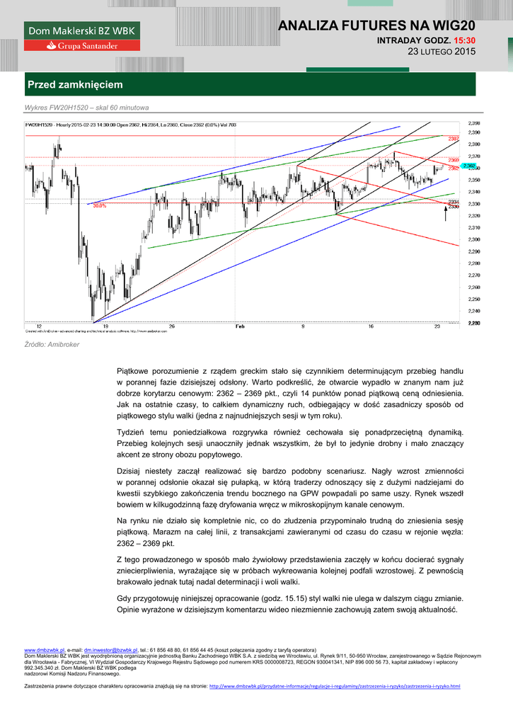 ANALIZA FUTURES NA WIG20 INTRADAY GODZ. 15:30 23 LUTEGO 2015 Przed zamknięciem Wykres FW20H1520 – skal 60 minutowa Źródło: Amibroker Piątkowe porozumienie z rządem greckim stało się czynnikiem determinującym przebieg handlu w porannej fazie dzisiejszej odsłony. Warto podkreślić, że otwarcie wypadło w znanym nam już dobrze korytarzu cenowym: 2362 – 2369 pkt., czyli 14 punktów ponad piątkową ceną odniesienia. Jak na ostatnie czasy, to całkiem dynamiczny ruch, odbiegający w dość zasadniczy sposób od piątkowego stylu walki (jedna z najnudniejszych sesji w tym roku). Tydzień temu poniedziałkowa rozgrywka również cechowała się ponadprzeciętną dynamiką. Przebieg kolejnych sesji unaoczniły jednak wszystkim, że był to jedynie drobny i mało znaczący akcent ze strony obozu popytowego. Dzisiaj niestety zaczął realizować się bardzo podobny scenariusz. Nagły wzrost zmienności w porannej odsłonie okazał się pułapką, w którą traderzy odnoszący się z dużymi nadziejami do kwestii szybkiego zakończenia trendu bocznego na GPW powpadali po same uszy. Rynek wszedł bowiem w kilkugodzinną fazę dryfowania wręcz w mikroskopijnym kanale cenowym. Na rynku nie działo się kompletnie nic, co do złudzenia przypominało trudną do zniesienia sesję piątkową. Marazm na całej linii, z transakcjami zawieranymi od czasu do czasu w rejonie węzła: 2362 – 2369 pkt. Z tego prowadzonego w sposób mało żywiołowy przedstawienia zaczęły w końcu docierać sygnały zniecierpliwienia, wyrażające się w próbach wykreowania kolejnej podfali wzrostowej. Z pewnością brakowało jednak tutaj nadal determinacji i woli walki. Gdy przygotowuję niniejszej opracowanie (godz. 15.15) styl walki nie ulega w dalszym ciągu zmianie. Opinie wyrażone w dzisiejszym komentarzu wideo niezmiennie zachowują zatem swoją aktualność. www.dmbzwbk.pl, e-mail: [email protected], tel.: 61 856 48 80, 61 856 44 45 (koszt połączenia zgodny z taryfą operatora) Dom Maklerski BZ WBK jest wyodrębnioną organizacyjnie jednostką Banku Zachodniego WBK S.A. z siedzibą we Wrocławiu, ul. Rynek 9/11, 50-950 Wrocław, zarejestrowanego w Sądzie Rejonowym dla Wrocławia - Fabrycznej, VI Wydział Gospodarczy Krajowego Rejestru Sądowego pod numerem KRS 0000008723, REGON 930041341, NIP 896 000 56 73, kapitał zakładowy i wpłacony 992.345.340 zł. Dom Maklerski BZ WBK podlega nadzorowi Komisji Nadzoru Finansowego. Zastrzeżenia prawne dotyczące charakteru opracowania znajdują się na stronie: http://www.dmbzwbk.pl/przydatne-informacje/regulacje-i-regulaminy/zastrzezenia-i-ryzyko/zastrzezenia-i-ryzyko.html Paweł Danielewicz Analityk techniczny DM BZWBK [email protected] WIG20, DAX, S&P500 I KONTRAKTY INTRADAY GODZ. 12:00 23 LUTEGO 2015 WIG20 – skala dzienna DAX – skala dzienna www.dmbzwbk.pl, e-mail: [email protected], tel.: 61 856 48 80, 61 856 44 45 (koszt połączenia zgodny z taryfą operatora) Dom Maklerski BZ WBK jest wyodrębnioną organizacyjnie jednostką Banku Zachodniego WBK S.A. z siedzibą we Wrocławiu, ul. Rynek 9/11, 50-950 Wrocław, zarejestrowanego w Sądzie Rejonowym dla Wrocławia - Fabrycznej, VI Wydział Gospodarczy Krajowego Rejestru Sądowego pod numerem KRS 0000008723, REGON 930041341, NIP 896 000 56 73, kapitał zakładowy i wpłacony 992.345.340 zł. Dom Maklerski BZ WBK podlega nadzorowi Komisji Nadzoru Finansowego. Zastrzeżenia prawne dotyczące charakteru opracowania znajdują się na stronie: http://www.dmbzwbk.pl/przydatne-informacje/regulacje-i-regulaminy/zastrzezenia-i-ryzyko/zastrzezenia-i-ryzyko.html S&P500 – skala dzienna FW20H1520 – skala 60 minutowa FUSDH15 – skala dzienna Komentarz do zamieszczonych wykresów w wersji wideo ukaże się około godz. 13.15 Paweł Danielewicz Analityk techniczny DM BZWBK [email protected] ANALIZA FUTURES NA WIG20 INTRADAY GODZ. 09:30 23 LUTEGO 2015 Kolejny test węzła podażowego Wykres FW20H1520 – skal 60 minutowa Źródło: Amibroker Relatywnie mocny początek z reakcją podaży w tle. W dość klasyczny sposób układają się zatem pierwsze minuty poniedziałkowego handlu. Niemniej jednak warto odnotować fakt związany z kolejnym testem zapory podażowej: 2362 – 2369 pkt., gdzie jak widać obóz niedźwiedzi nadal stara się w dość aktywny sposób inicjować działania obronne. Ich skuteczność zostałaby jednak potwierdzona dopiero w momencie zanegowania węzła popytowego: 2330 – 2334 pkt. Uwzględniając przebieg porannej fazy handlu zmieniłem w niewielkim stopniu położenie tzw. pierwszej zapory popytowej Fibonacciego. Ponieważ we wskazanym korytarzu cenowym wypadają obecnie projekcje potencjalnego, symetrycznego układu ABCD (dodatkowo przebiega także Median Line), strefa niejako z założenia cechuje się większym poziomem wiarygodności. Tak więc przedział cenowy: 2330 – 2334 pkt. to stosunkowo silne, intradayowe wsparcie techniczne. Negacja węzła byłaby zatem obrazem słabego i defensywnie usposobionego do handlu popytu, co koniec końców mogłoby znaleźć swoje odzwierciedlenie w postaci kontynuacji tendencji spadkowej. Na razie jednak kontrakty utrzymują się w rejonie oporu: 2362 – 2369 pkt. Niewielką przewagę techniczną zachowuje zatem obóz byków, choć jeśli również dzisiejsza próba sforsowania węzła podażowego zakończy się niepowodzeniem, niedźwiedzie zaczną prawdopodobnie wykazywać się większą aktywnością. Paweł Danielewicz Analityk techniczny DM BZWBK [email protected] www.dmbzwbk.pl, e-mail: [email protected], tel.: 61 856 48 80, 61 856 44 45 (koszt połączenia zgodny z taryfą operatora) Dom Maklerski BZ WBK jest wyodrębnioną organizacyjnie jednostką Banku Zachodniego WBK S.A. z siedzibą we Wrocławiu, ul. Rynek 9/11, 50-950 Wrocław, zarejestrowanego w Sądzie Rejonowym dla Wrocławia - Fabrycznej, VI Wydział Gospodarczy Krajowego Rejestru Sądowego pod numerem KRS 0000008723, REGON 930041341, NIP 896 000 56 73, kapitał z