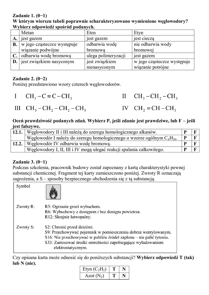 Zadanie 1. (0−1) W którym wierszu tabeli poprawnie scharakteryzowano wymienione węglowodory? Wybierz odpowiedź spośród podanych. Metan Eten Etyn jest gazem jest cieczą A. jest gazem odbarwia wodę nie odbarwia wody B. w jego cząsteczce występuje wiązanie podwójne bromową bromowej ulega polimeryzacji jest gazem C. odbarwia wodę bromową jest związkiem w jego cząsteczce występuje D. jest związkiem nasyconym nienasyconym wiązanie potrójne Zadanie 2. (0−2) Poniżej przedstawiono wzory czterech węglowodorów. Oceń prawdziwość podanych zdań. Wybierz P, jeśli zdanie jest prawdziwe, lub F jest fałszywe. 12.1. Węglowodory II i III należą do szeregu homologicznego alkanów. Węglowodór I należy do szeregu homologicznego o wzorze ogólnym C nH2n. 12.2. Węglowodór IV odbarwia wodę bromową. Węglowodory I, II, III i IV mogą ulegać reakcji spalania całkowitego. – jeśli P P P P F F F F Zadanie 3. (0−1) Podczas szkolenia, pracownik budowy został zapoznany z kartą charakterystyki pewnej substancji chemicznej. Fragment tej karty zamieszczono poniżej. Zwroty R oznaczają zagrożenia, a S – sposoby bezpiecznego obchodzenia się z tą substancją. Czy opisana karta może odnosić się do poniższych substancji? Wybierz odpowiedź T (tak) lub N (nie). Etyn (C2H2) T N Azot (N2) T N Zadanie 4. (0−1) Do trzech probówek, zawierających po 1 cm3 wody bromowej, wprowadzono: metan eten etyn Braq Braq probówka I probówka II Braq probówka III . Probówki zakorkowano i lekko wstrząśnięto. Oceń prawdziwość obserwacji i wniosku. Wybierz P, jeśli informacja jest prawdziwa, lub F – jeśli jest fałszywa. Odbarwienie wody bromowej nastąpiło tylko w probówce I. P Eten i etyn są węglowodorami nienasyconymi i przyłączają cząsteczkowy brom. P Zadanie 5. (0−1) Uzupełnij poniższe zdania, zaznaczając odpowiedzi wybrane spośród A–H w taki sposób, aby zdania były prawdziwe. 1. Metan należy do węglowodorów A /B. 2. C / D są węglowodorami nasyconymi. 3. W cząsteczkach alkinów znajduje się jedno wiązanie E / F. 4. Węglowodory, które w swojej cząsteczce zawierają wiązanie podwójne lub potrójne, G / H manganianu(VII) potasu. A. nasyconych C. Alkany E. podwójne G. odbarwiają roztwór B. nienasyconych D. Alkeny F. potrójne H. nie odbarwiają roztworu Zadanie 6. (0−1) Które zdanie dotyczące węglowodorów jest prawdziwe? Wybierz odpowiedź spośród podanych. A. Etan należy do szeregu homologicznego alkanów. B. Cząsteczka etenu zawiera jedno wiązanie potrójne. C. Etyn spala się całkowicie do tlenku węgla(II) i wody. D. Etyn reaguje z wodą bromową, powodując wytrącenie osadu F F Zadanie 7. (0–1) Poniżej przedstawiono wzory sumaryczne, strukturalne i półstrukturalne węglowodorów. Wybierz zestaw zawierający tylko węglowodory nienasycone Zadanie 8. (0-1) Pojemniki na żywność, butelki do napojów gazowanych, torebki foliowe wykonane są z polietenu. Otrzymuje się go w procesie polimeryzacji, czyli łączenia się pojedynczych cząsteczek (monomerów) w związek wielkocząsteczkowy (polimer). Wzór polietenu: Węglowodór, z którego otrzymuje się polieten, ma wzór: Zadanie 9. (0-1) Który rysunek przedstawia wzór strukturalny węglowodoru nasyconego? Rysunek 1. Rysunek 2. A. Rysunek 1. i rysunek 2. C. Rysunek 3. i rysunek 4. Rysunek 3. Rysunek 4. B. Tylko rysunek 2. D. Tylko rysunek 4. Informacje do zadań 10. i 11. Wykres przedstawia zależność temperatury wrzenia węglowodorów nasyconych od liczby atomów węgla w ich cząsteczkach. Źródło: K.M. Pazdro, Repetytorium z chemii, Warszawa 2001. Zadanie 10. (0-1) Który węglowodór wrze w temperaturze wyższej niż –100ºC, a niższej niż –50ºC? A. CH4 B. C2H6 C. C4H10 D. C6H14 Zadanie 11. (0-1) Z wykresu wynika, że temperatura wrzenia węglowodoru nasyconego: A. rośnie coraz szybciej w miarę wzrostu liczby atomów węgla w jego cząsteczce. B. rośnie coraz wolniej w miarę wzrostu liczby atomów węgla w jego cząsteczce. C. zmienia się wprost proporcjonalnie do liczby atomów węgla w jego cząsteczce. D. zmienia się odwrotnie proporcjonalnie do liczby atomów węgla w jego cząsteczce. Zadanie 12. (0 – 4) Mamy dany chemograf: 12.1 Równanie reakcji nr 4 to: A. Polimeryzacja. B. Spalanie całkowite C. Spalanie niecałkowite D. Nasycanie 12.2 Związki chemiczne występujące w równaniach 1 i 2 to kolejno: A. Karbid, etan, chloroeten, B. Karbid, etan, dichloroetan C. Węglik wapnia, etyn, dichloroeten, d. Węglik wapnia, eten, etan Zadanie 13. (0-1) Dojrzewanie zielonych pomidorów przechowywanych w pomieszczeniach można przyspieszyć stosując eten (C2H4). Jest to związek chemiczny zaliczany do A. kwasów karboksylowych. B. węglowodorów nasyconych. C. węglowodorów nienasyconych. D. alkoholi jednowodorotlenowych. Zadanie 14. (0-1) Wskaż wzory sumaryczne produktów reakcji spalania całkowitego etanu. A. CO, H2O B. CO2, H2 C. CO, H2 D. CO2, H2O Zadanie 15. (0-1) Wskaż zestaw zawierający wyłącznie wzory sumaryczne węglowodorów nasyconych. A. C2H6, CH4 B. C2H6, C2H4 C. C2H2, CH4 D. CH4, C2H4 Zadanie 16. (0-1) Wybierz zestaw odpowiadający liczbom atomów węgla w cząsteczkach etynu, butenu i heksanu. A. 2, 4, 6 B. 1, 2, 6 C. 2, 3, 7 D. 3, 4, 6 Zadanie 17. (0-1) Wybierz dokończenia zdań, tak aby powstały informacje prawdziwe. Propen to związek chemiczny o wzorze sumarycznym A. C3H8. B. C3H6. C. C3H4. D. C4H8. Propen należy do węglowodorów nienasyconych, dlatego A. odbarwia wodę bromową. C. dodanie go do wody bromowej pogłębia jej barwę. B. częściowo odbarwia wodę bromową. D. nie odbarwia wody bromowej. Zadanie 18. (0–1) Wskaż równanie reakcji chemicznej, w którym jednym z produktów jest czad powstający podczas spalania głównego składnika gazu ziemnego. A. C3H8 + 2 O2 → 3 C + 4 H2O B. 2 CH4 + 4 O2 → 2 CO2 + 4 H2O C. 2 C2H6 + 5 O2 → 4 CO + 6 H2O D. 2 C2H6 + 3 O2 → 4 C + 6 H2O Zadanie 19. (0–1) Wyzna
