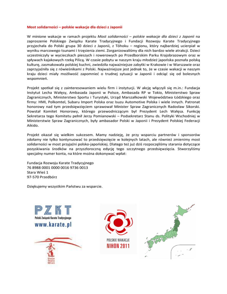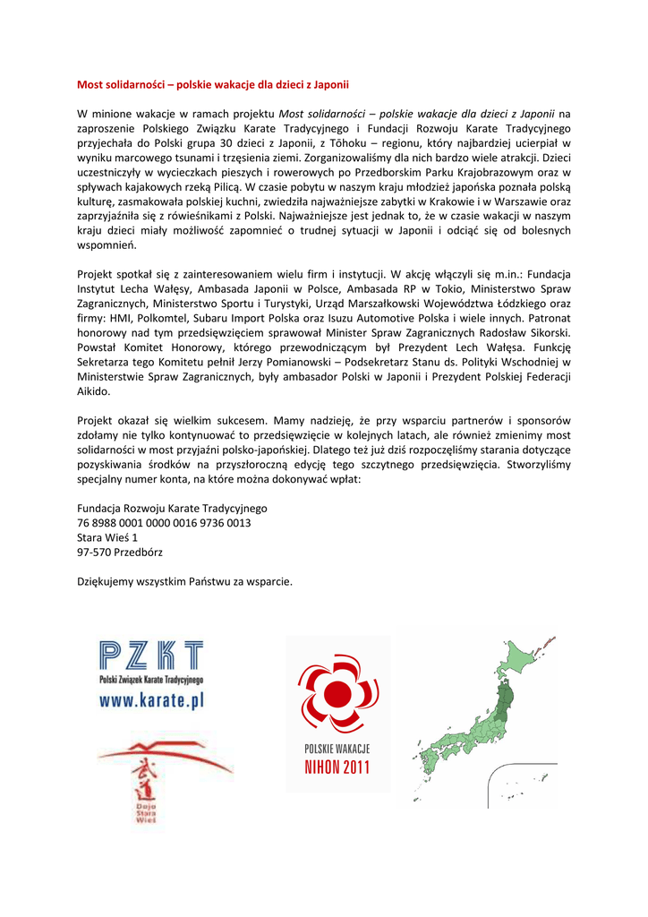 Most solidarności – polskie wakacje dla dzieci z Japonii W minione wakacje w ramach projektu Most solidarności – polskie wakacje dla dzieci z Japonii na zaproszenie Polskiego Związku Karate Tradycyjnego i Fundacji Rozwoju Karate Tradycyjnego przyjechała do Polski grupa 30 dzieci z Japonii, z Tōhoku – regionu, który najbardziej ucierpiał w wyniku marcowego tsunami i trzęsienia ziemi. Zorganizowaliśmy dla nich bardzo wiele atrakcji. Dzieci uczestniczyły w wycieczkach pieszych i rowerowych po Przedborskim Parku Krajobrazowym oraz w spływach kajakowych rzeką Pilicą. W czasie pobytu w naszym kraju młodzież japońska poznała polską kulturę, zasmakowała polskiej kuchni, zwiedziła najważniejsze zabytki w Krakowie i w Warszawie oraz zaprzyjaźniła się z rówieśnikami z Polski. Najważniejsze jest jednak to, że w czasie wakacji w naszym kraju dzieci miały możliwość zapomnieć o trudnej sytuacji w Japonii i odciąć się od bolesnych wspomnień. Projekt spotkał się z zainteresowaniem wielu firm i instytucji. W akcję włączyli się m.in.: Fundacja Instytut Lecha Wałęsy, Ambasada Japonii w Polsce, Ambasada RP w Tokio, Ministerstwo Spraw Zagranicznych, Ministerstwo Sportu i Turystyki, Urząd Marszałkowski Województwa Łódzkiego oraz firmy: HMI, Polkomtel, Subaru Import Polska oraz Isuzu Automotive Polska i wiele innych. Patronat honorowy nad tym przedsięwzięciem sprawował Minister Spraw Zagranicznych Radosław Sikorski. Powstał Komitet Honorowy, którego przewodniczącym był Prezydent Lech Wałęsa. Funkcję Sekretarza tego Komitetu pełnił Jerzy Pomianowski – Podsekretarz Stanu ds. Polityki Wschodniej w Ministerstwie Spraw Zagranicznych, były ambasador Polski w Japonii i Prezydent Polskiej Federacji Aikido. Projekt okazał się wielkim sukcesem. Mamy nadzieję, że przy wsparciu partnerów i sponsorów zdołamy nie tylko kontynuować to przedsięwzięcie w kolejnych latach, ale również zmienimy most solidarności w most przyjaźni polsko-japońskiej. Dlatego też już dziś rozpoczęliśmy starania dotyczące pozyskiwania środków na przyszłoroczną edycję tego szczytnego przedsięwzięcia. Stworzyliśmy specjalny numer konta, na które można dokonywać wpłat: Fundacja Rozwoju Karate Tradycyjnego 76 8988 0001 0000 0016 9736 0013 Stara Wieś 1 97-570 Przedbórz Dziękujemy wszystkim Państwu za wsparcie. Japońskie dzieci w Pałacu Prezydenckim w czasie spotkania z Pierwszą Damą Anną Komorowską. źródło: MSZ RP